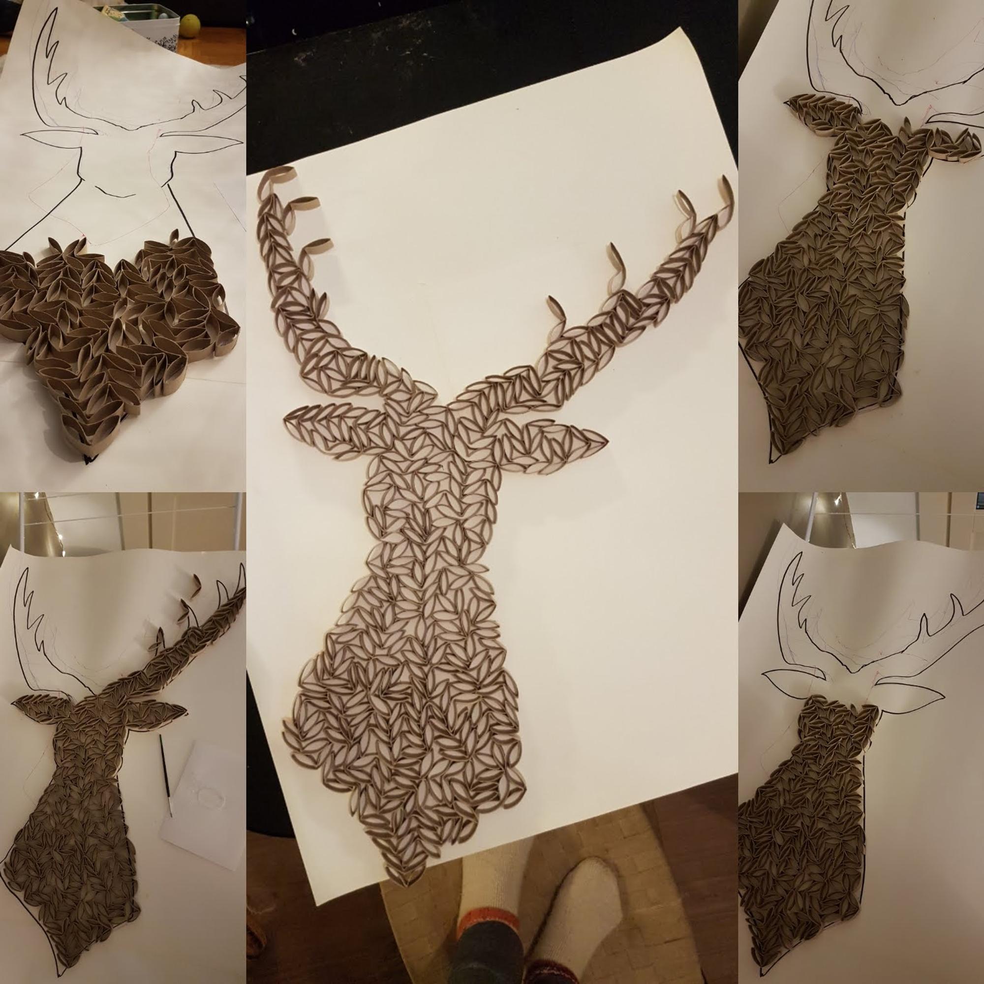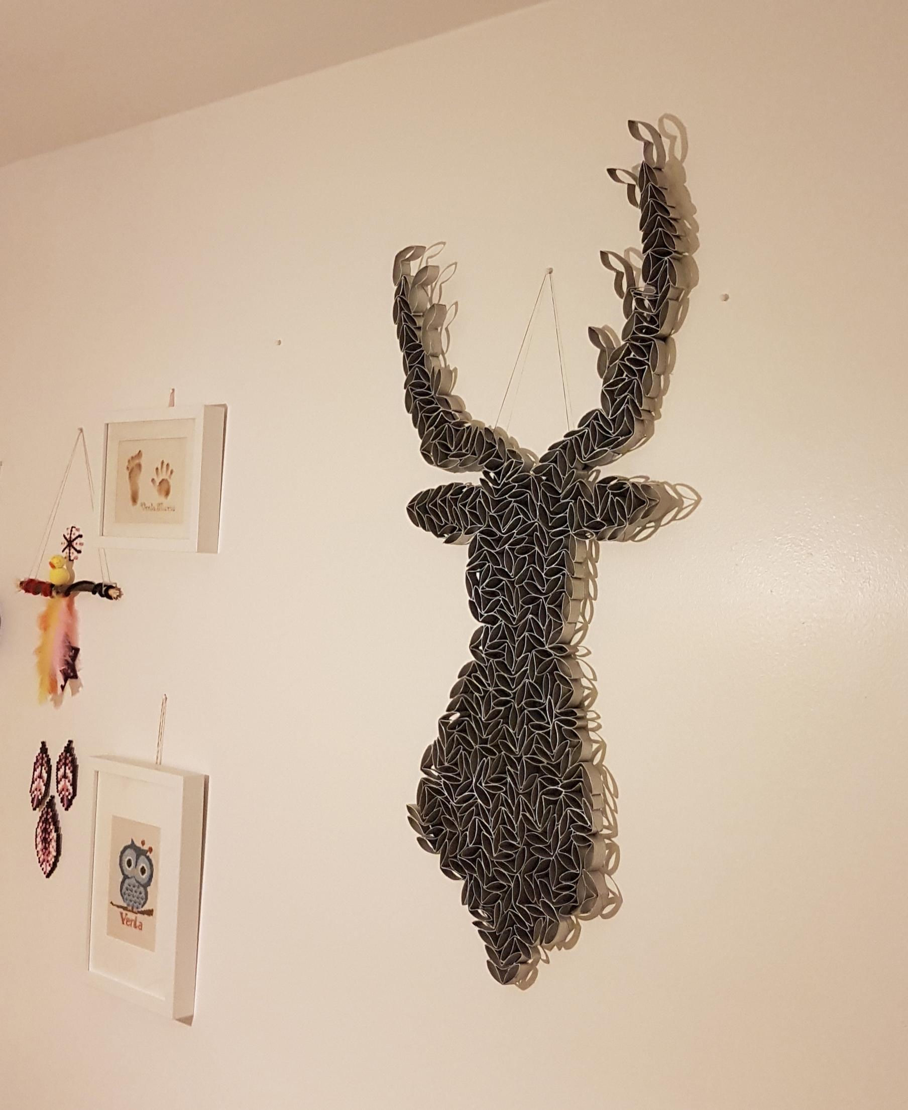 Halusin kierrättää pahvihylsyt jotenkin, ja aloin kehitellä ideaa hieman mahtipontisemmasta ja ajattomammasta koristeesta. Lopulta keksin, että peuranpään voisi ripustaa koristeeksi seinälle.