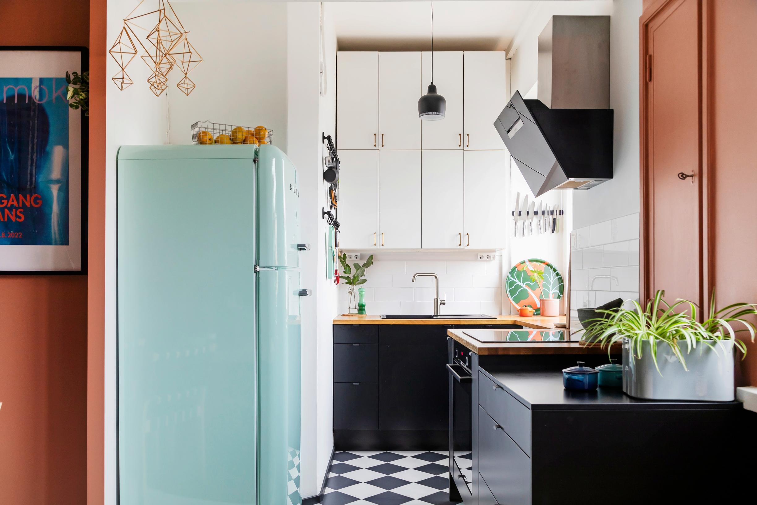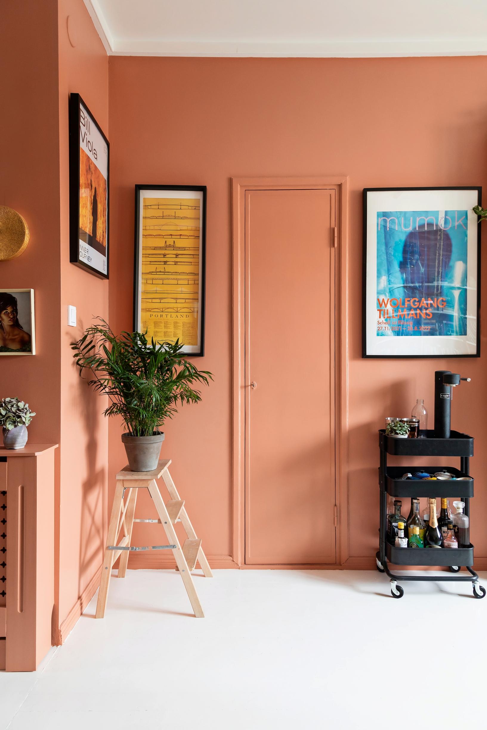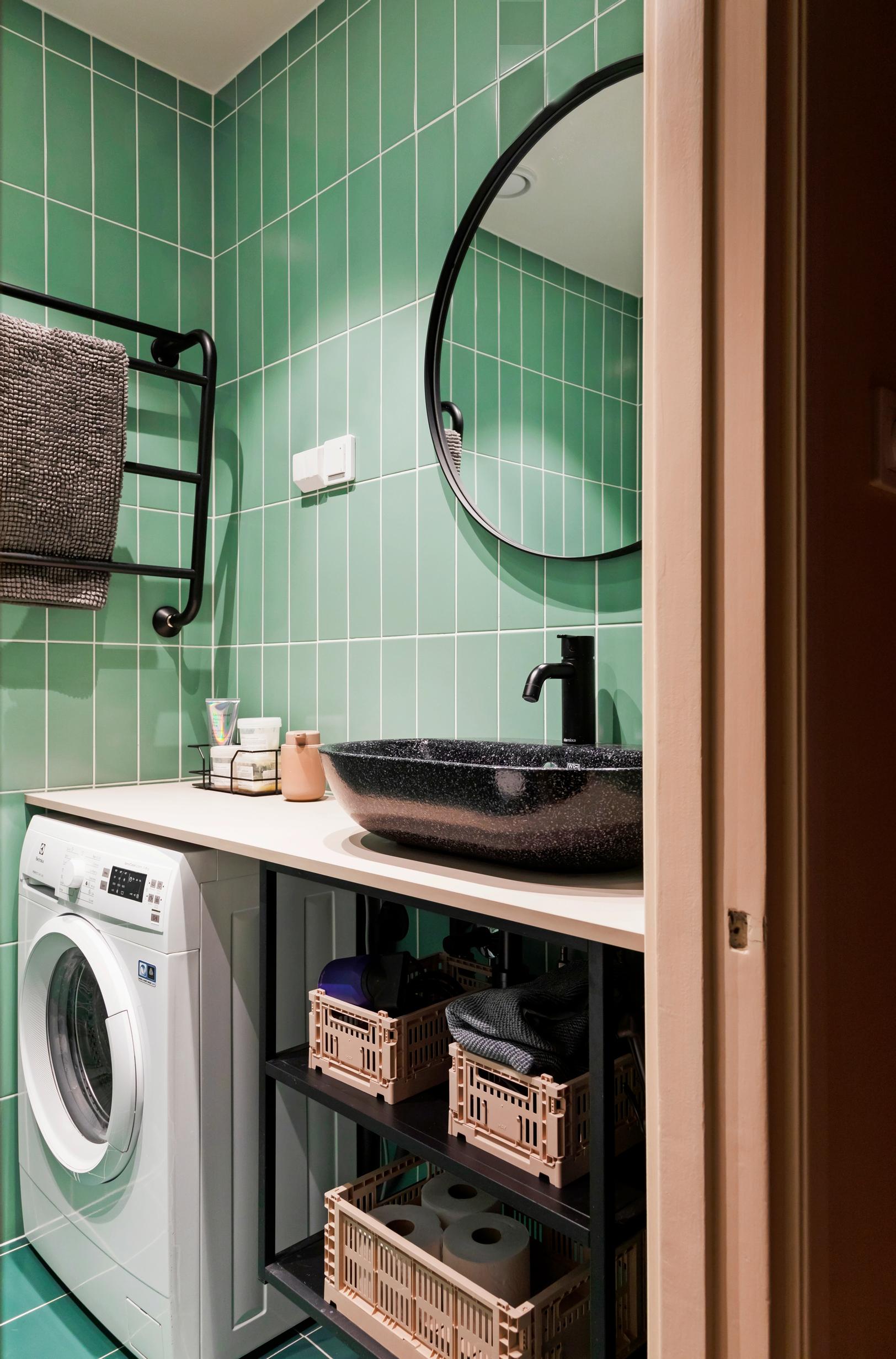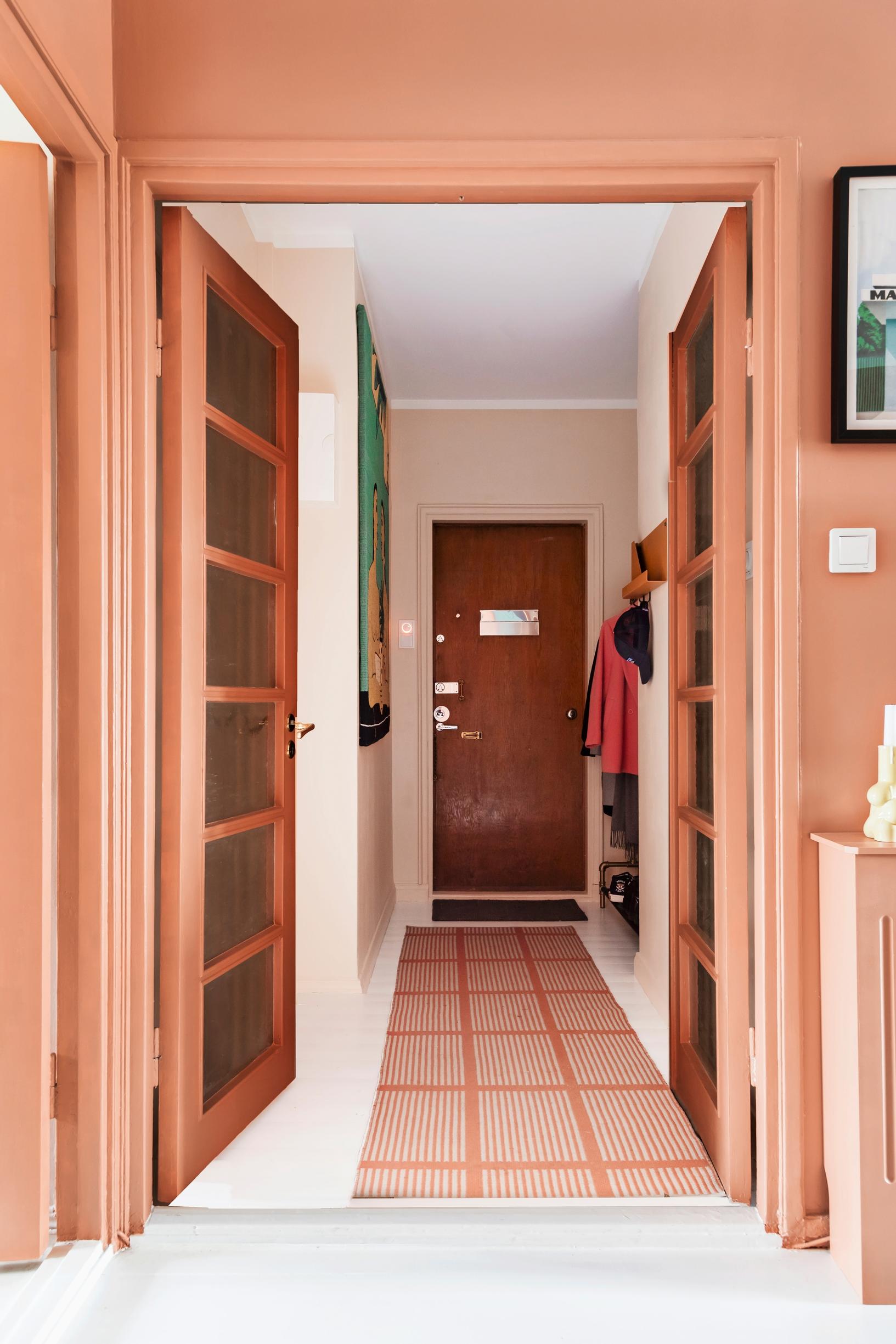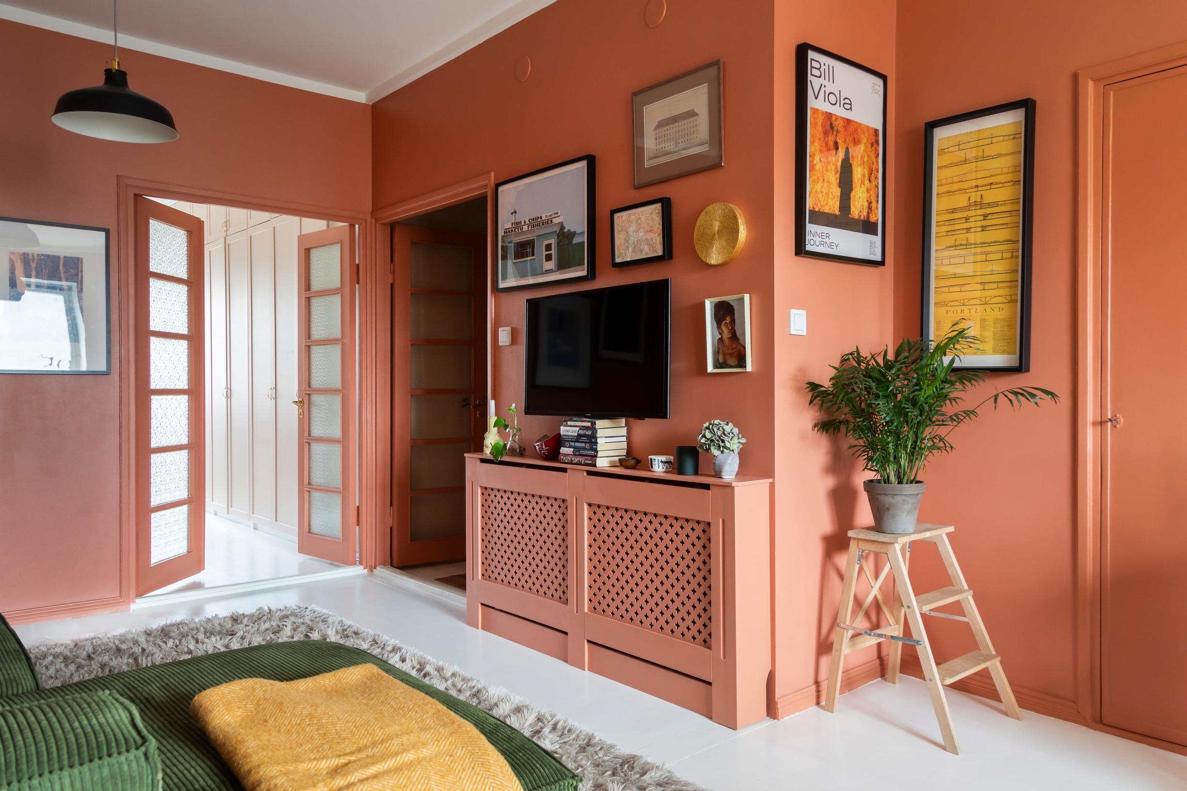 Projekti täytyi aloittaa kylpyhuoneesta siellä olevien vaurioiden vuoksi. Valitsimme tilaan intuition pohjalta vihertävän sävyisen laatan. Tästä heräsi innostus tuoda rohkeasti värejä myös muualle asuntoon. Sarah tulee rakentajasuvusta ja on taitava kaikissa remonttihommissa. Kun ryhdyimme työhön, emme malttaneet enää lopettaa.