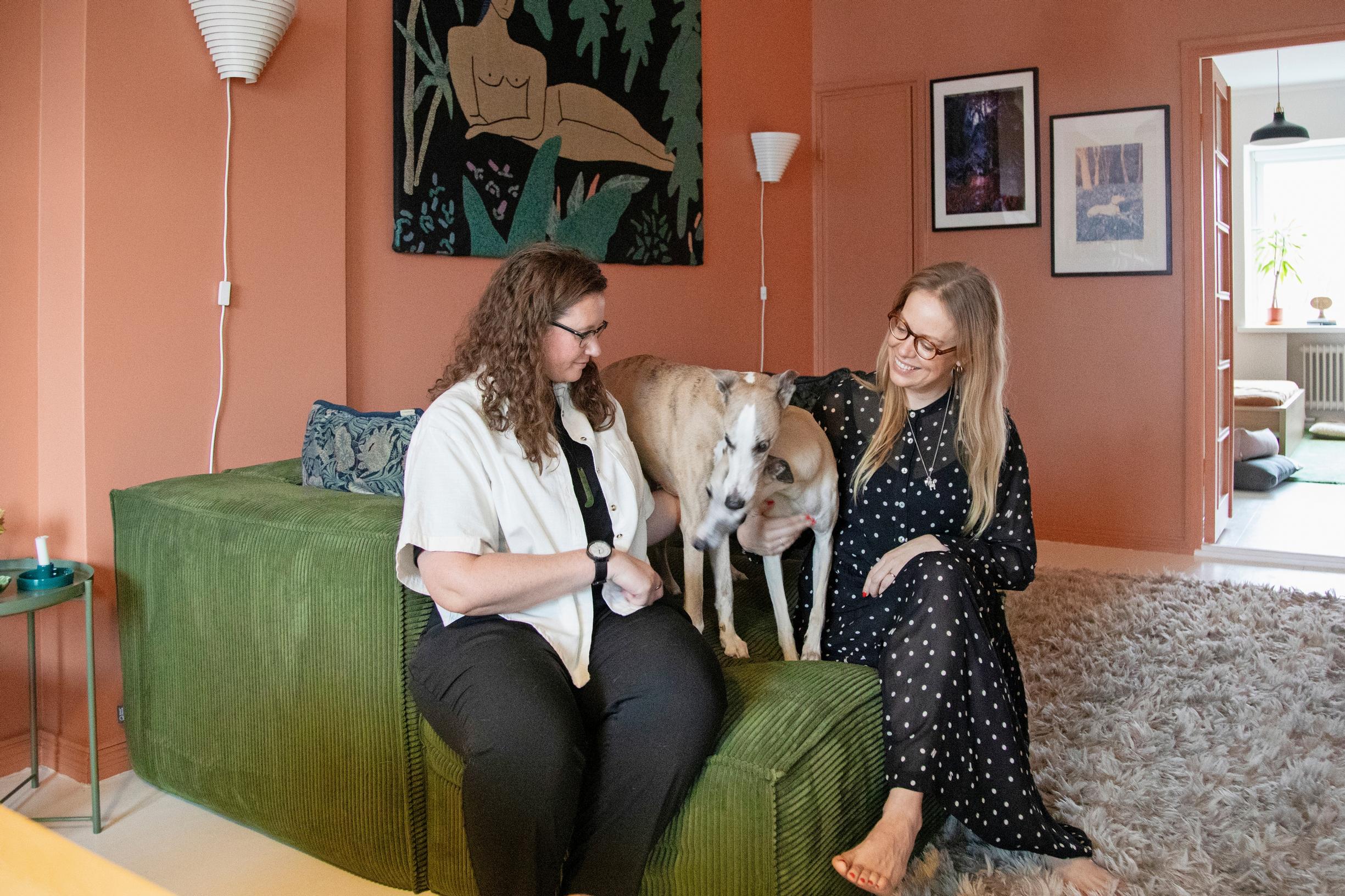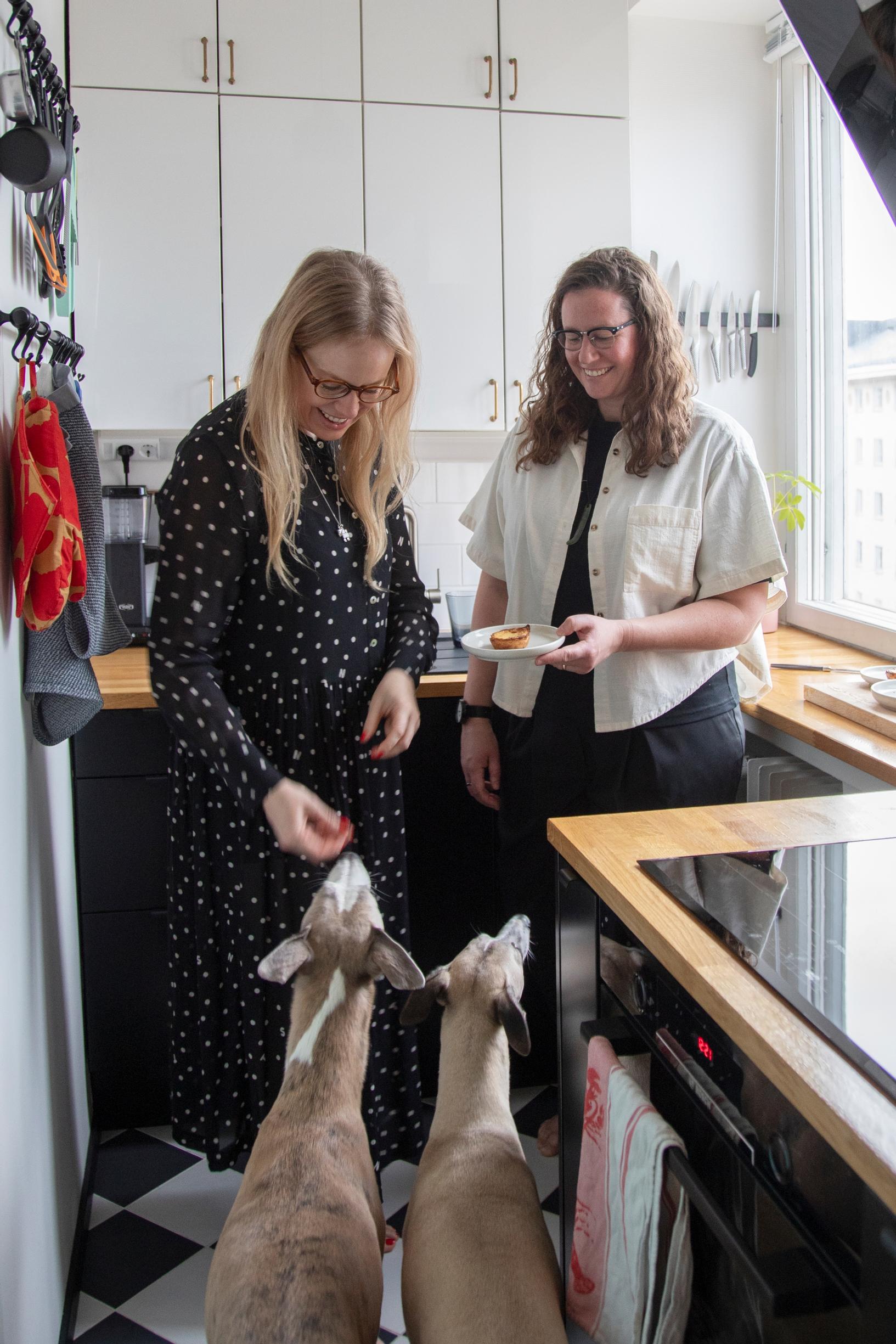 Täällä asuvat: Sarah Moore ja Claire Gilray sekä whippetit Onni ja Manu.