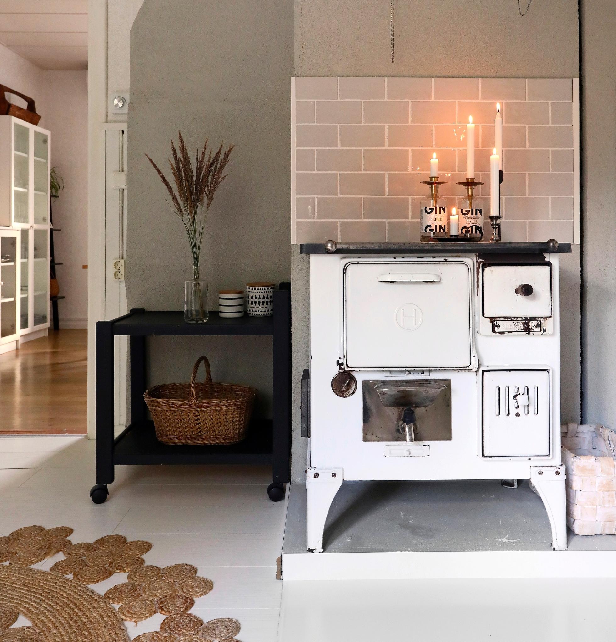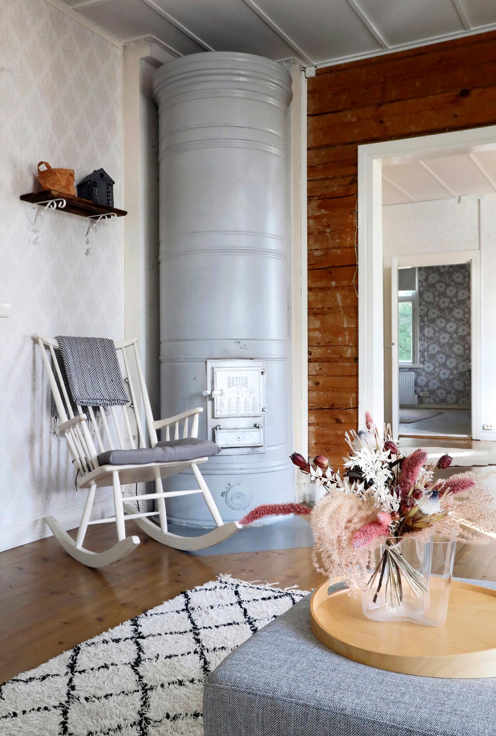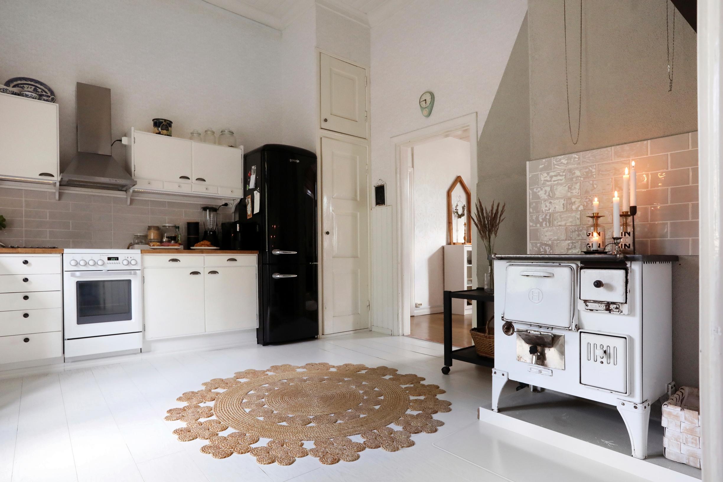 - Yllätä. Vaikka pidän ajattomasta ja luonnonsävyisestä sisustuksesta, haluan myös yllättää. Meillä musta pönttöuuni ja musta jääkaappi eivät ole tavanomaisimpia valintoja yli satavuotiaaseen hirsitaloon.
