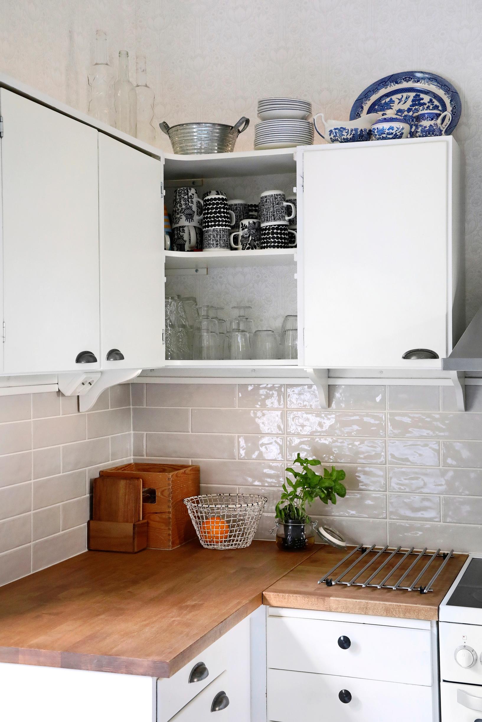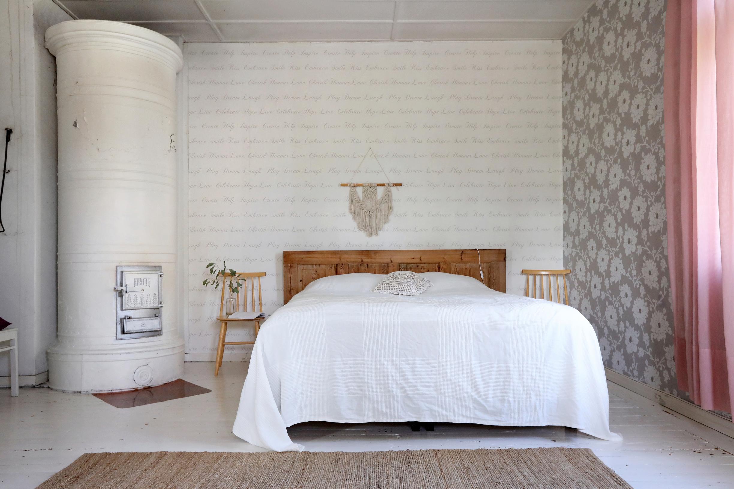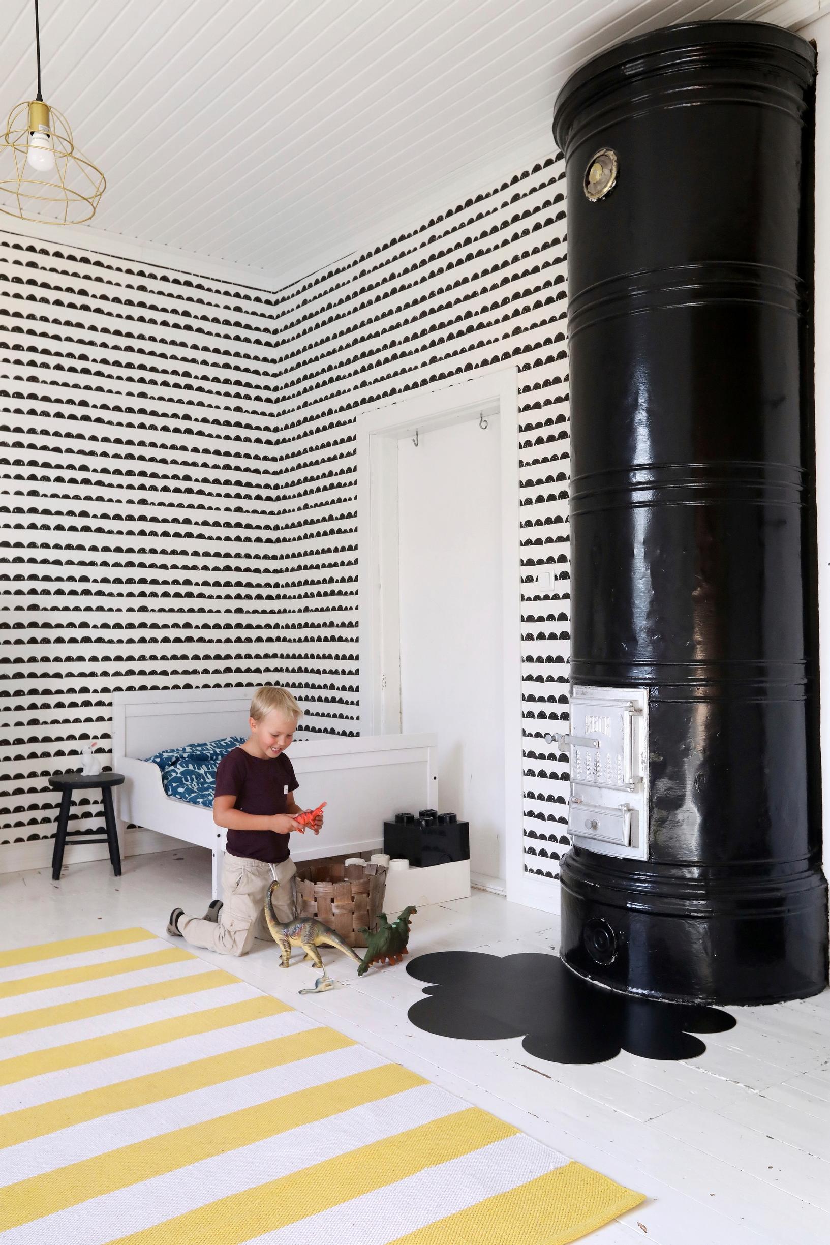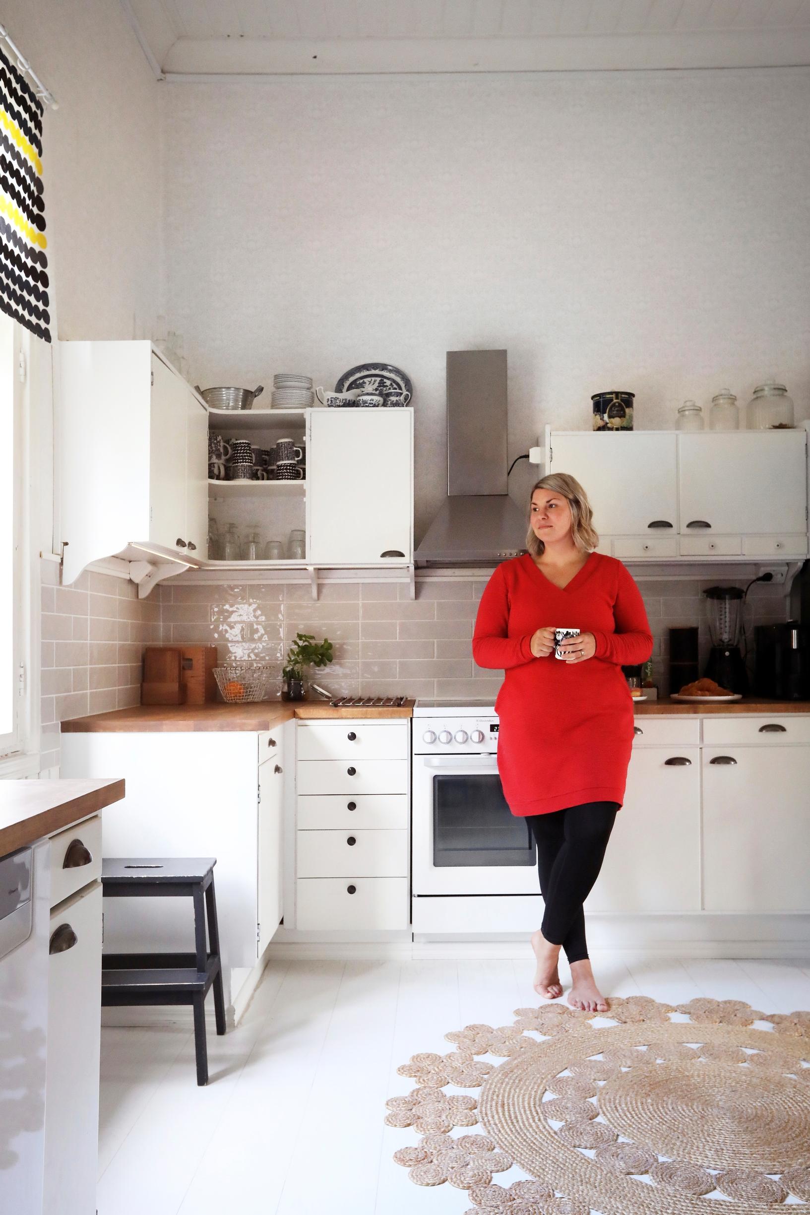 - Yllätä. Vaikka pidän ajattomasta ja luonnonsävyisestä sisustuksesta, haluan myös yllättää. Meillä musta pönttöuuni ja musta jääkaappi eivät ole tavanomaisimpia valintoja yli satavuotiaaseen hirsitaloon.