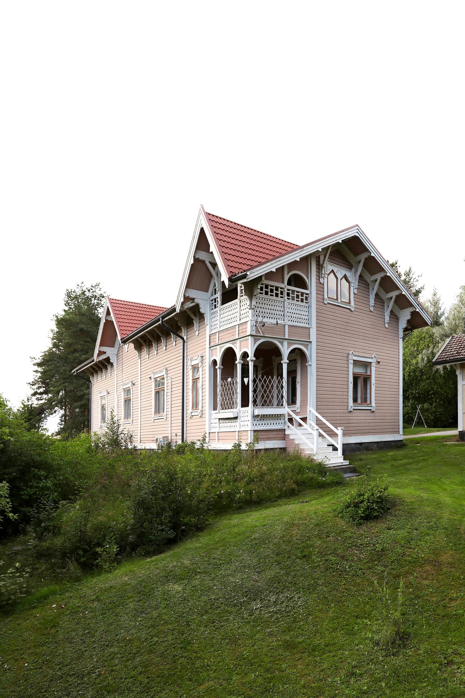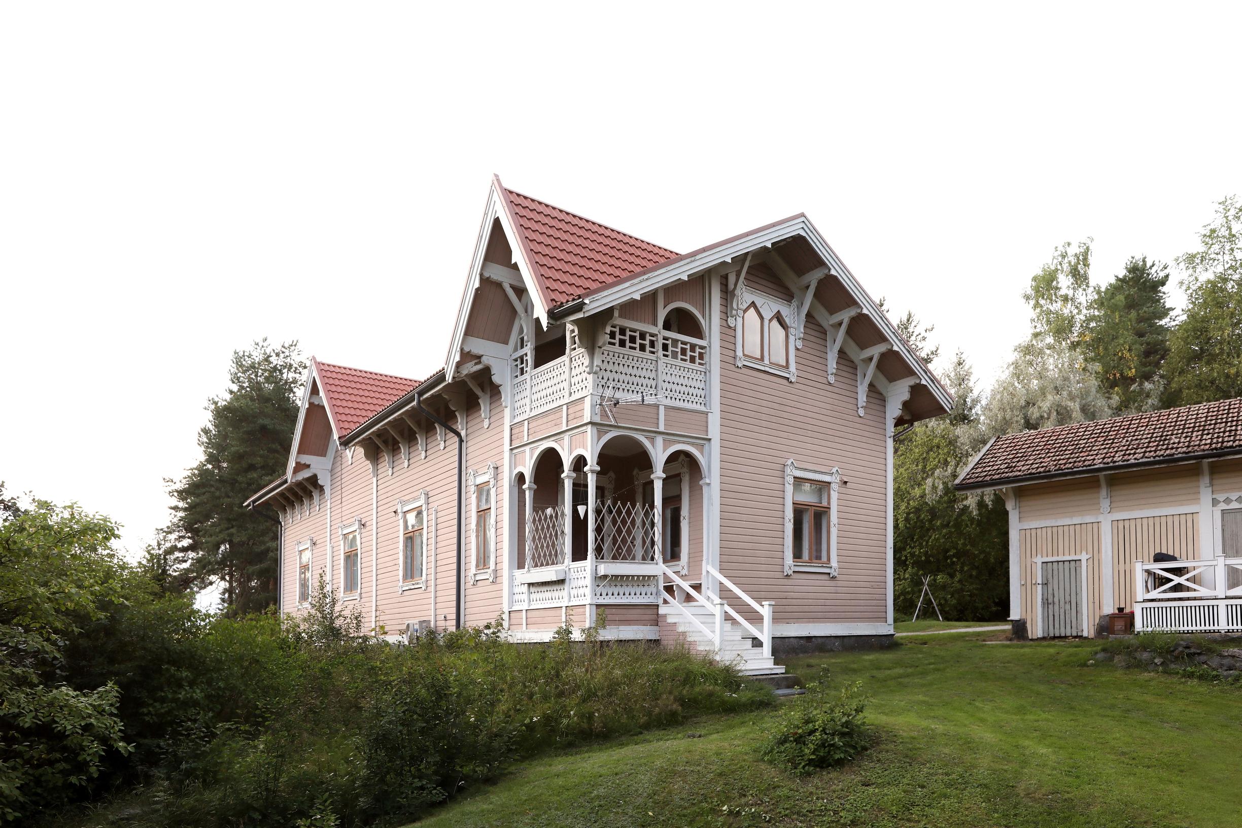 Ulkoapäin koristeellinen ja uniikki talo näytti upealta. Iso vintti kesähuoneineen ja pikkuparvekkeineen sekä piharakennuksen vintit olisivat aikanaan mieluisia leikkipaikkoja lapsille.
