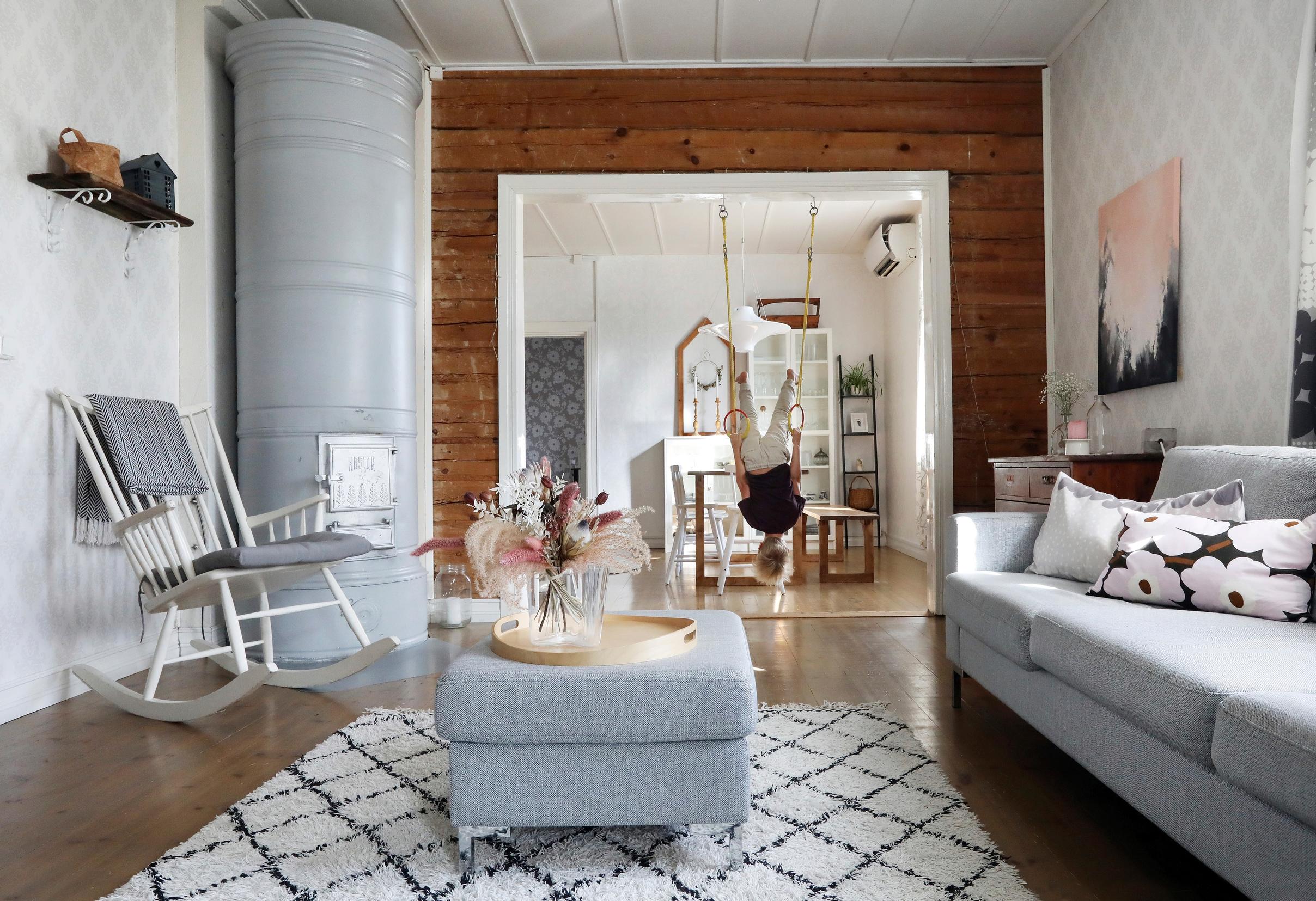 – Kiersimme talon jokaisen nurkan, pihan ja tontin rajat. Kun jäimme hetkeksi kahdestaan pihalle, Iiro tokaisi minulle: ’Meidän on pakko saada tämä!’ Rakastuimme taloon ensi silmäyksellä. Se tuntui kodikkaalta, ja siinä oli niin paljon kaikkea ihanaa: hirsiseinät, lautalattiat, pönttöuunit, korkeat huoneet ja isot ikkunat, Milja kertoo.