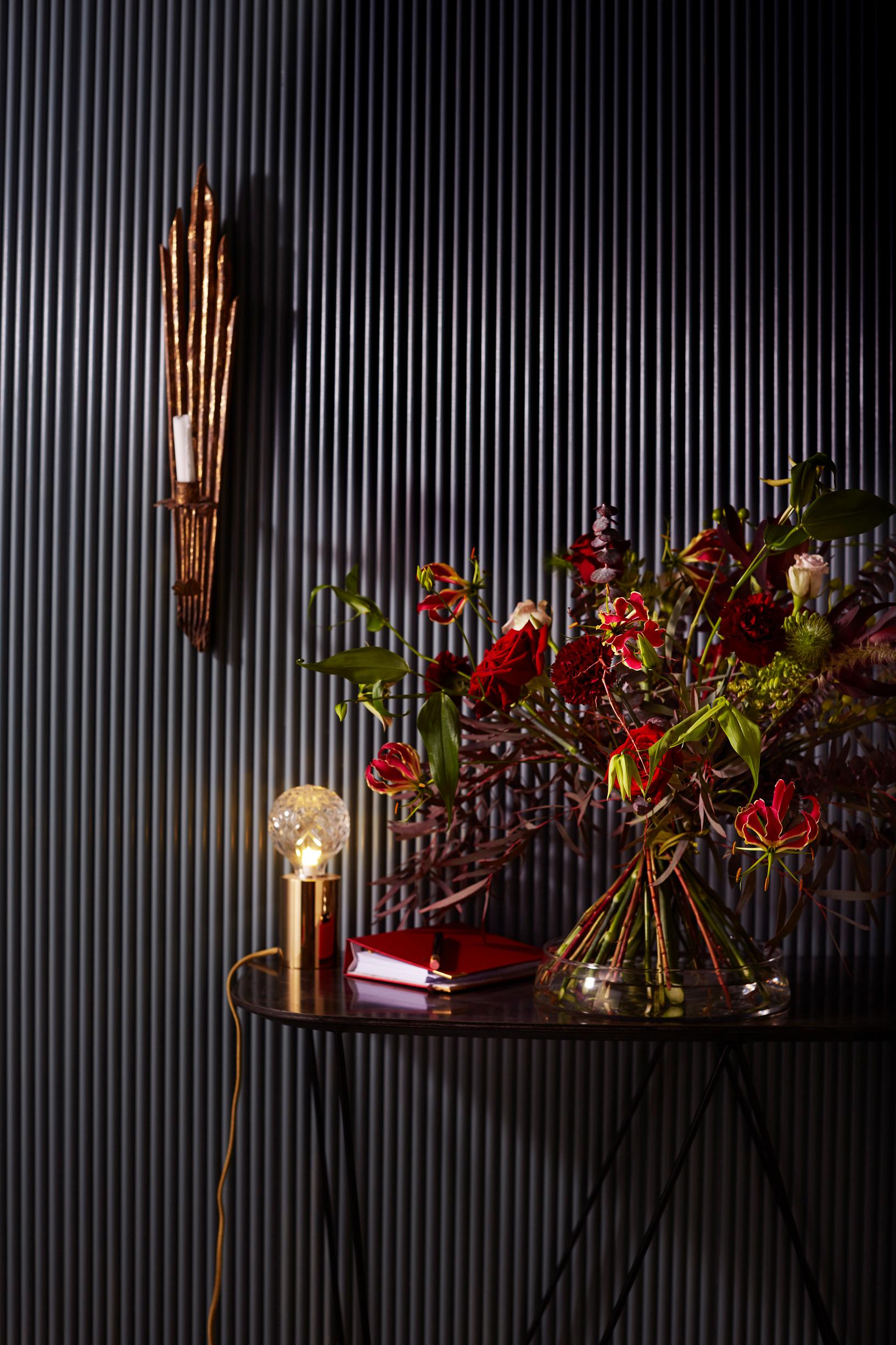 Kimppu vadissa! Punasävyiseen kimppuun on sidottu ruusun ja neilikan rinnalle värjättyjä eukalyptuksen oksia ja keijunliljaa. Maljakkona toimiva pyöreä vati on Ikeasta, valaisin Zarro. Kuva: Johanna Myllymäki