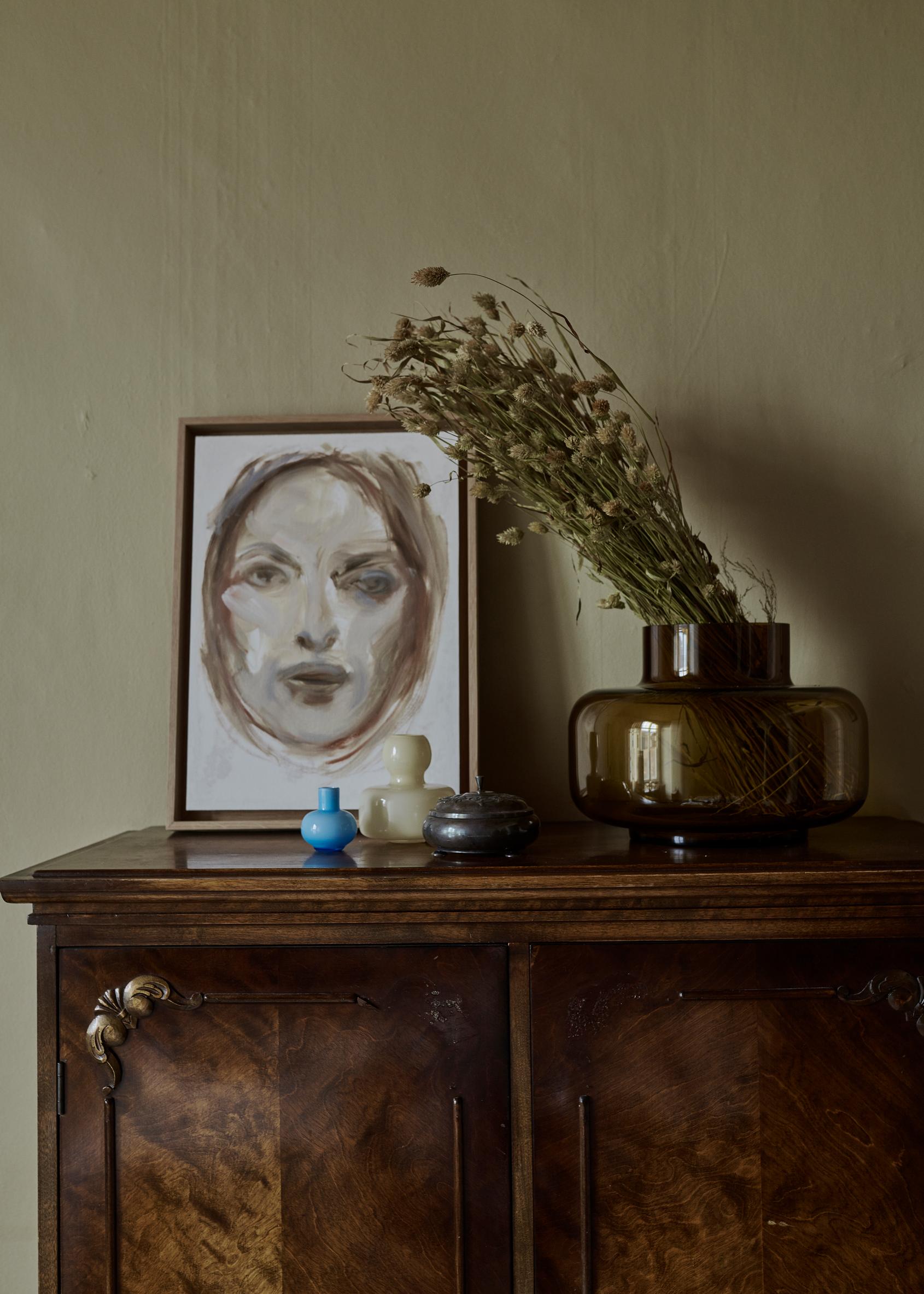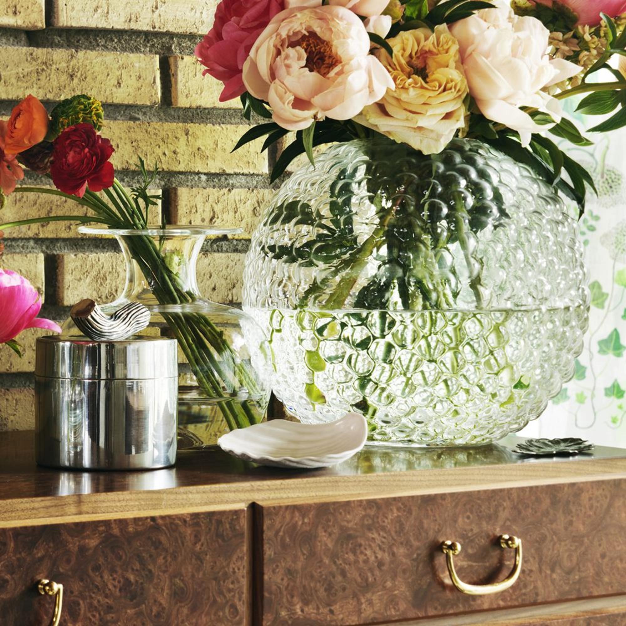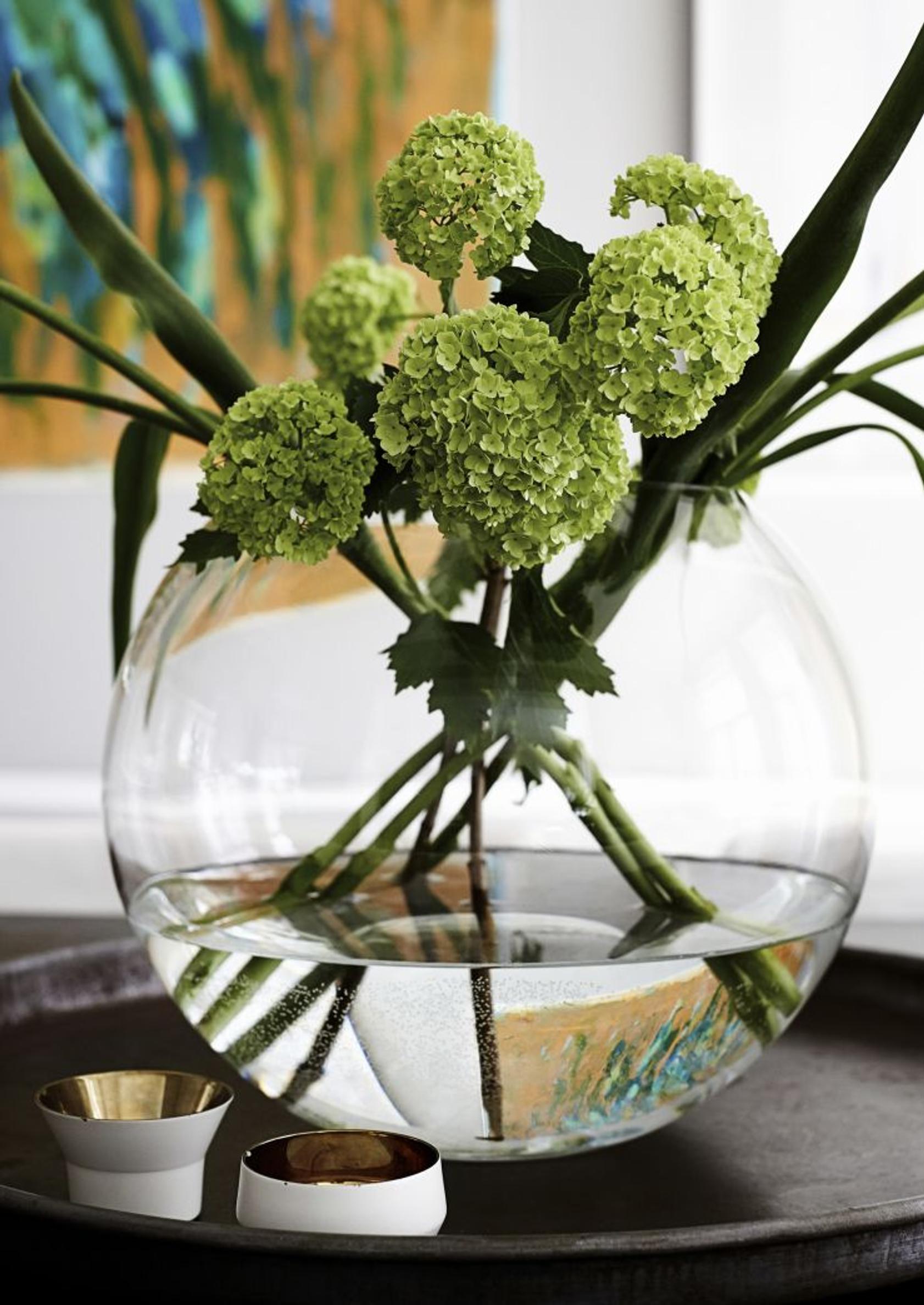 Tässä vaasissa voisi uiskennella vaikka kultakala. Helsinkiläiskodissa harrastetaan kauniita kukka-asetelmia. Kuva: Krista Keltanen