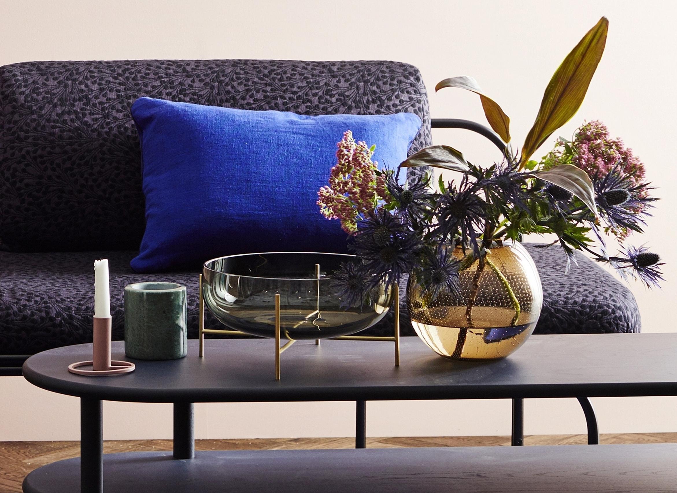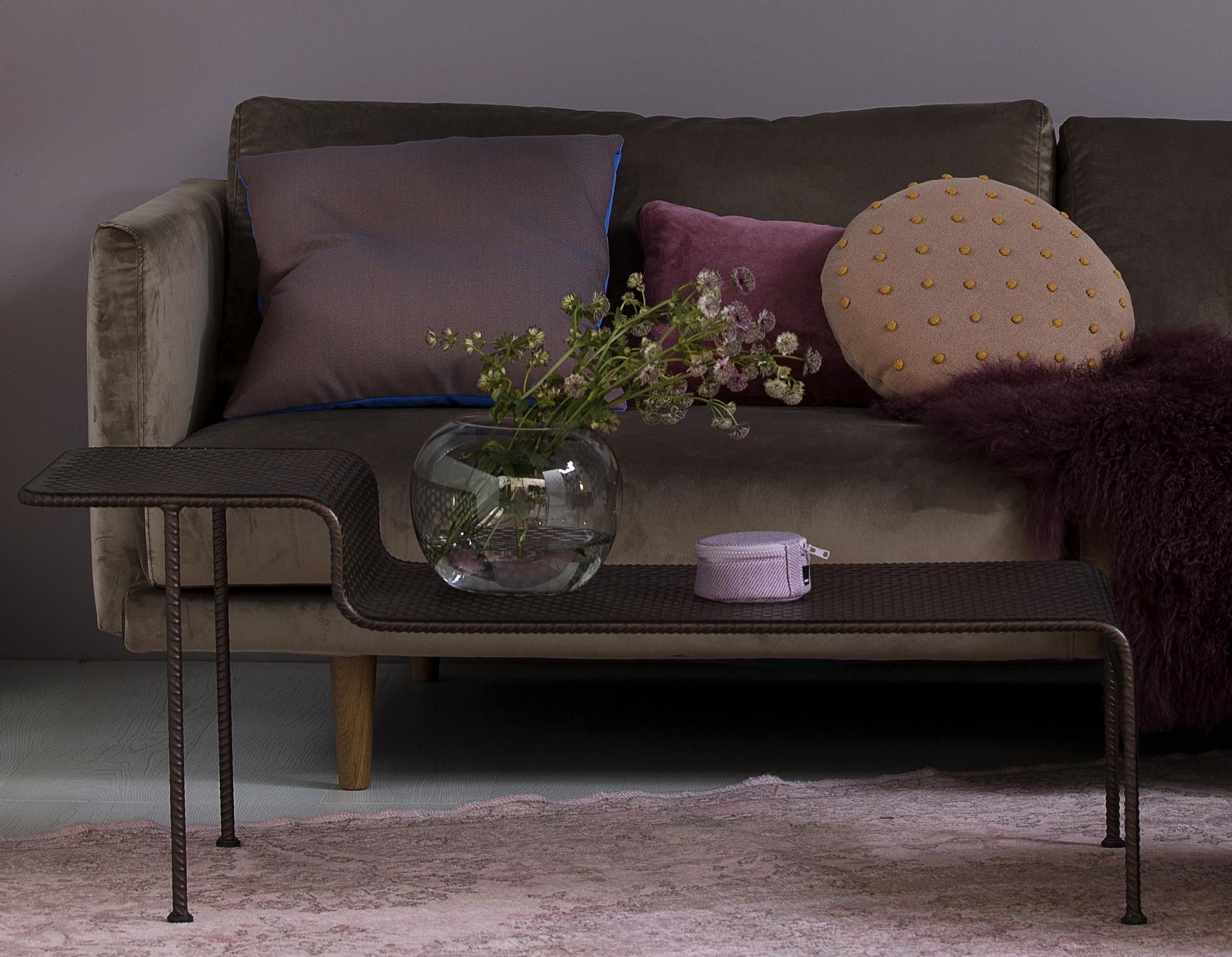 Lazy-samettisohva Hakola, Dieselin metallipöytä Casuarina, tyynyt Formverk ja Pore ja lampaantalja Winkel. Kuva: Johanna Kinnari