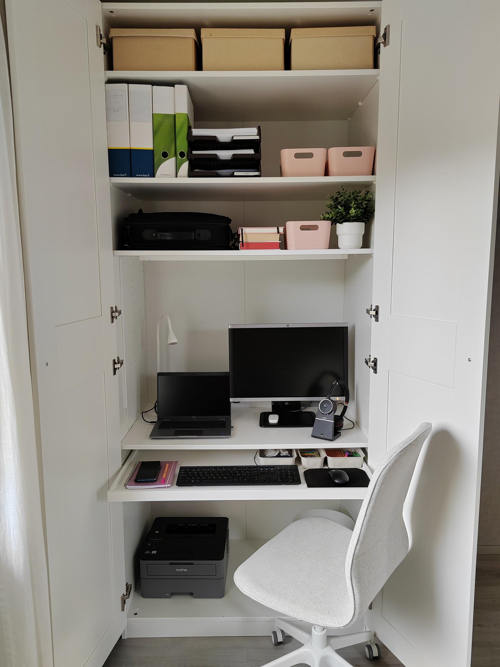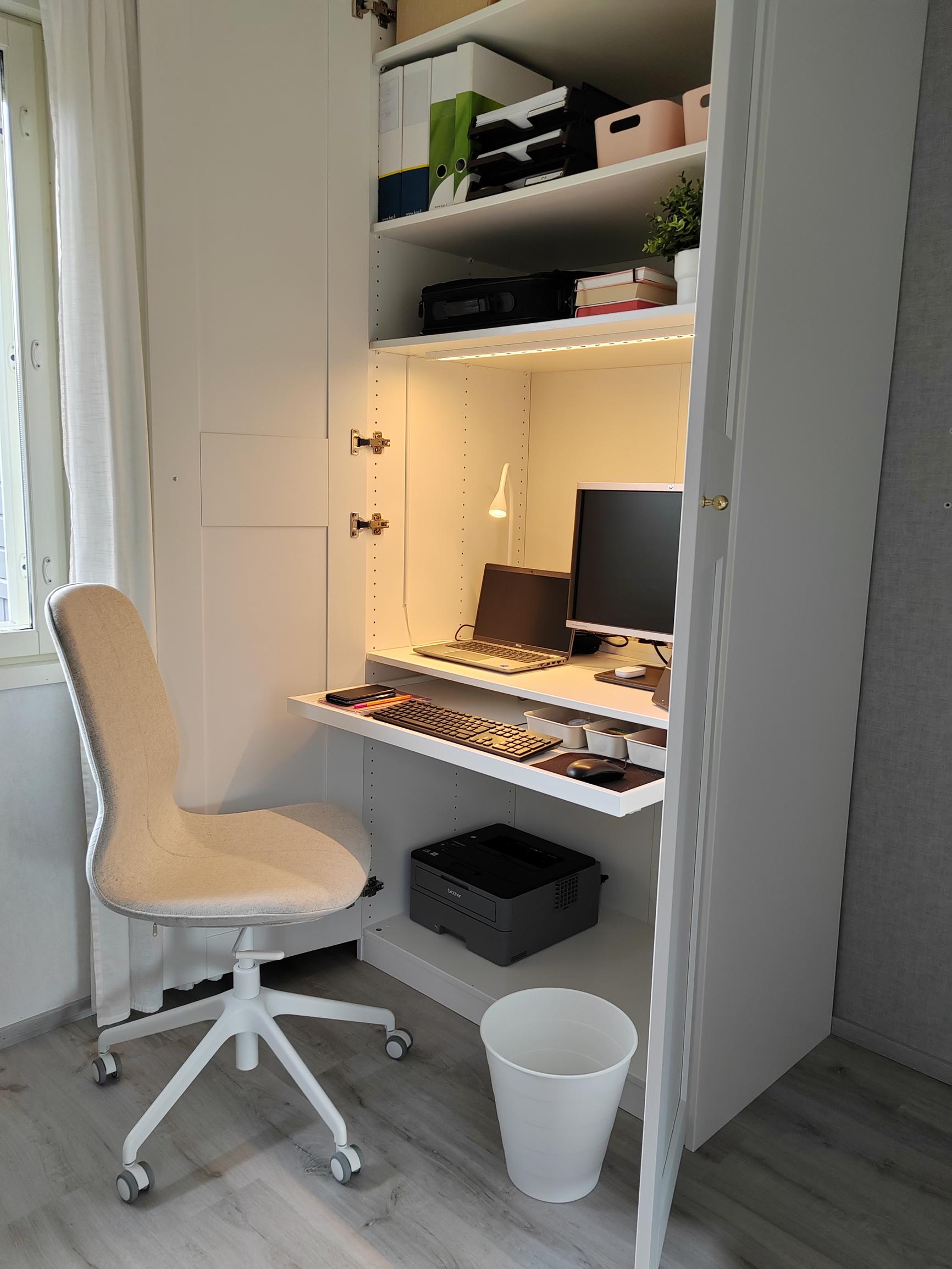 Etätyöpiste vaatekaapissa! Kun sopivaa kotitoimistoa ei löytynyt valmiina, Jaana rakensi sellaisen itse: ”Tuli vielä parempi kuin kuvittelin”
