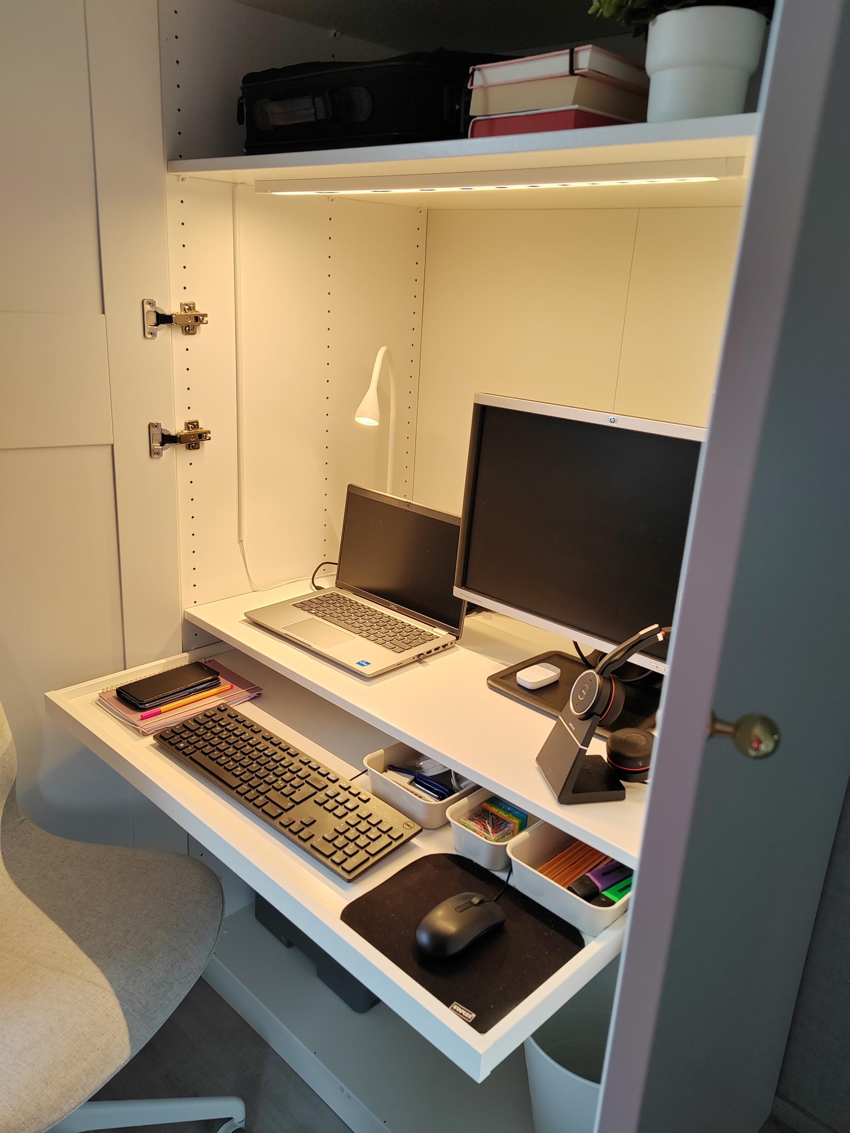 Täydellisesti! Työpistekaapista tuli parempi kuin uskalsin edes toivoa. Puoliso oli alkuun älyttömän skeptinen, mutta on jälkikäteen myöntänyt, että kokonaisuus on todella hyvä. En keksi tästä mitään valittamista. Ergonomisesti kaappi on onnistunut, eikä mitään selkävaivoja ole tullut. Ja mikä tärkeintä, kun työpäivä päättyy, saan kaikki tavarat siististi kaappien sisään.