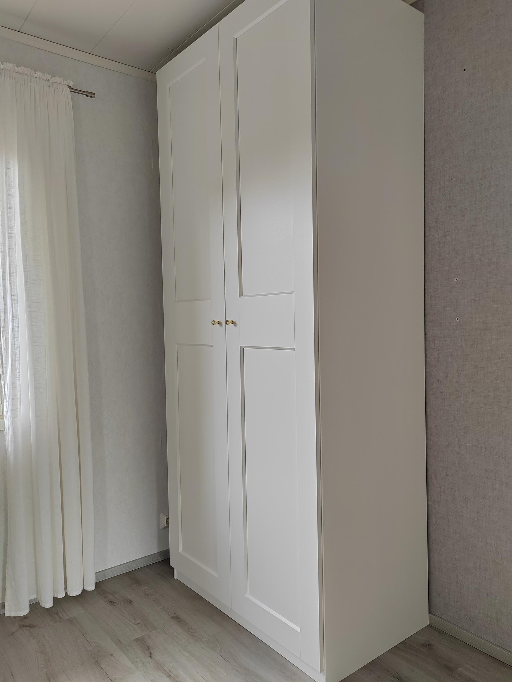 Tämä oli ensimmäisiä asioita, mitä uuteen kotiin laitettiin. Kaapin ympärille lähden rakentamaan muun huoneen, joka toimii kaunistautumis- ja meikkauspaikkanani. Tuntuu, ettei mikään vanhan kodin tavaroista oikein sovi tänne, joten tässä kodissa on laitettu kaikki uusiksi käsipyyhkeitä myöten. Tavoittelemme herkkää, maanläheistä ja luonnollista kokonaisuutta. Todennäköisesti maalaan tämän minun huoneeni seinät hennon roosalla. Lisäksi aion hankkia pitkään haaveilemani vaaleanpunaisen simpukkamaisen nojatuolin! Kyllä siinä istuessa olisi tietokoneen tuijottaminen häirinnyt.