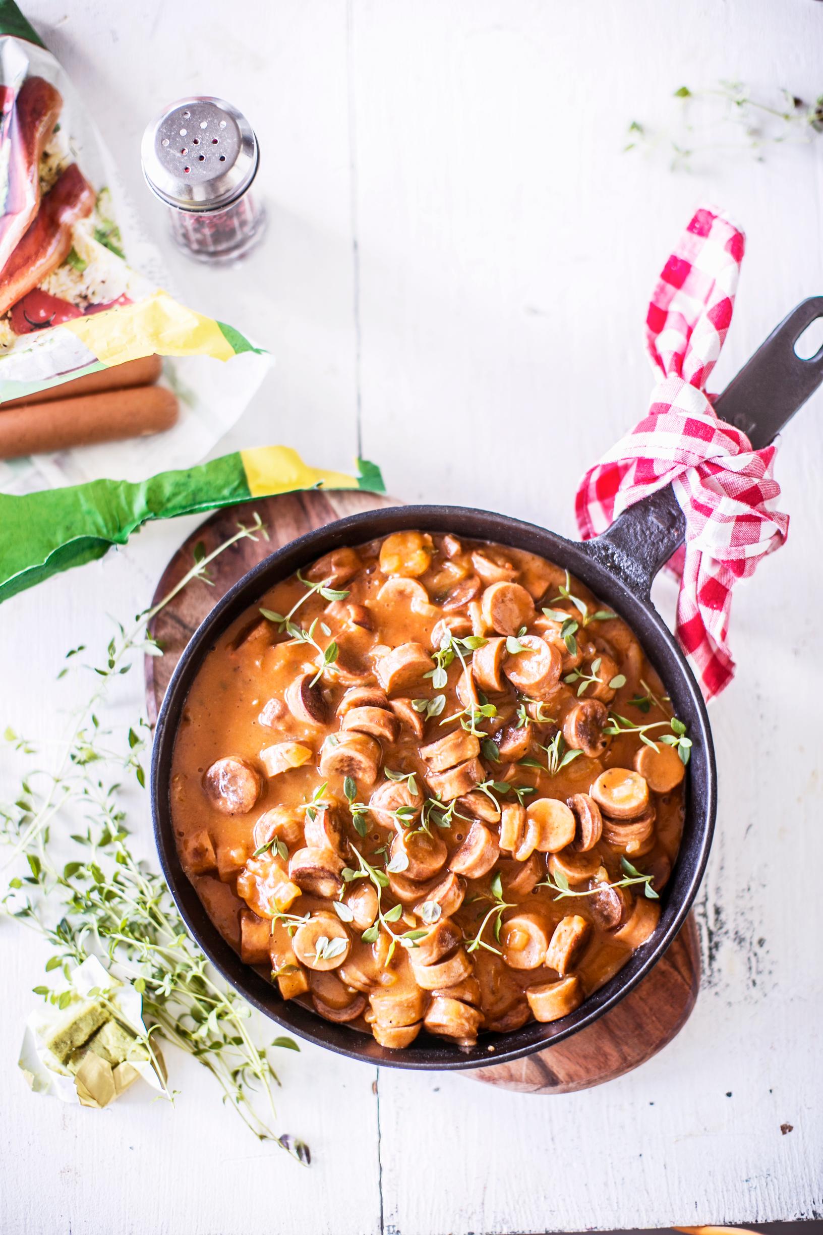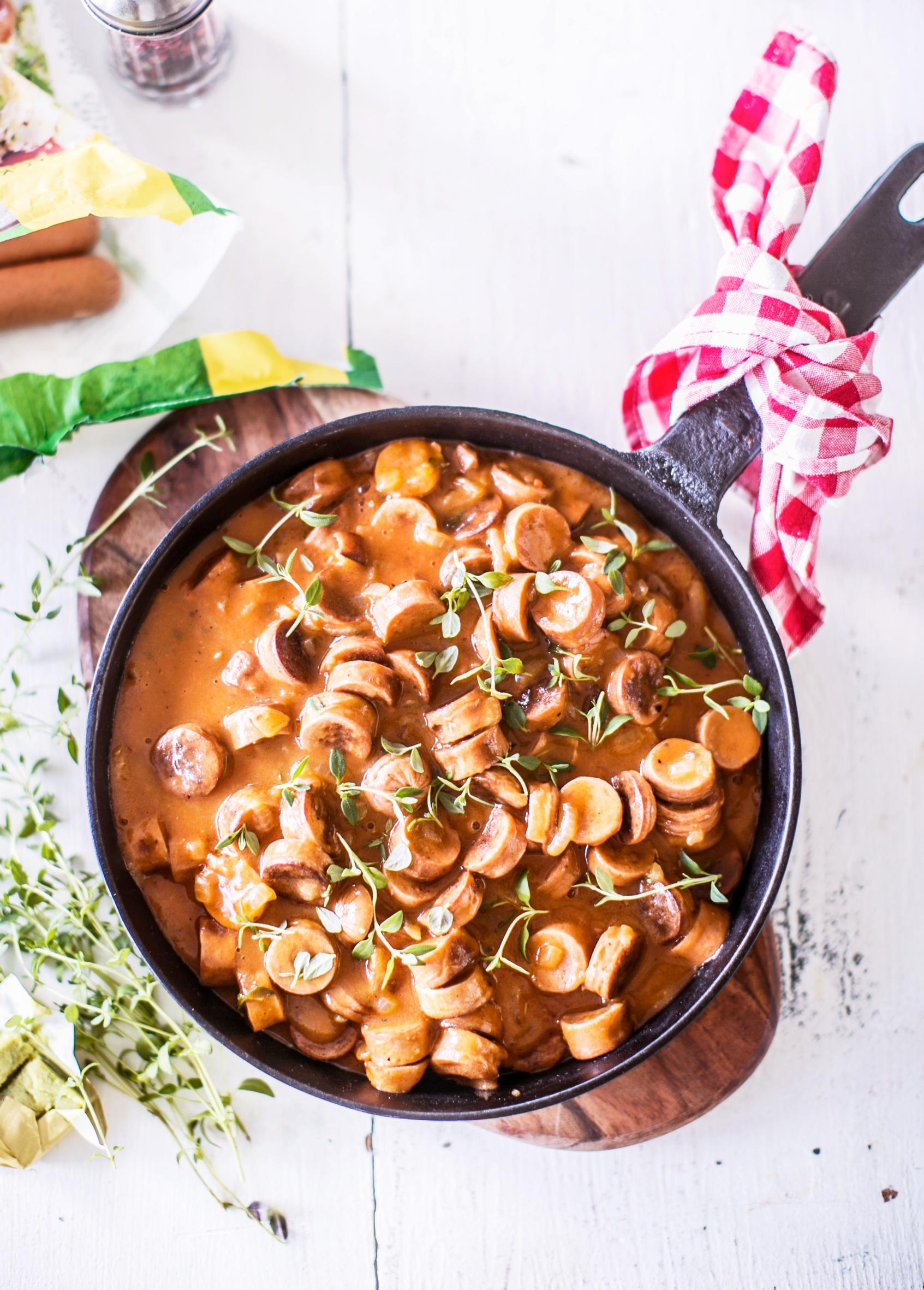 Lapsuuden lämmin nakkikastike ja perunamuusi, voiko parempaa edes olla? Tämä lempiruoan vegaaninen versio maistuu aivan yhtä hyvältä kuin naperona.