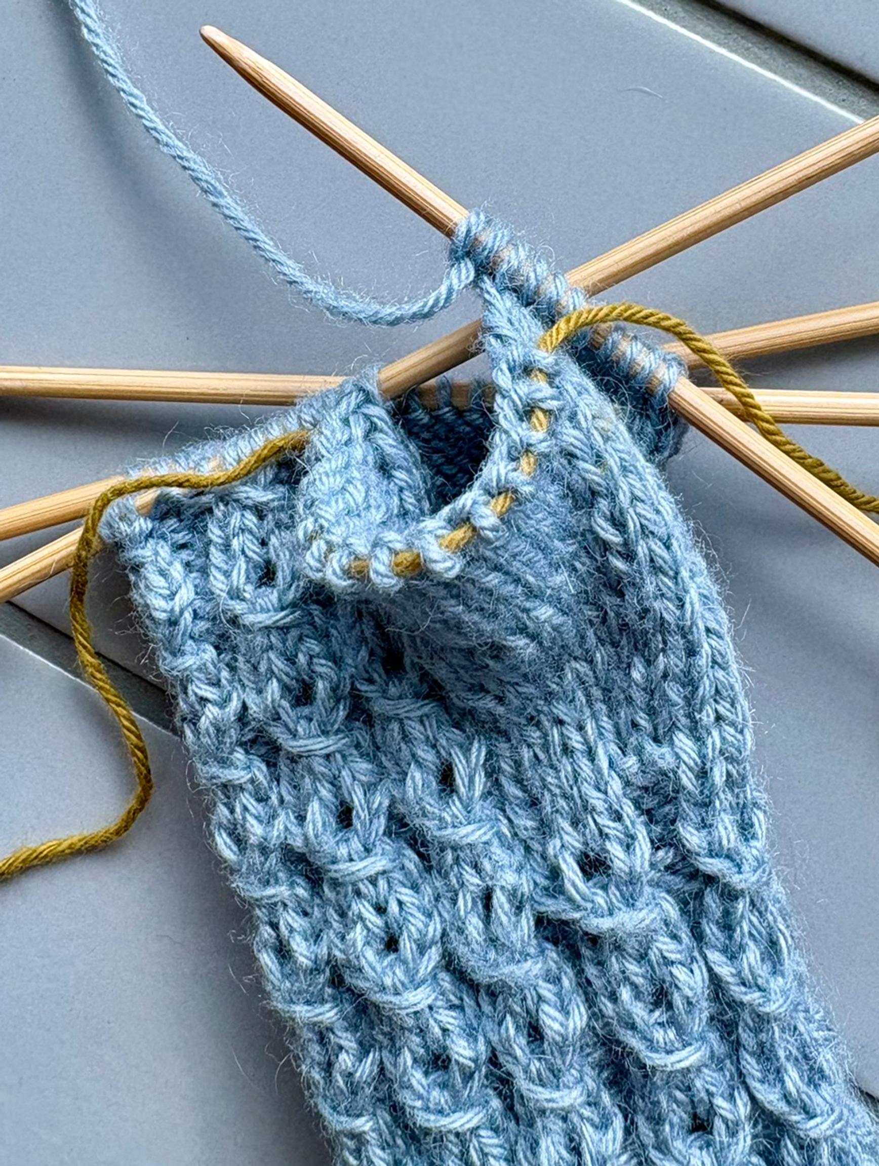 Toista kerroksia 1–5, kunnes varren pituus on noin 10 cm (tai haluamasi mittainen) ja olet viimeksi neulonut krs:n 5. Jaa s:t uudelleen niin, että puikoilla 1 ja 2 on yhteensä 23 s ja puikoilla 3 ja 4 yhteensä 27 s. Puikon 2 lopusta siirtyy kaksi nurjaa silmukkaa puikolle 3.
