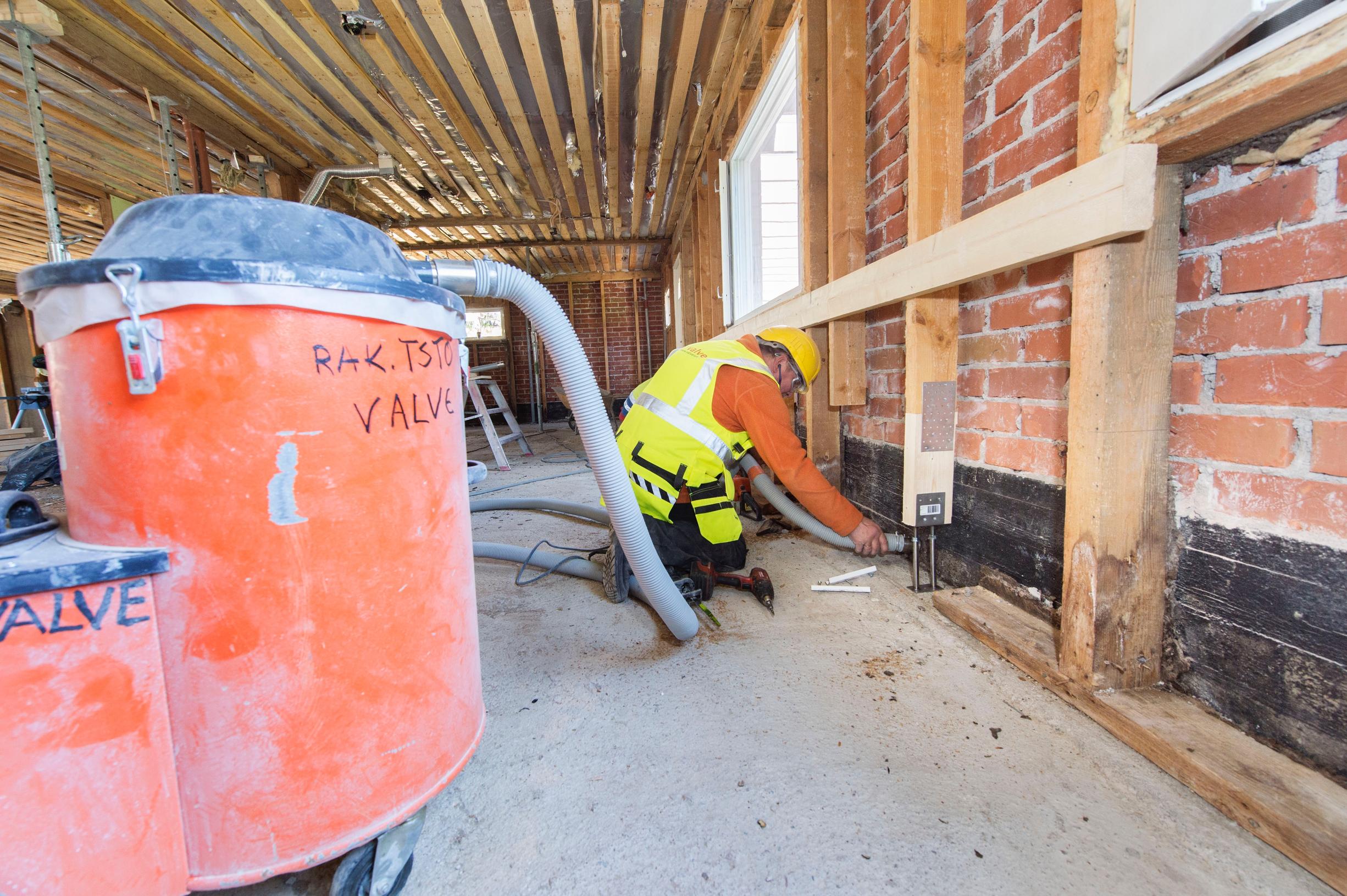 Kengityksen jälkeen seinärakenne ja laatan pinta puhdistettiin imurilla desinfiointia varten. Desinfiointi tehdään valesokkelikengän asentamisen jälkeen ennen uusien eristeiden laittamista.