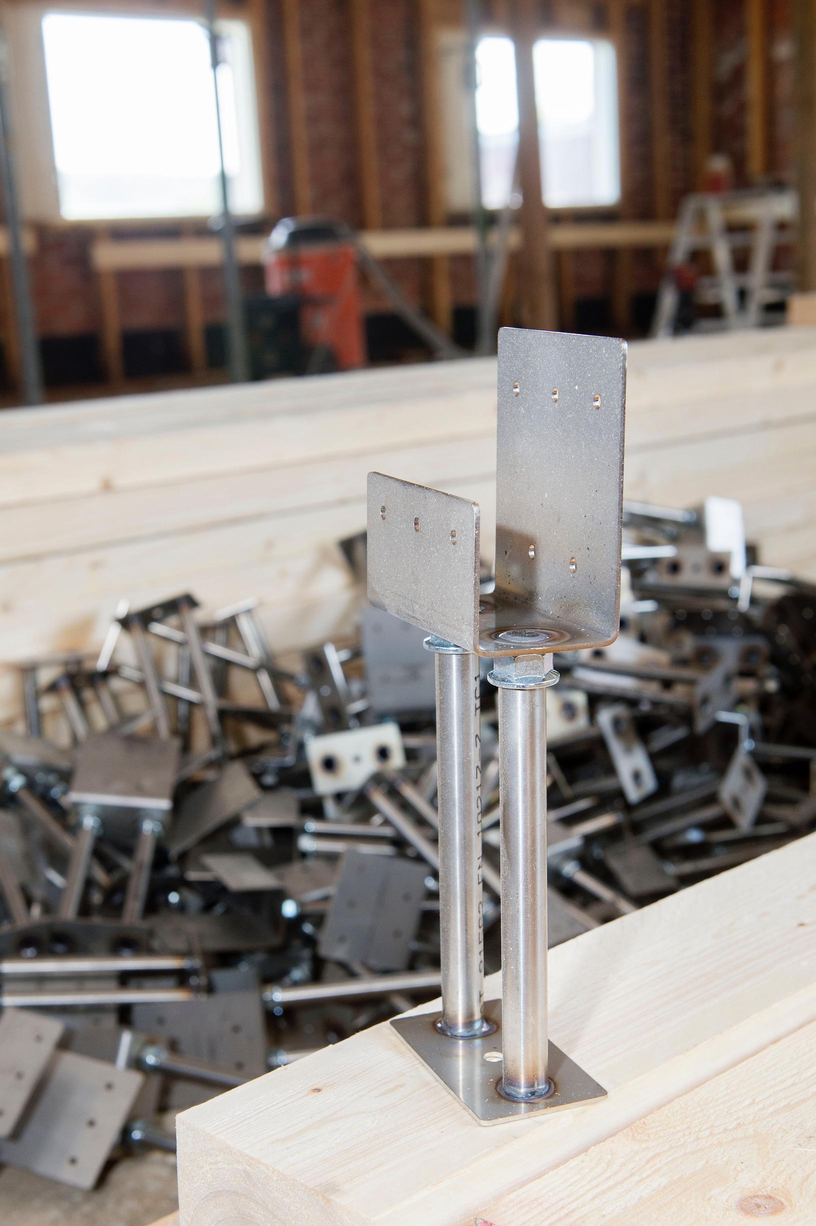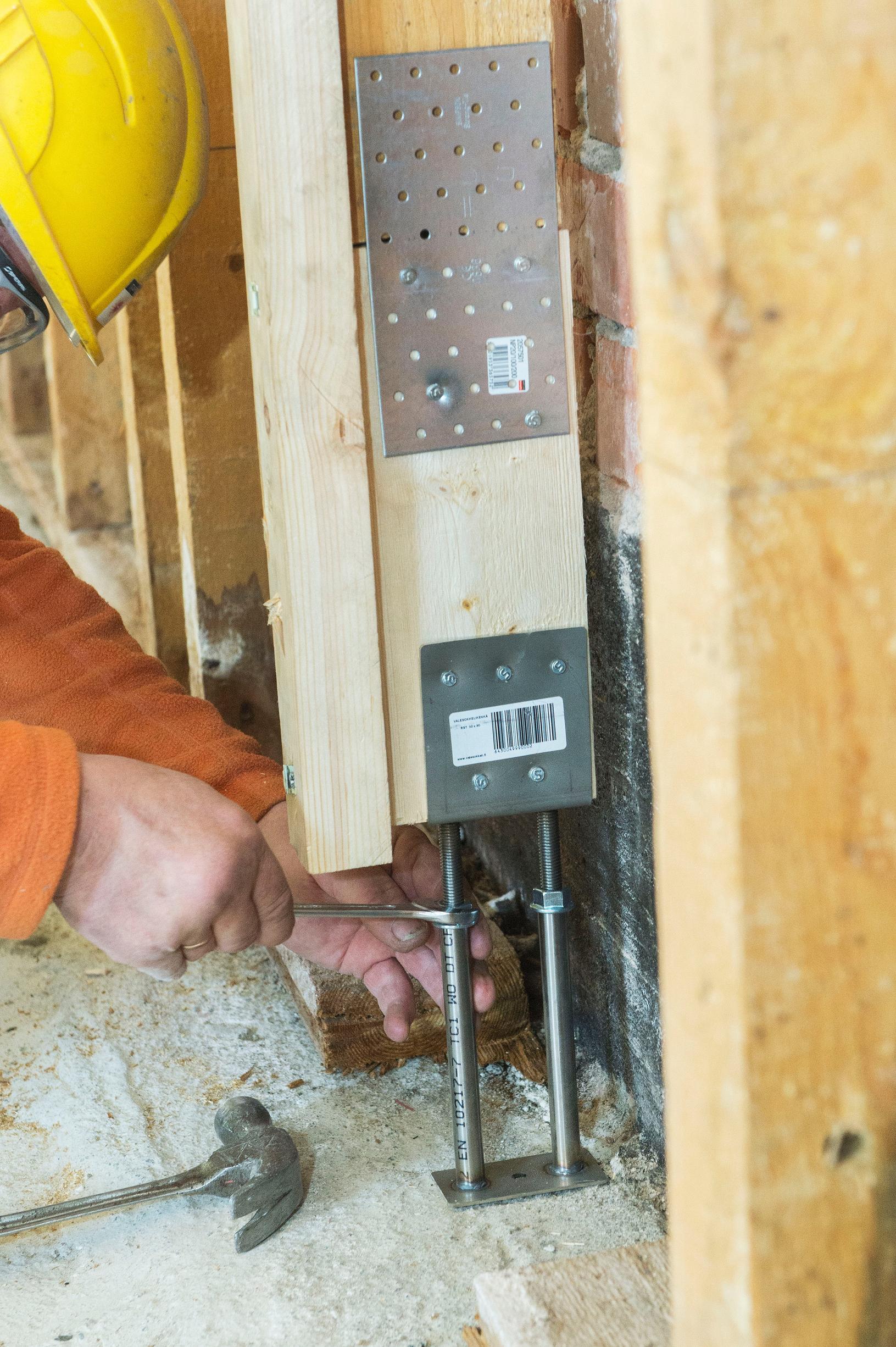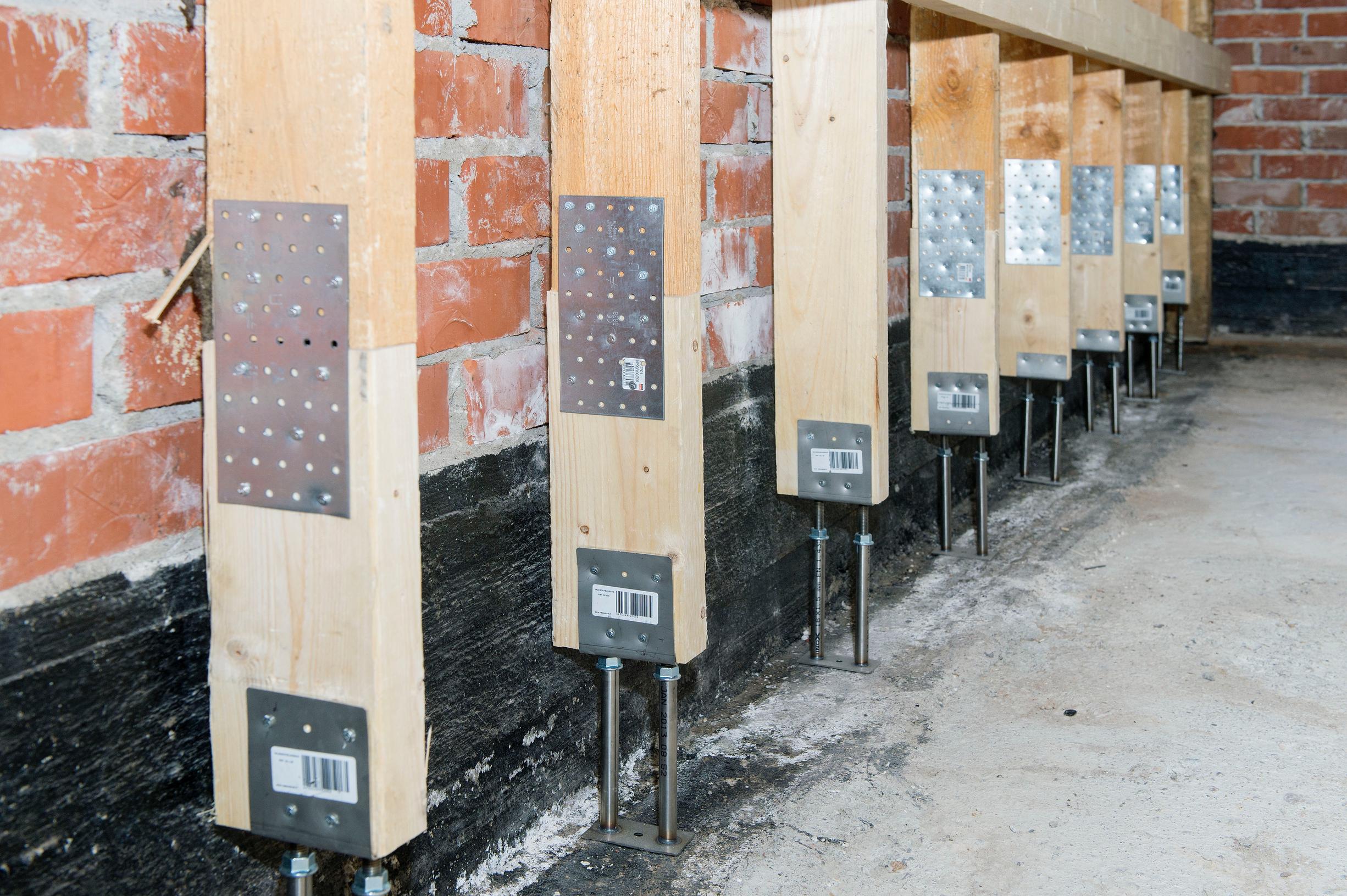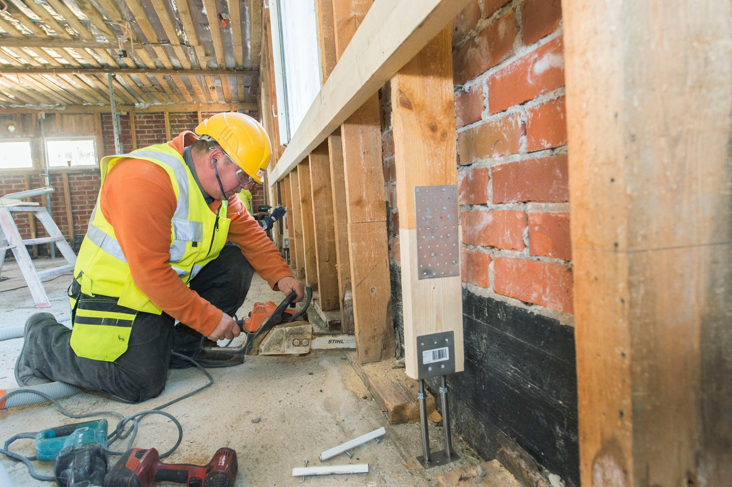 Tässä talossa kosteus oli noussut ylemmäs pystyrunkoon, joten puuta piti jatkaa terveellä pätkällä kakkosnelosta. Kirvesmiehet sahasivat runkotolppiin sopivan pituiset jatkopalat, joiden toinen alapää ruuvattiin kiinni sokkelikenkään, ja yläpää kiinnitettiin naulauslevyllä. Imuri huusi jokaisen kengityksen välissä, sillä tulevaa desinfiointia varten poteron oli oltava siisti.
