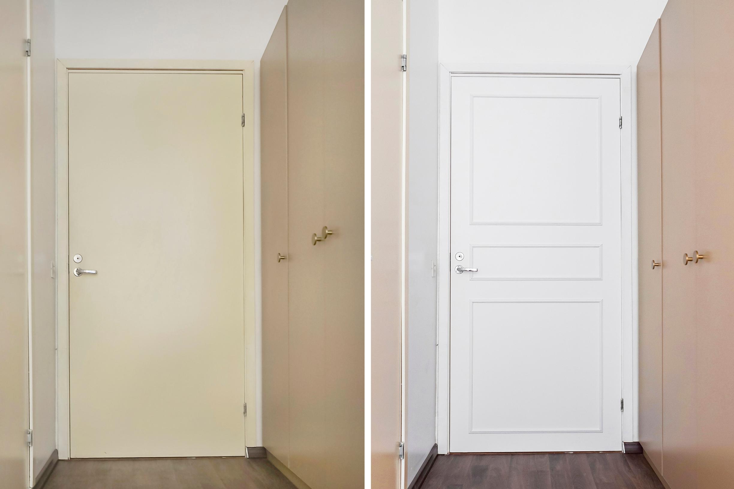 Kellastuneen välioven maalaus – kalustemaalilla uudistettu ovi viimeisteltiin näyttävillä koristelistoilla