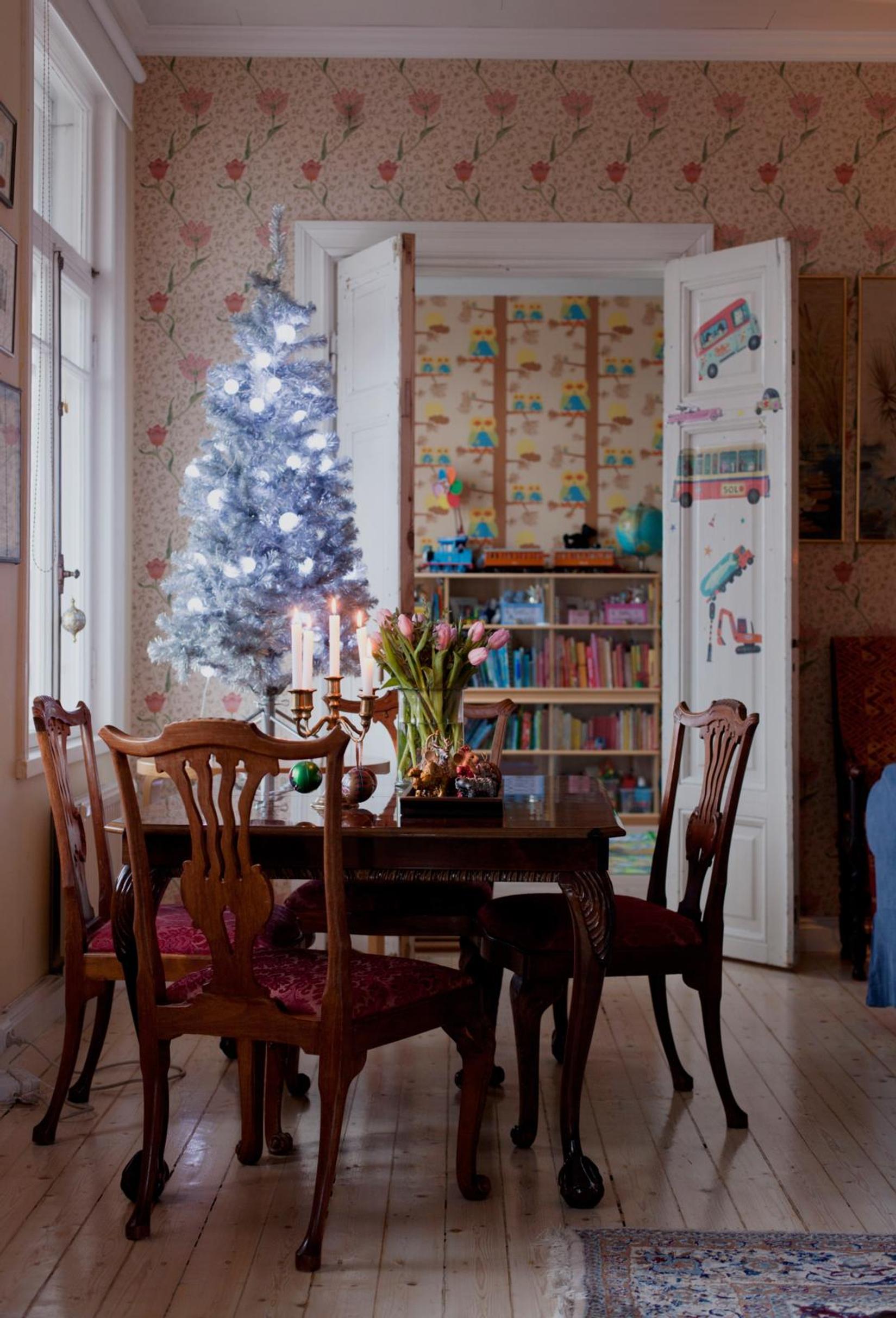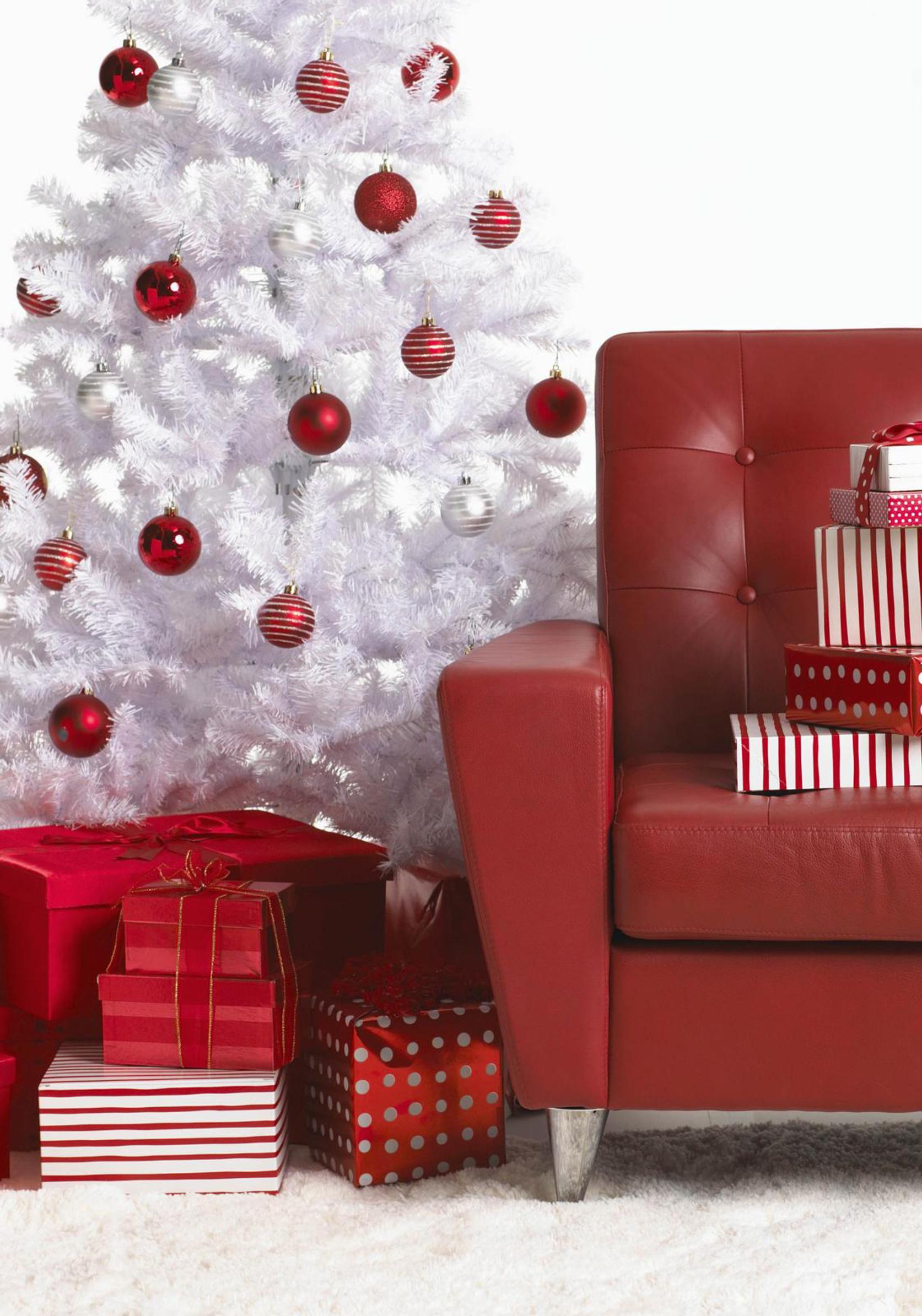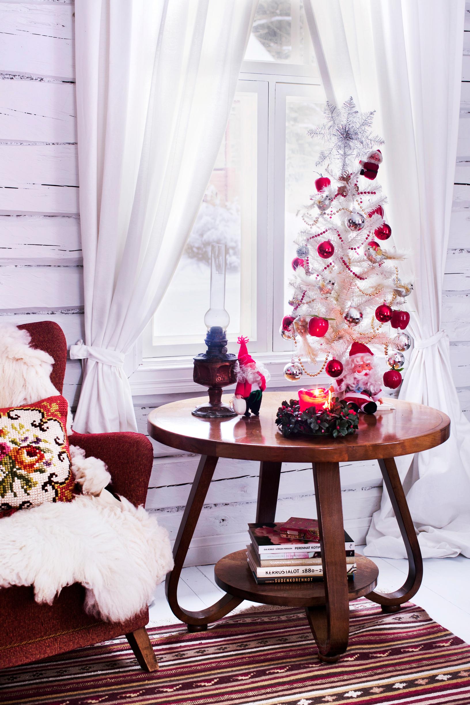 Valkoinen pöytäkuusi on hauska yksityiskohta tyylikkään punavalkoisessa joulutuvassa.