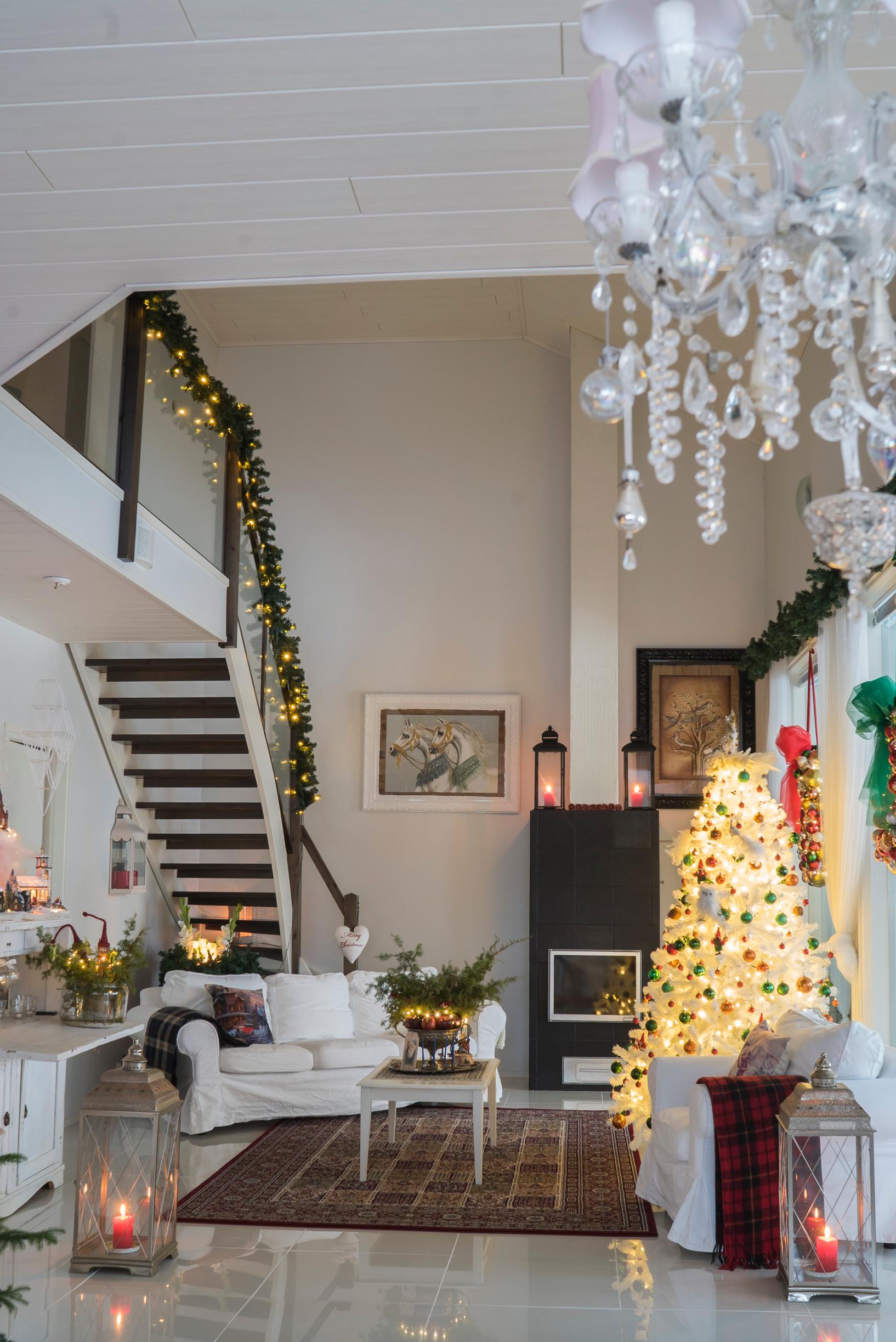 Tässä kodissa näyttävästi valaistu valkoinen joulukuusi on puettu punaiseen ja vihreään. Sama värit toistuvat sekä kuusessa että ikkunoiden suurissa joulupallokransseissa.