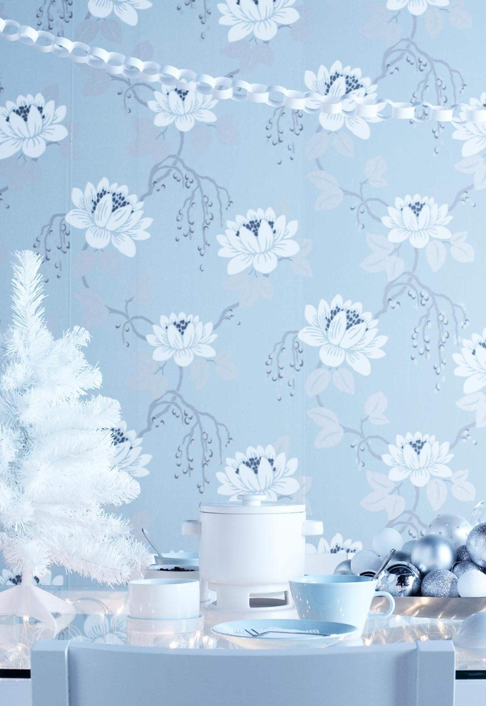 Pieni valkoinen pöytäkuusi on kuulaan talvikattauksen katseenvangitsija.
