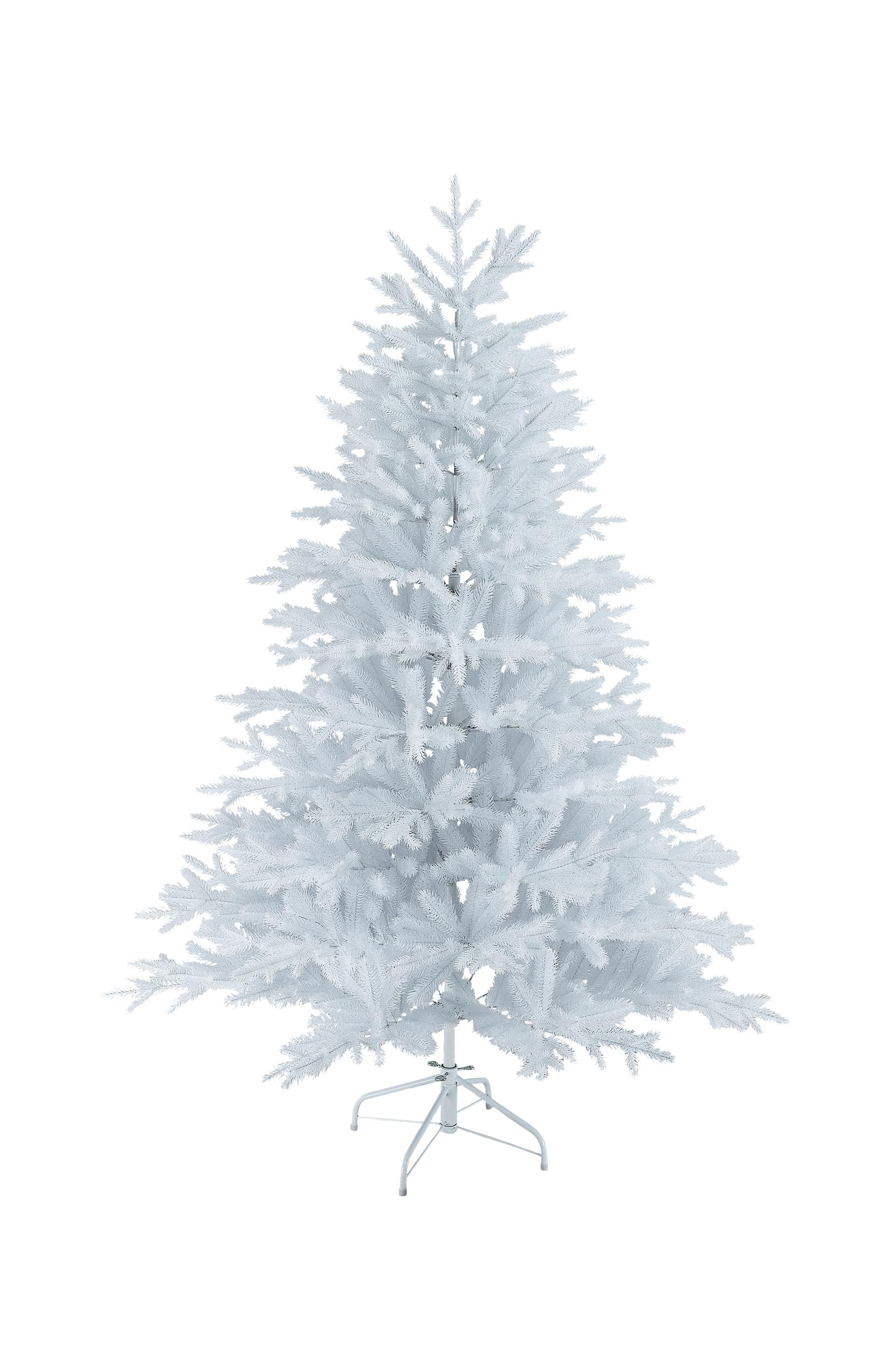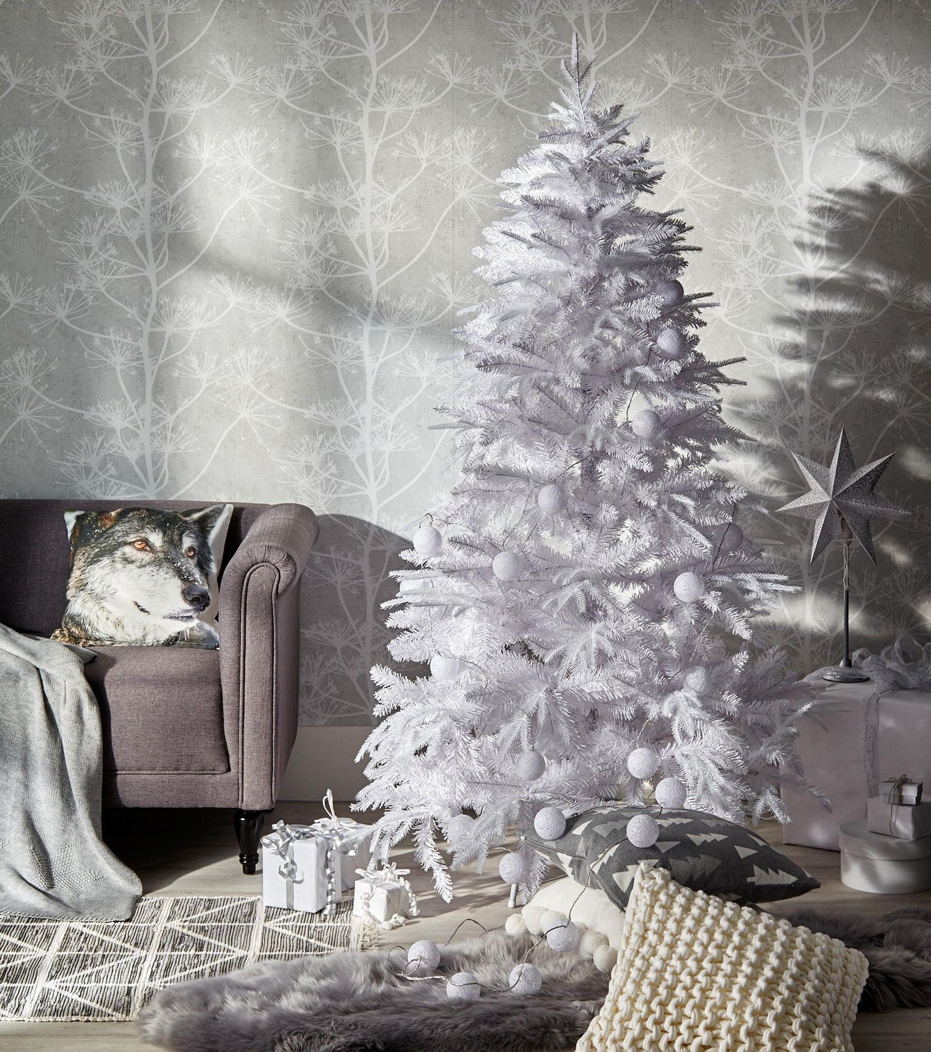 Valkoista valkoisella. Yhden sävyn kuusi sopii hillittyyn sisustukseen. Koodin tekokuusi (kork. 210 cm) 139 €, Hobby Hall.