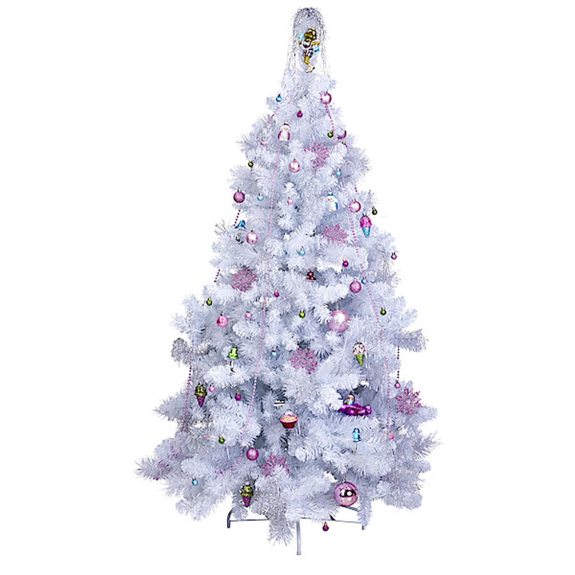 Mikä kitch-kuusi! Övereimmät koristeet ovat omiaan valkoisen kuusen kaverina. Kuusi (kork. 180 cm) 49,95 €, Clas Ohlson.