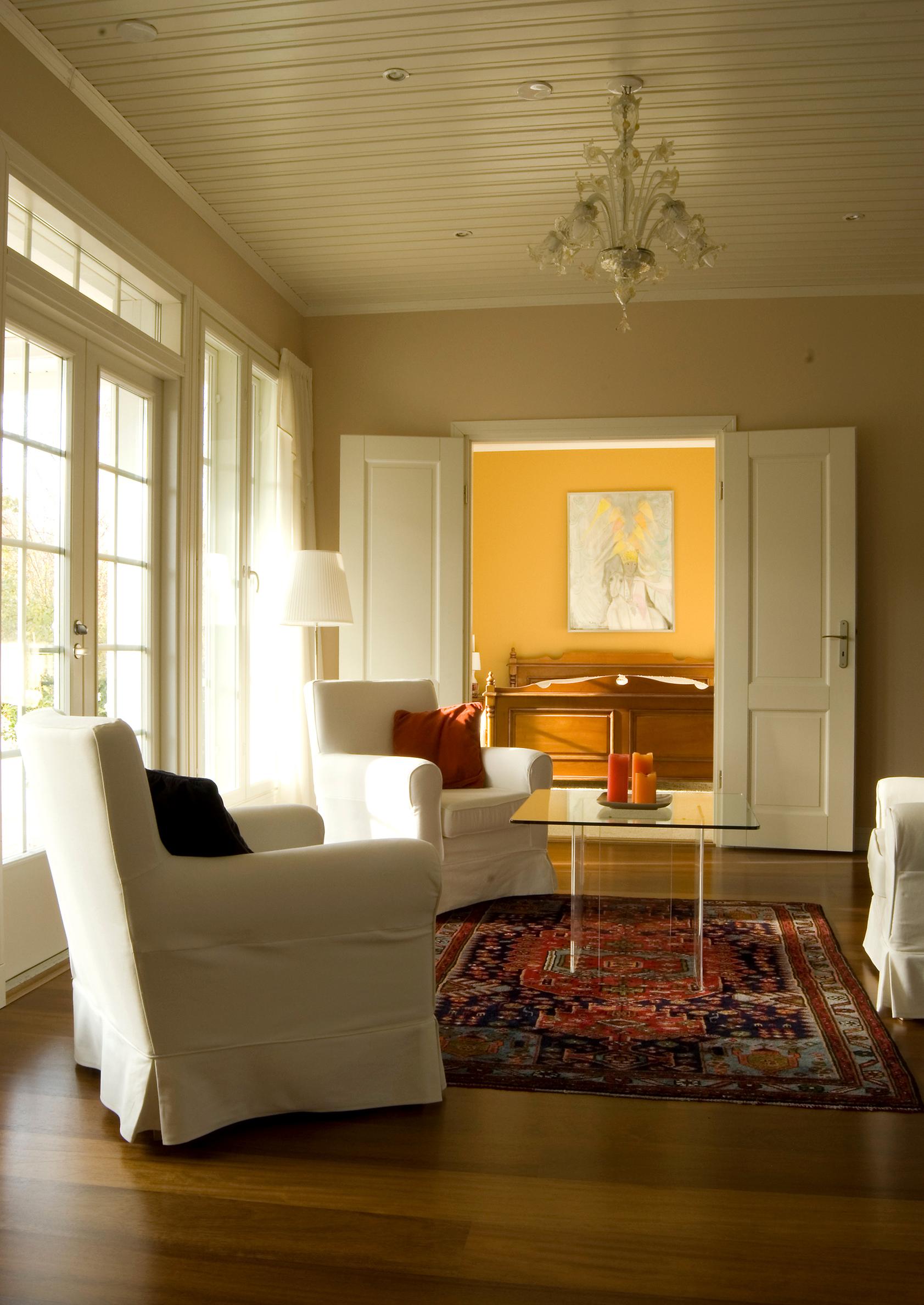 Periaatteena koko talon sisustuksessa on ollut keveyttä korostava valkoisuus sekä sen vastakohtana runsas tumman puun käyttö. Alakerran lattiamateriaaliksi valittiin Afrikan Kongosta peräisin olevaa iroko-puu.