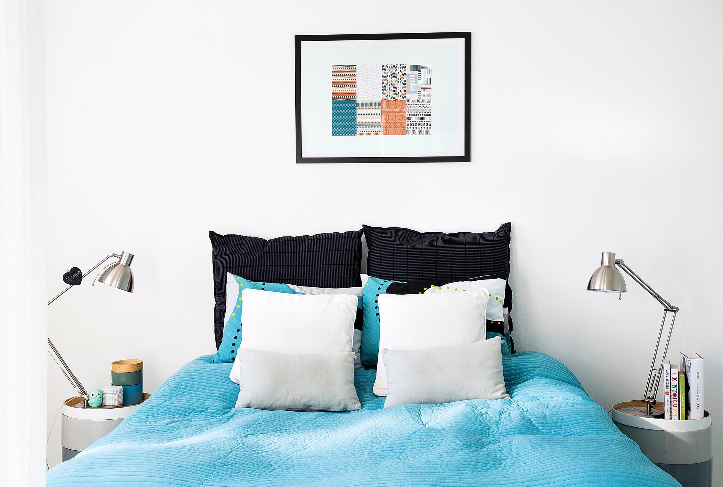 Pidämme etenkin raikkaista vihreän ja sinisen sävyistä. Vesi on meille tärkeä elementti, sillä harrastamme esimerkiksi veneilyä ja purjelautailua. Mintunmakuisen Domino-keksin sävy alkaa jo olla vitsi perhepiirissämme. Se on väri, johon en voi olla tarttumatta. Innostumme myös keltaisesta, joka toimii väriruiskeena pastellisten sävyjen rinnalla.