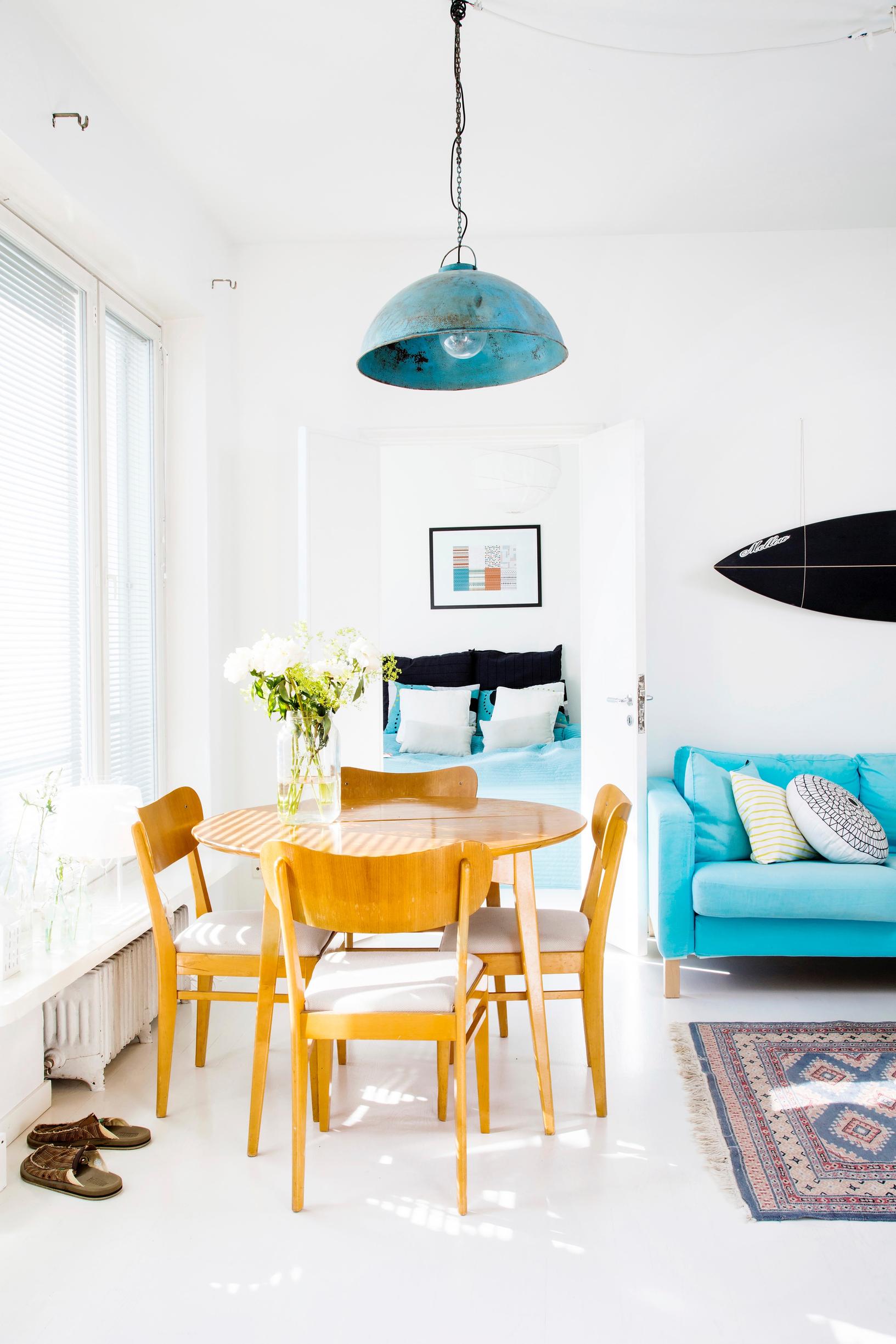 Töölöläiskolmiossa yhdistyvät taivaan ja veden sävyt. Asunto muuttui massiivisessa remontissa unelmakodiksi.