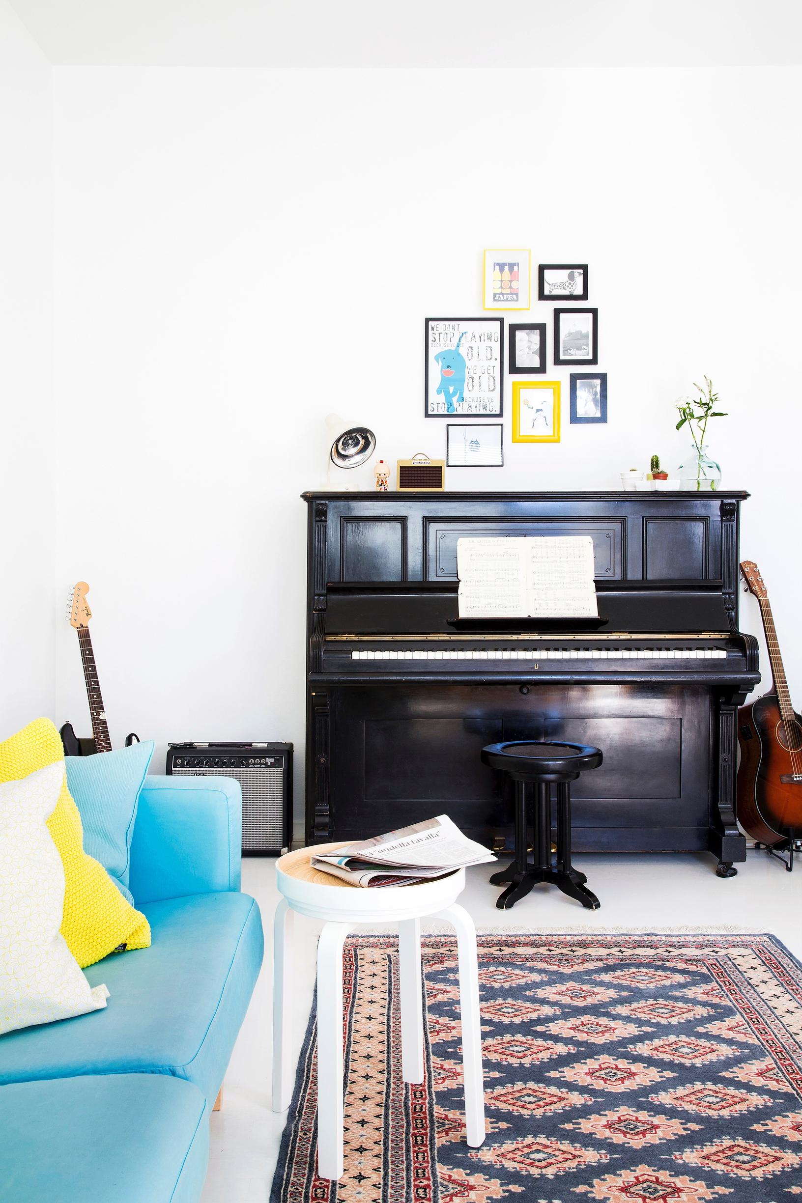 Molempien mieltymykset ja harrastukset saavat näkyä sisustuksessa. Yksi kotimme silmäteristä on musiikinopettajana toimineen isoäitini piano, joka on kulkenut mukanani asunnosta toiseen. Paulin kitarat viihtyvät sen vieressä.