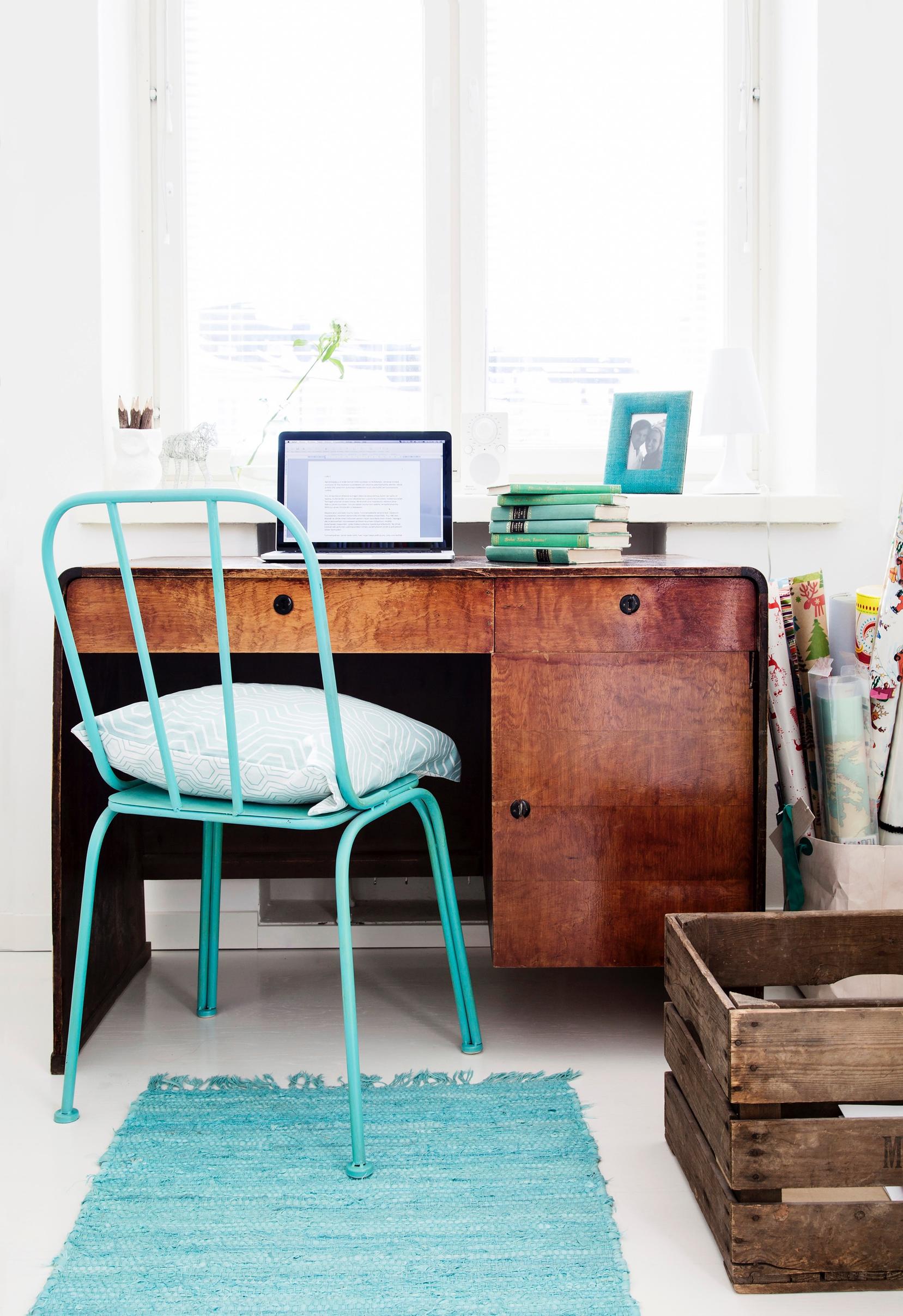 Sisustuksessamme on myös ripaus teollista tyyliä. Suurin osa rouheista huonekaluista on kirpputorilöytöjä. Parhaimmat hankinnat ovat maakunnista. Uudempien esineiden rinnalle ovat tiensä löytäneet myös suvun 1950–60-luvuilta peräisin olevat huonekalut. Niitä on varastoitu perheemme kesäpaikassa.