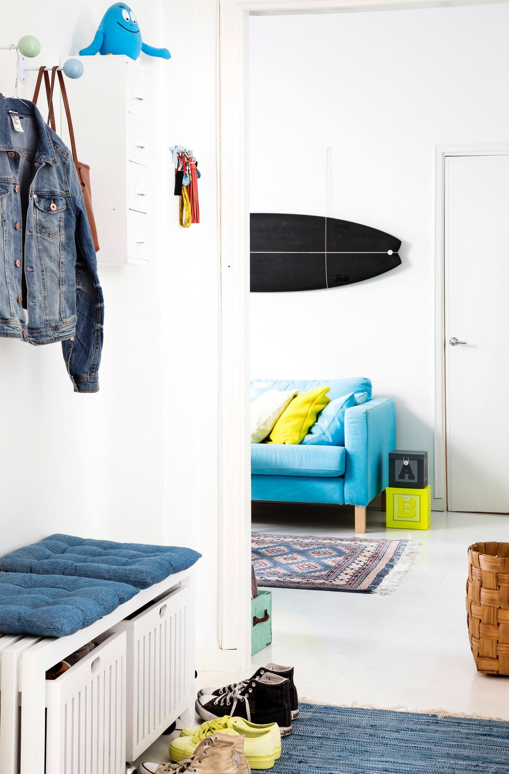Olohuoneen seinällä, sohvan yläpuolella, komeilee surffilauta, joka tarttui Paulin mukaan työmatkalta Japanista. Työhuoneessa on kesäisin Paulin treenipyörä, talvisin molempien laskettelusukset. Tosin urheiluvälineet saavat väistyä pian, sillä työhuone sisustetaan uusiksi lokakuussa syntyvälle vauvallemme.