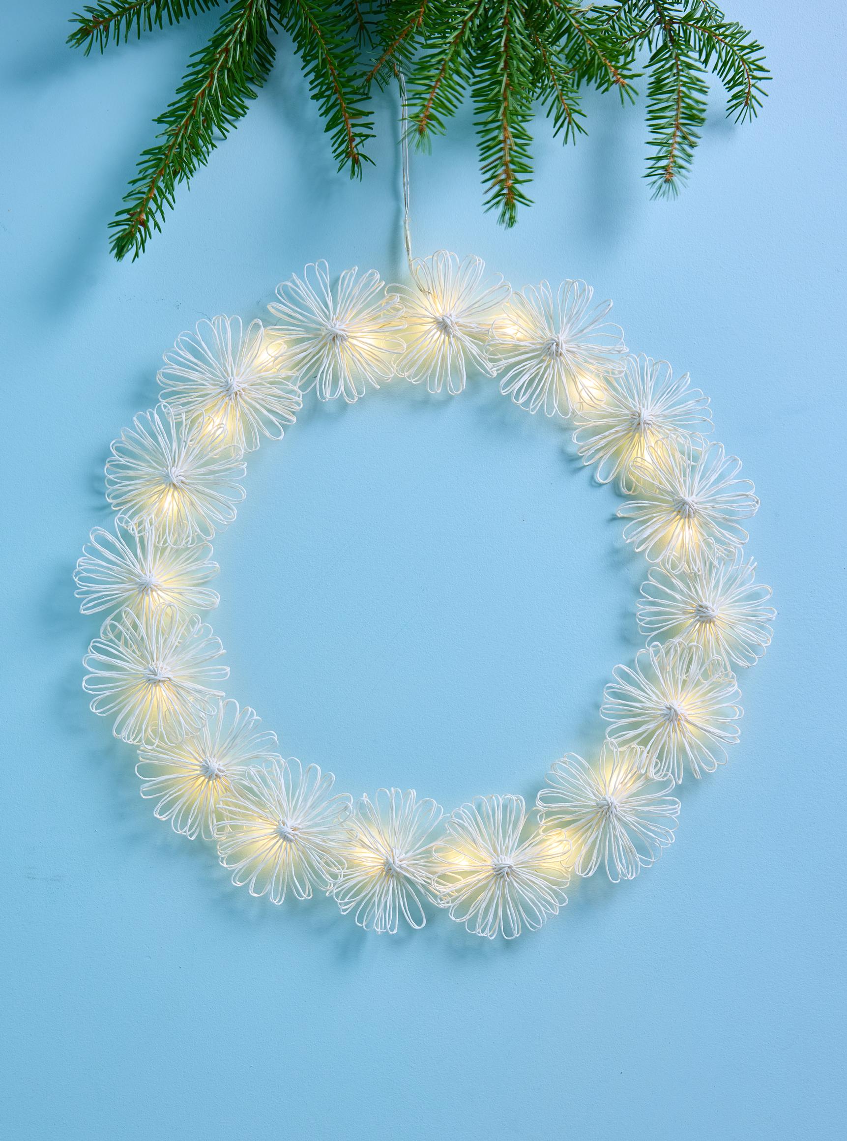 Vinkki! Saat kranssiin lisää säihkettä, kun kieputat kukat kimallelangasta.
