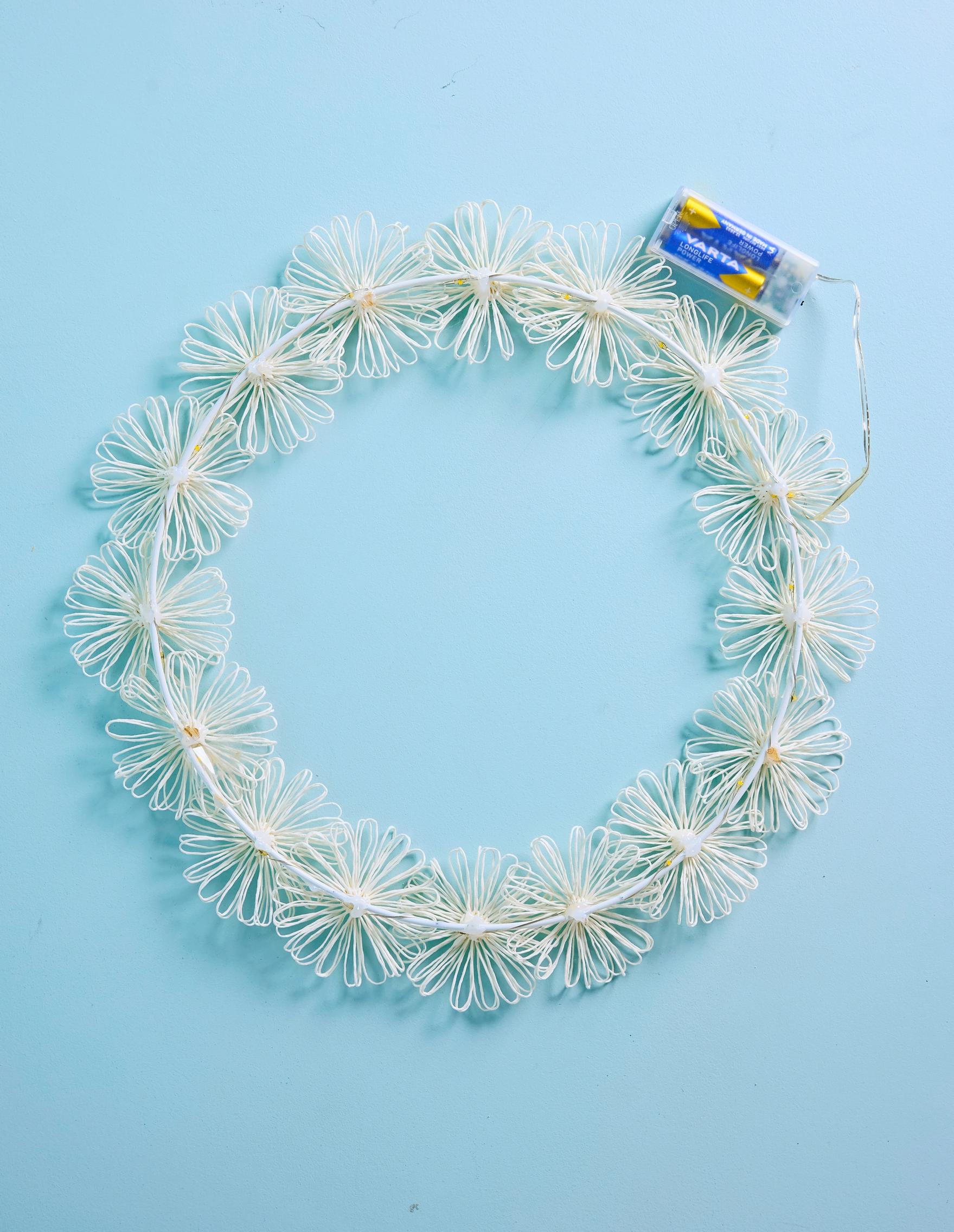 - Irrota kukka renkaasta nostamalla terälehdet yksitellen tapeista. Kieputa led-valosarja metallirenkaaseen.