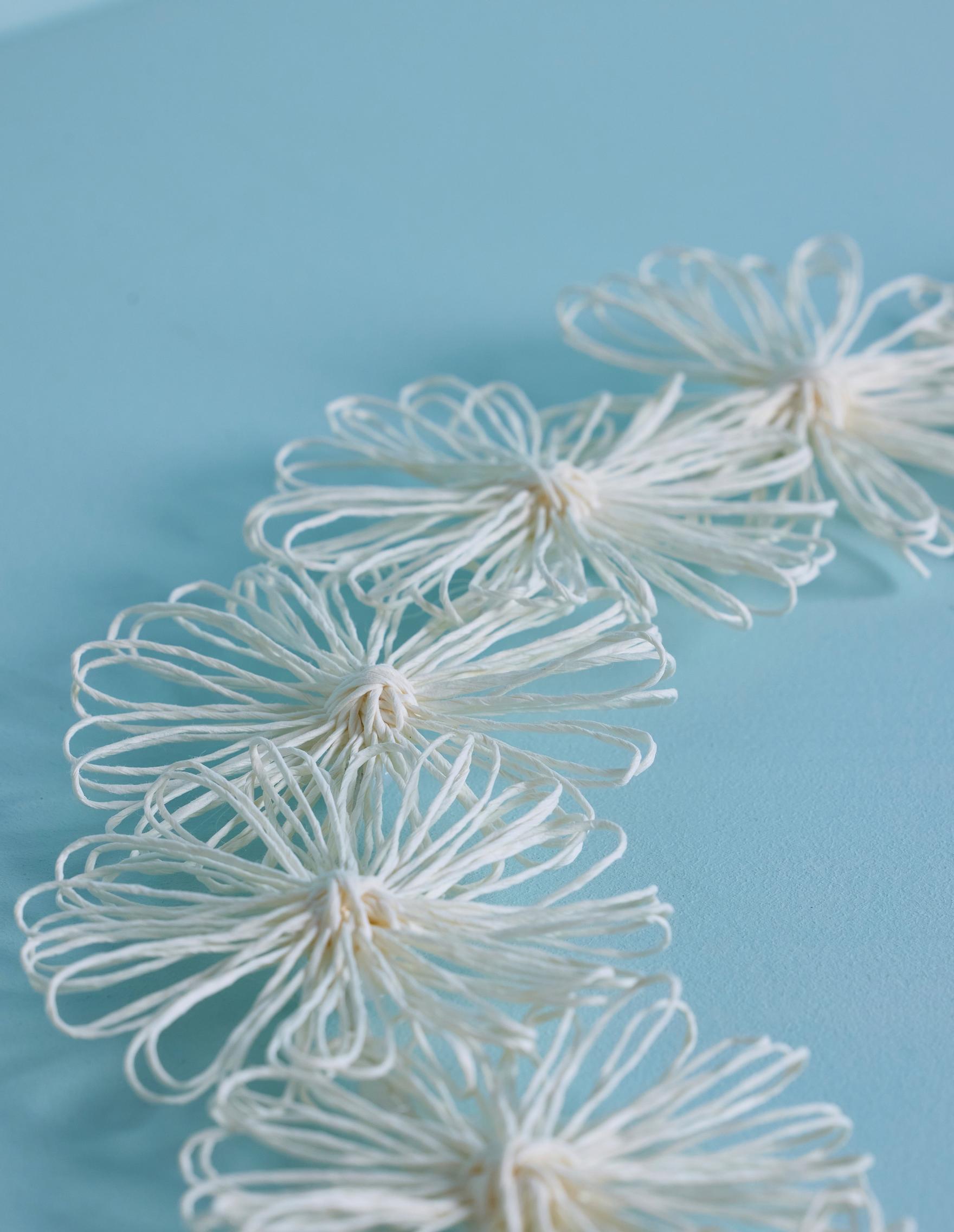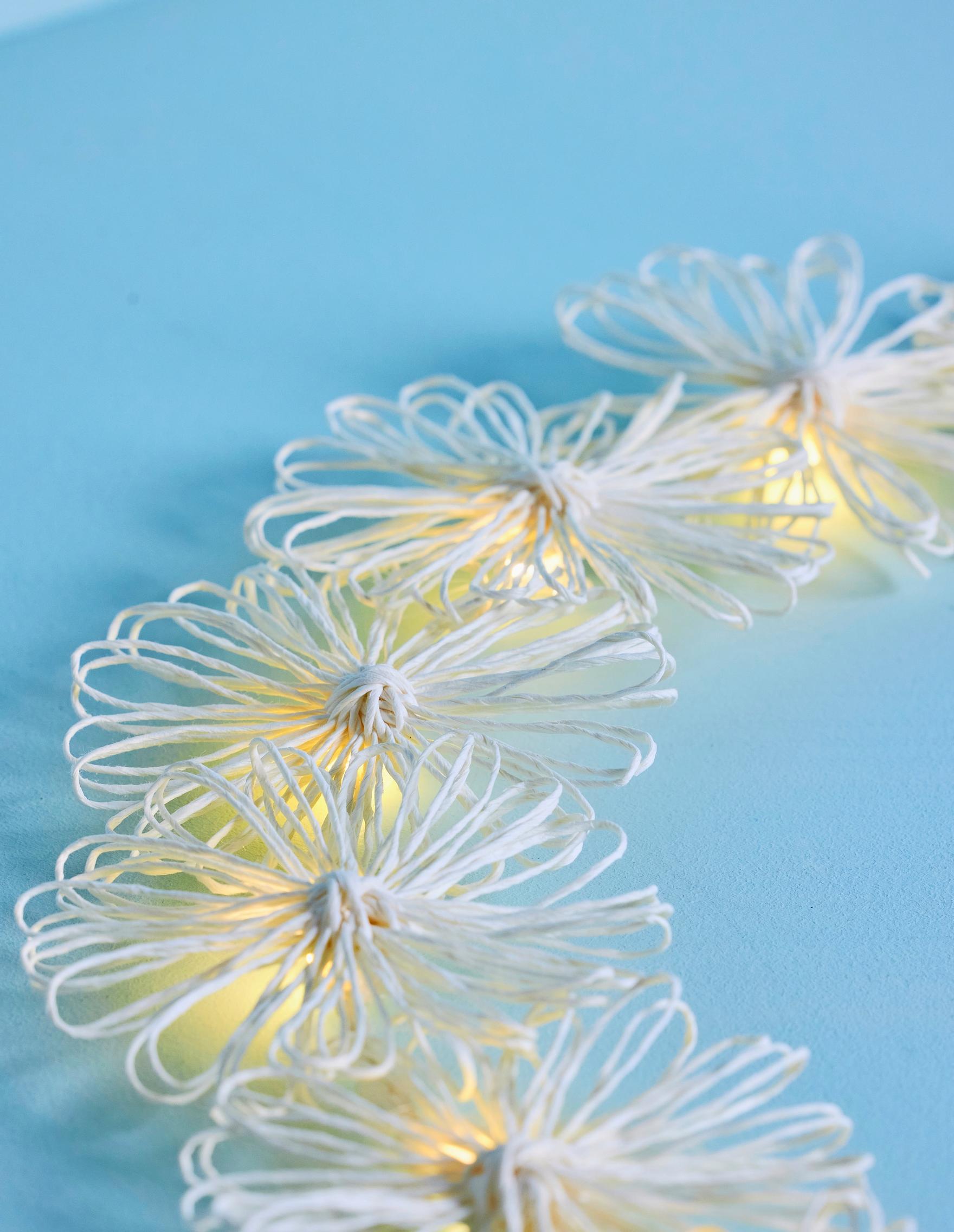 Paperinarusta kieputat helposti kukkia neulerenkaan avulla. Kiinnitä kukat kranssirenkaaseen, pujota mukaan valosarja ja ripusta ikkunalle tai seinälle.