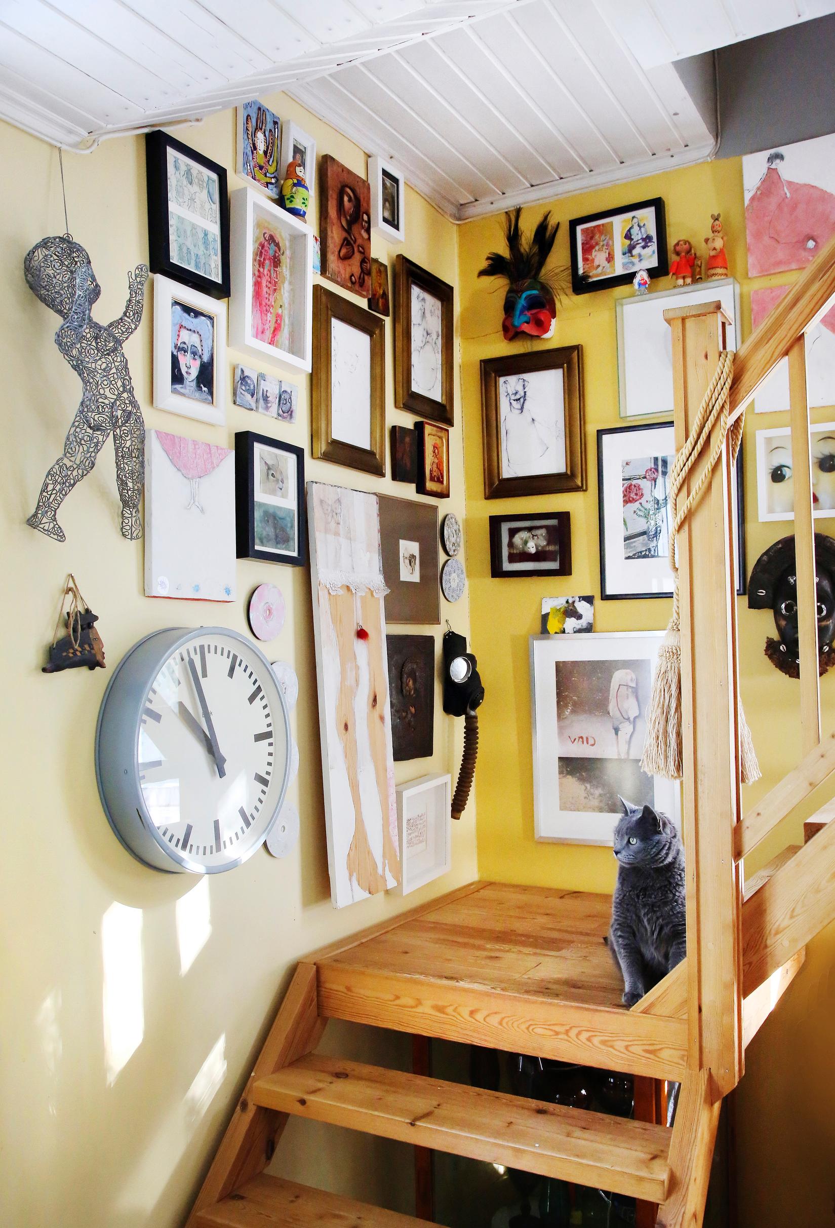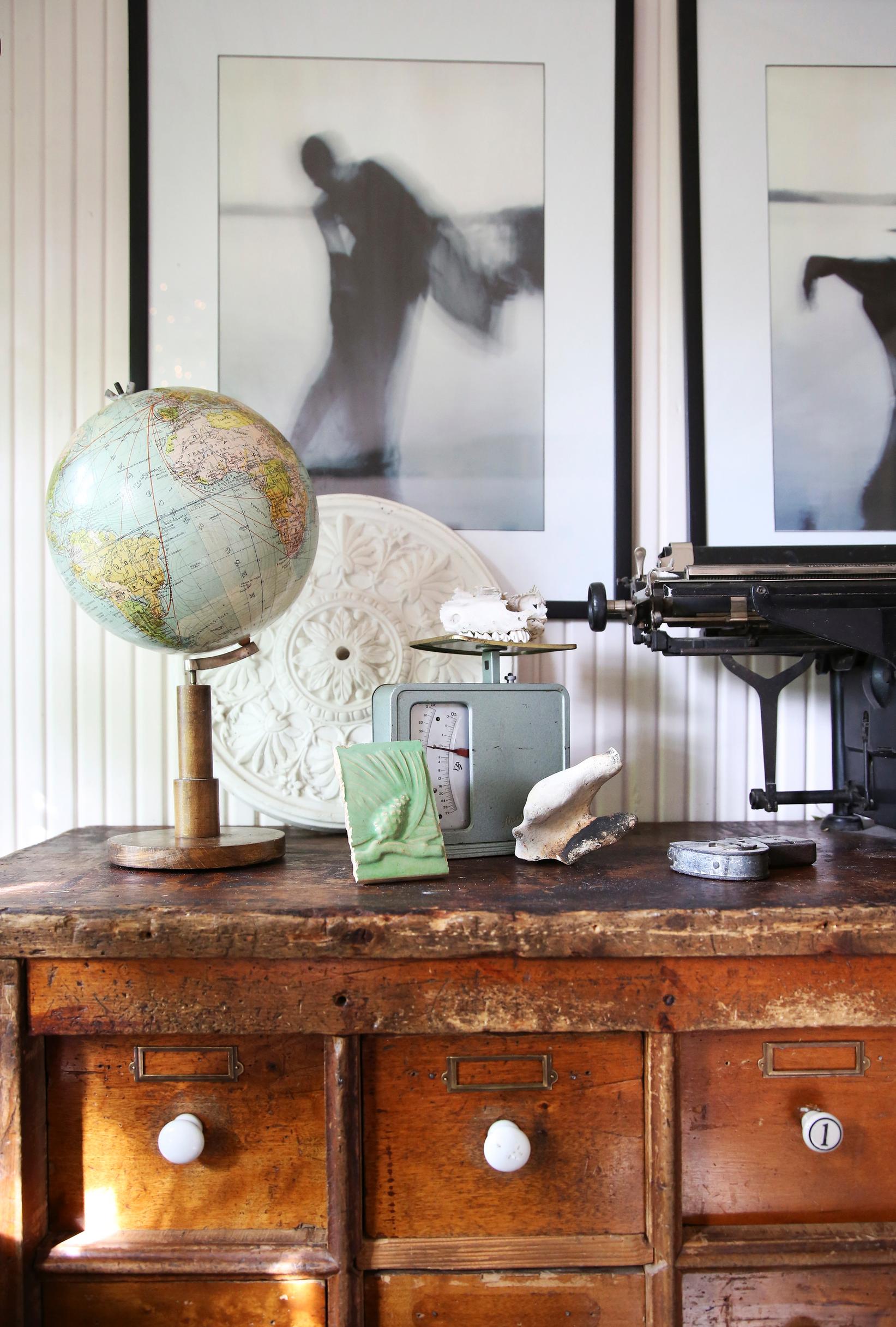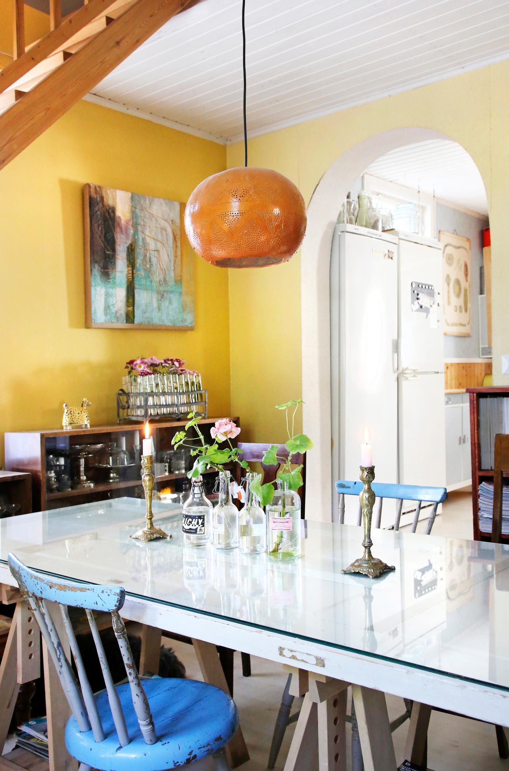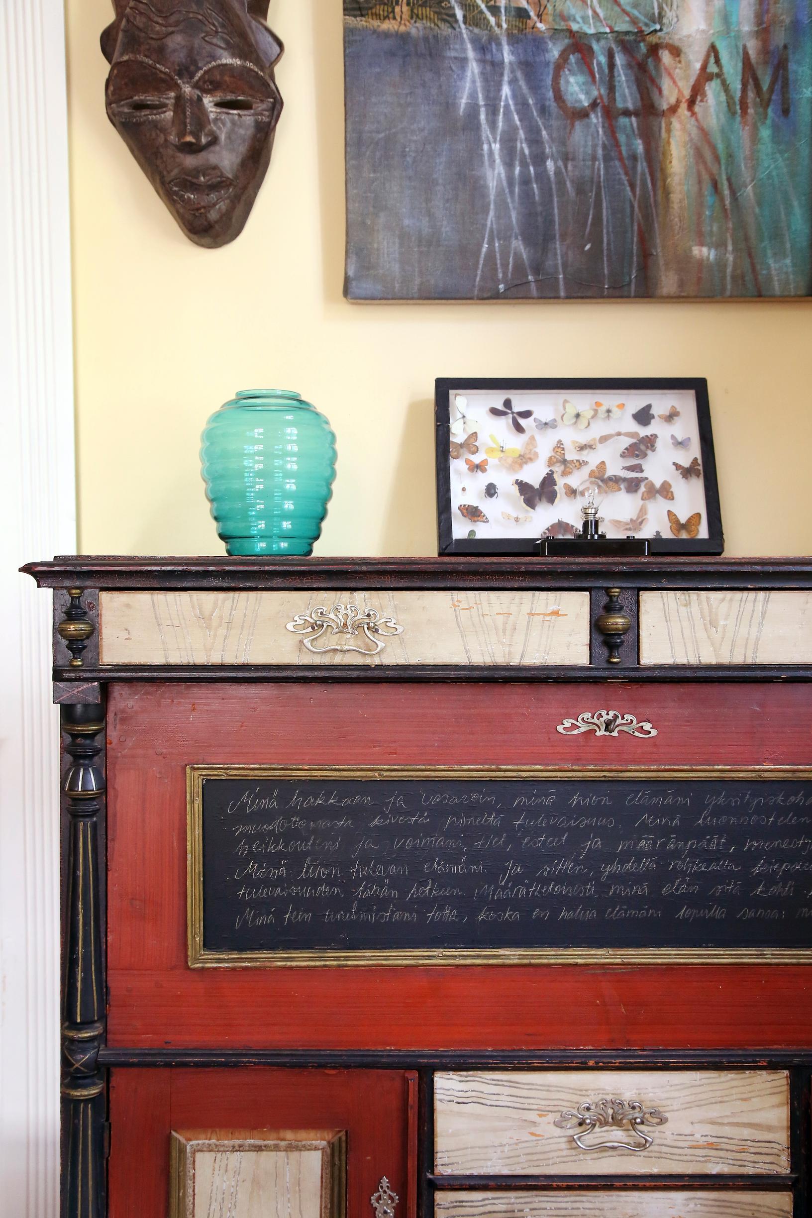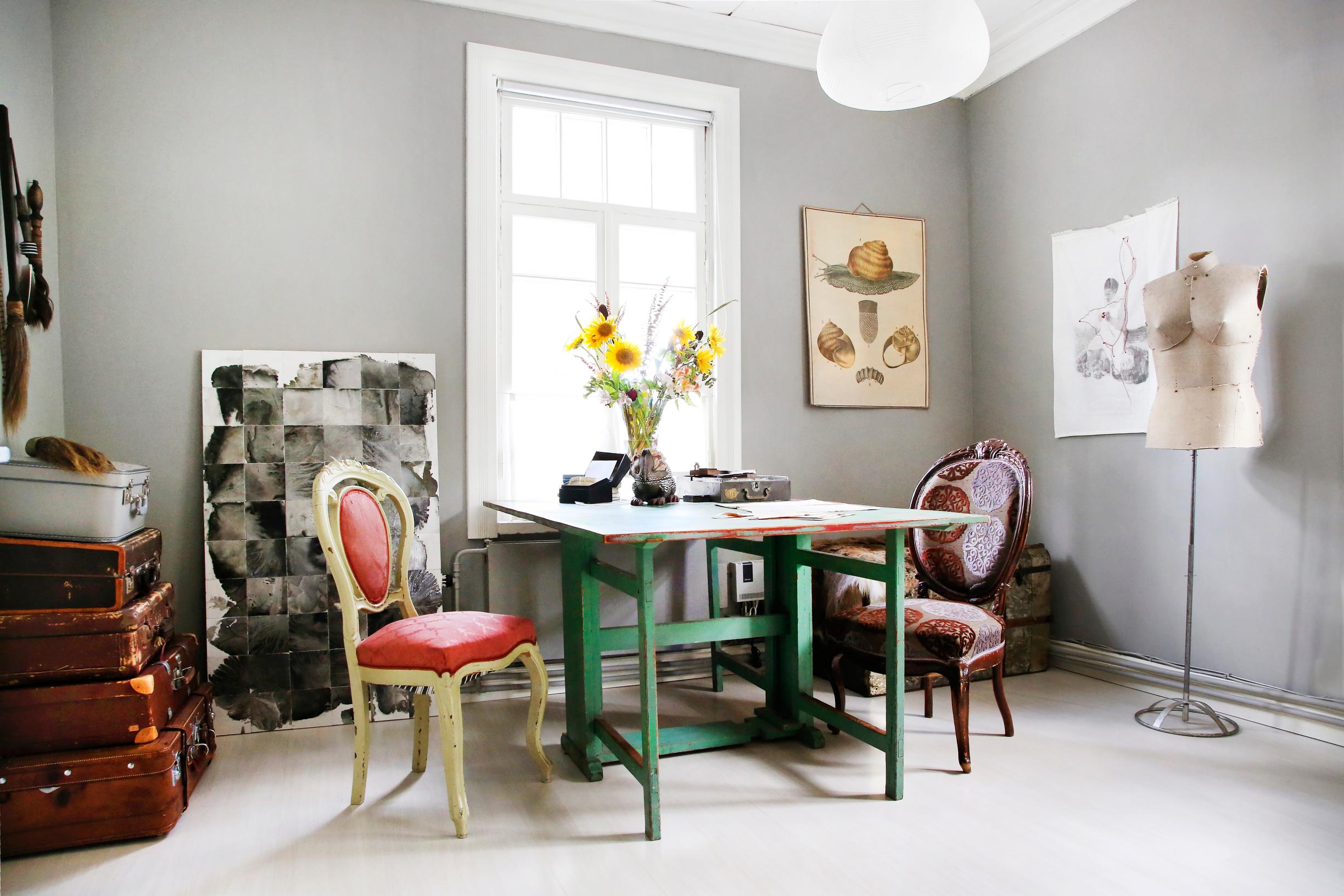 Uutta ei kotoamme juuri löydy, kaikki on joko perittyä tai kirppari- ja roskalavalöytöjä. Huoneen sisustus syntyy usein jonkin asian, vaikka ystävältä saadun taulun, ympärille. Rakennan mielelläni näkymiä ja asetelmia. Oudot esineet kiehtovat, ne tuovat sopivasti kontrastia.