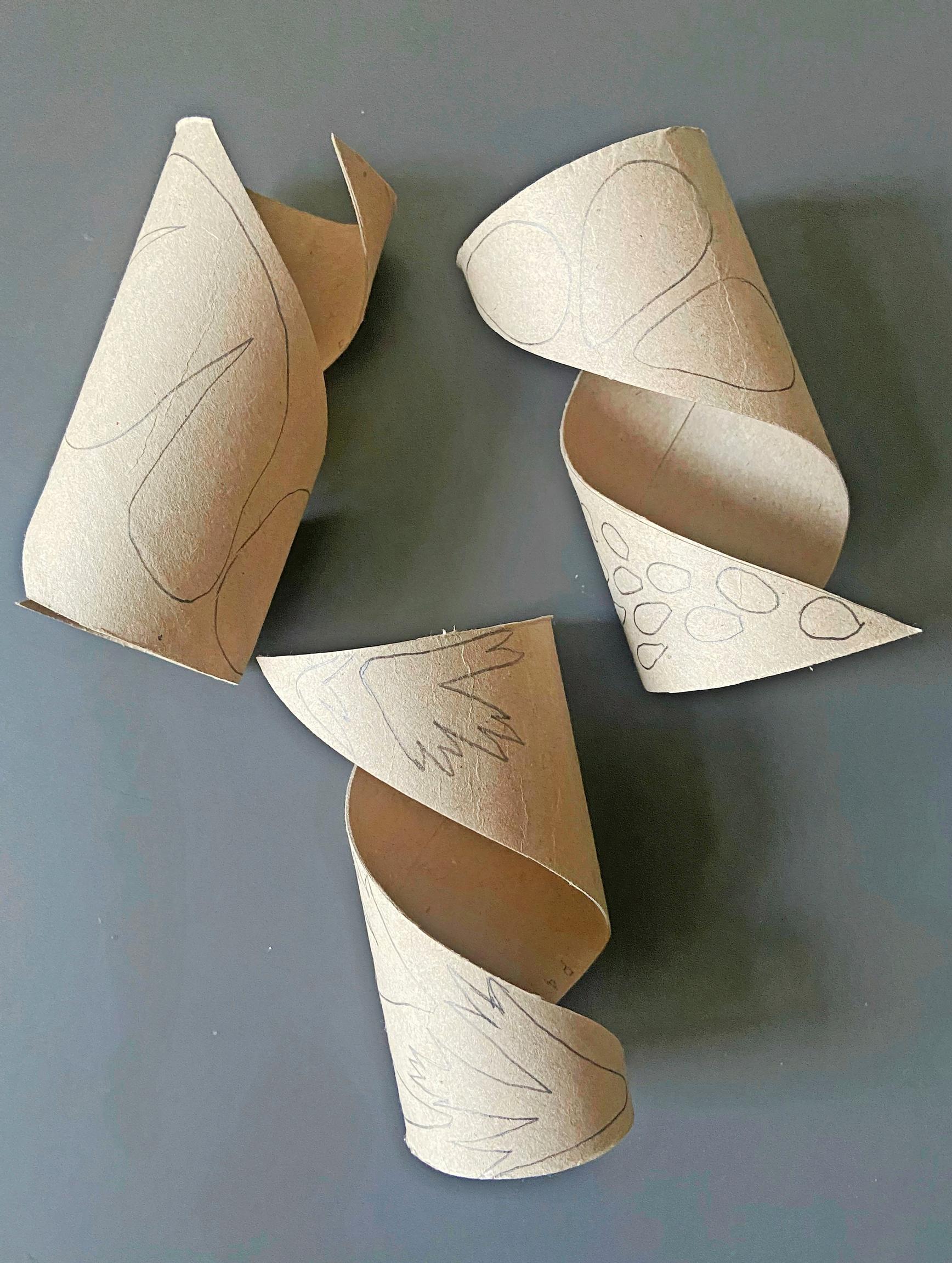 1. Leikkaa pahvihylsyt saumoja pitkin auki ja piirrä niiden kuperalle puolelle kasvitauluun tarvittavat osat. Tee ainakin tyylitelty kasvi juurineen sekä suurennetut terälehdet, kukinto ja siemenen poikkileikkaus. Halutessasi voit tehdä myös siemenkodan, emin ja heteet.