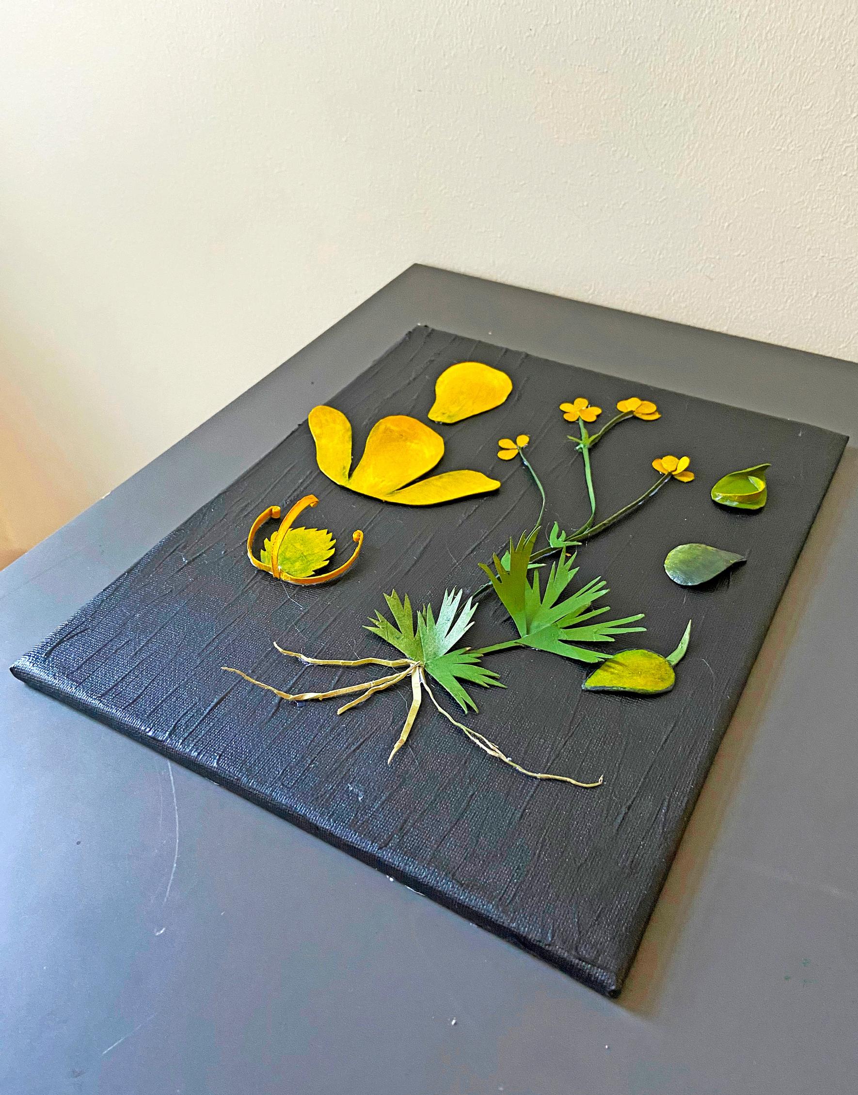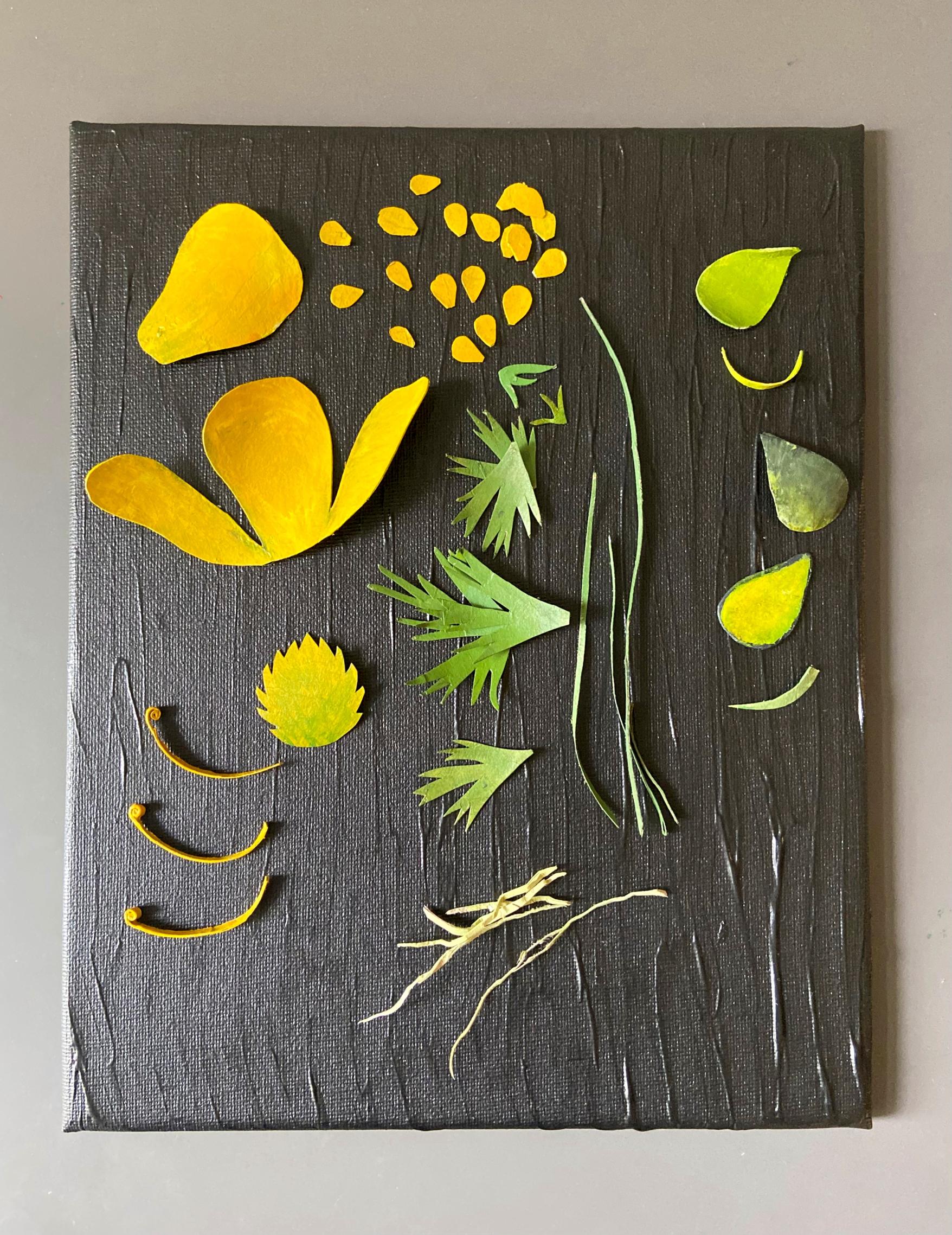 4. Sommittele ja liimaa kasvin osat paikoilleen. Jätä taulun alareunaan tilaa kasvin nimelle. Käytä liimaa vain osien reunoissa tai keskellä. Näin osat ikään kuin kasvavat taulusta ulos, eivätkä liimaannu litteiksi sen pinnalle.