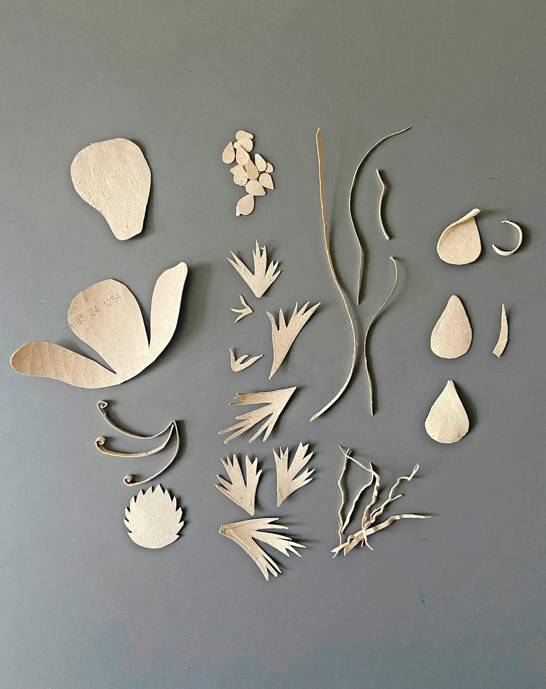 2. Leikkaa osat irti. Voit taivutella osia vielä kaarevammiksi tai tehdä niihin vaikka taitoksia. Esimerkiksi juurisuikaleista saa todellisen näköiset rypistelemällä, ja heteiden päät onnistuvat suikaletta rullaamalla.