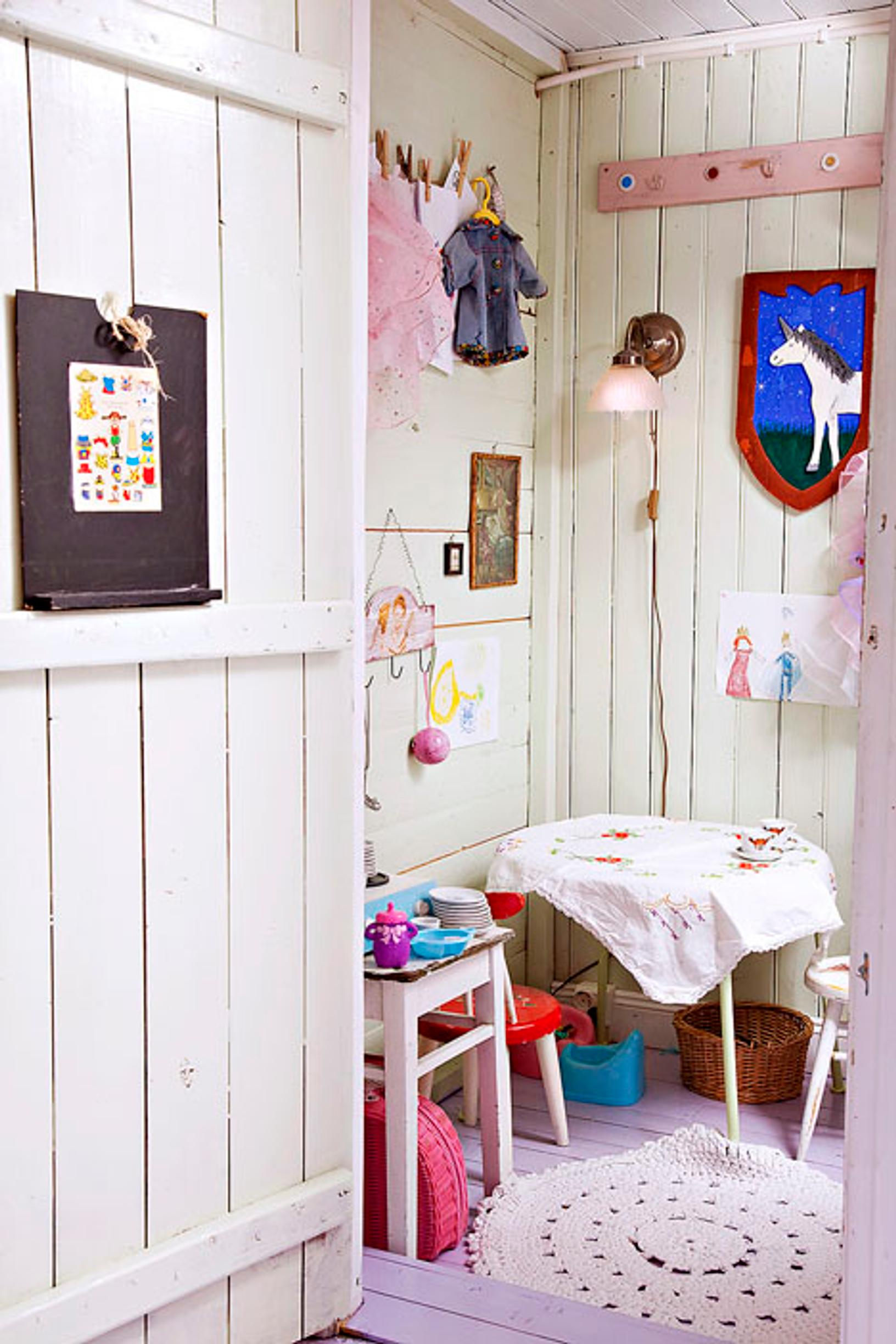 Lastenhuoneen yhteyteen rakennettu sisäleikkimökki on täynnä Lyydian aarteita. Lasten askartelut ripustetaan kauniisti esille.