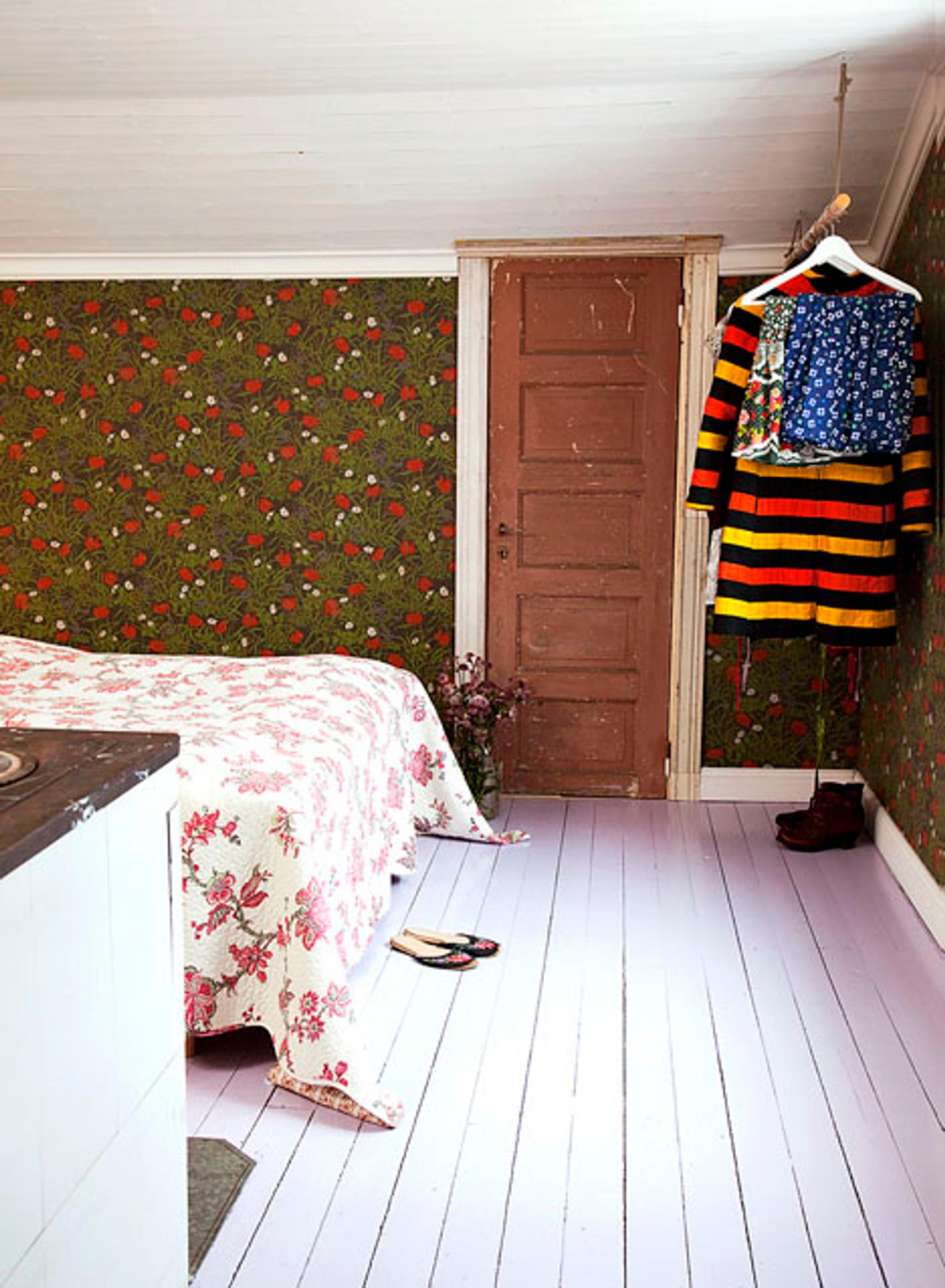 Vanhempien makuuhuoneen pintoja koristavat erilaiset kukat. Kauneimmat vaatteet riippuvat katosta ripustetussa vaaterekissä.