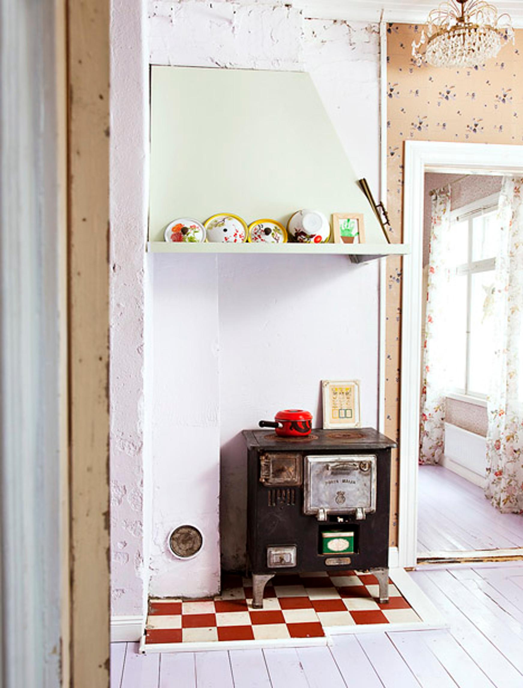 Keittiön rakkain aarre on ystäviltä saatu Porin Maija -puuhella. Käytännöllinen laattamatto ja koristeellinen kristallikruunu luovat veikeän kontrastin tilaan.