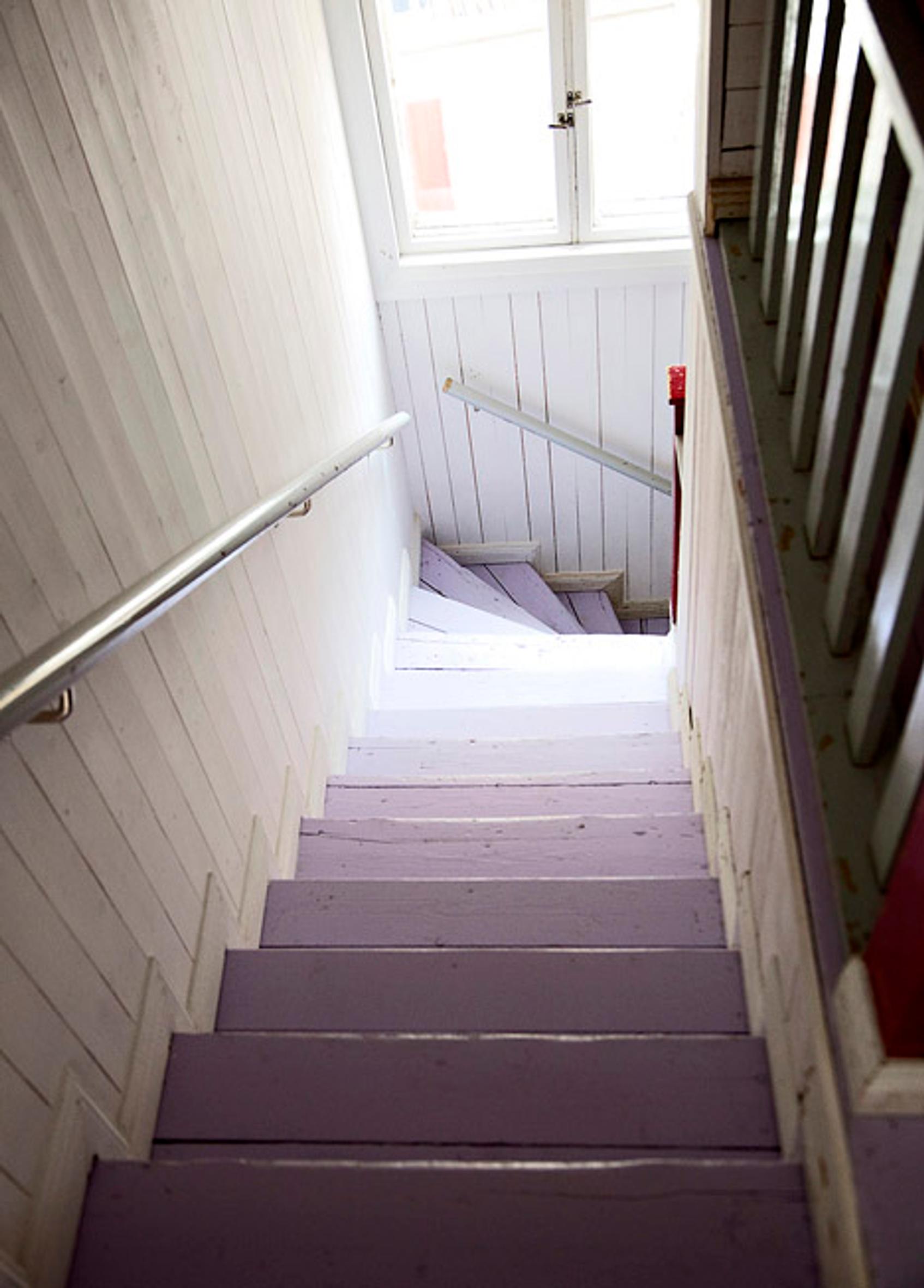 Kerroksia yhdistävään portaikkoon tulvii valoa suuresta ikkunasta. Portaikon kaiteet on pelastettu purkutalosta.