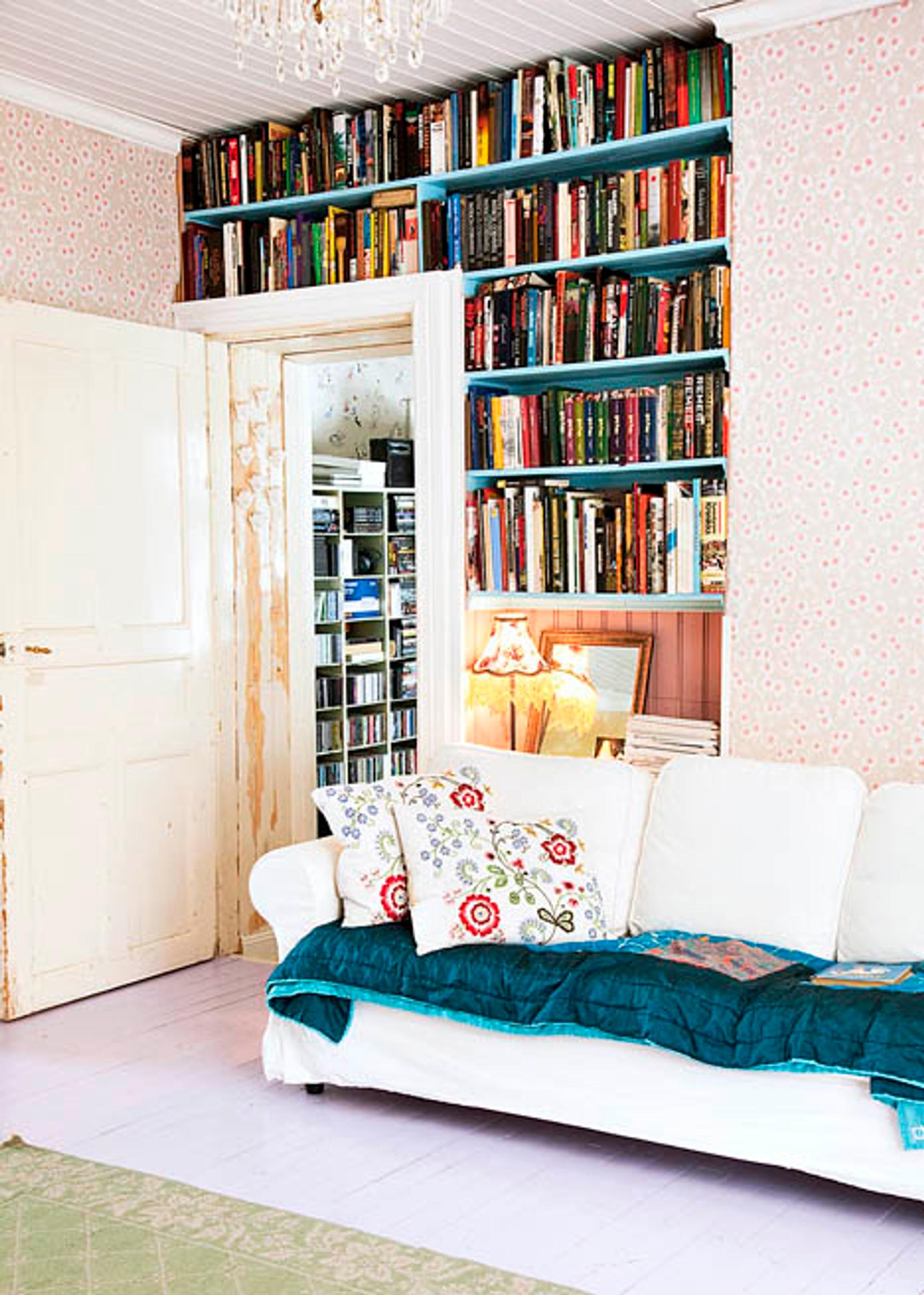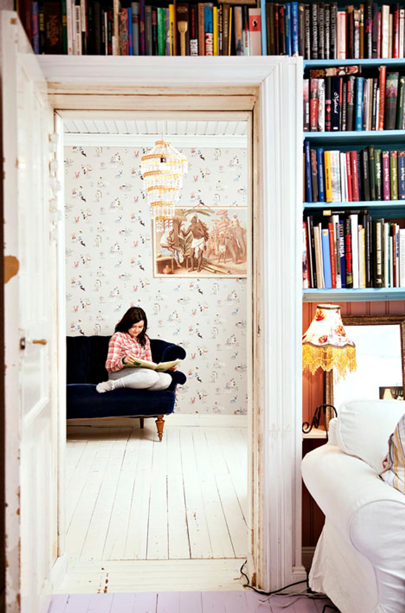 Remontissa kirjoille syntyi paikka kuin itsestään työhuoneen oven ympärille. Aulan valkealla Ikean sohvalla on mukava lekotella.