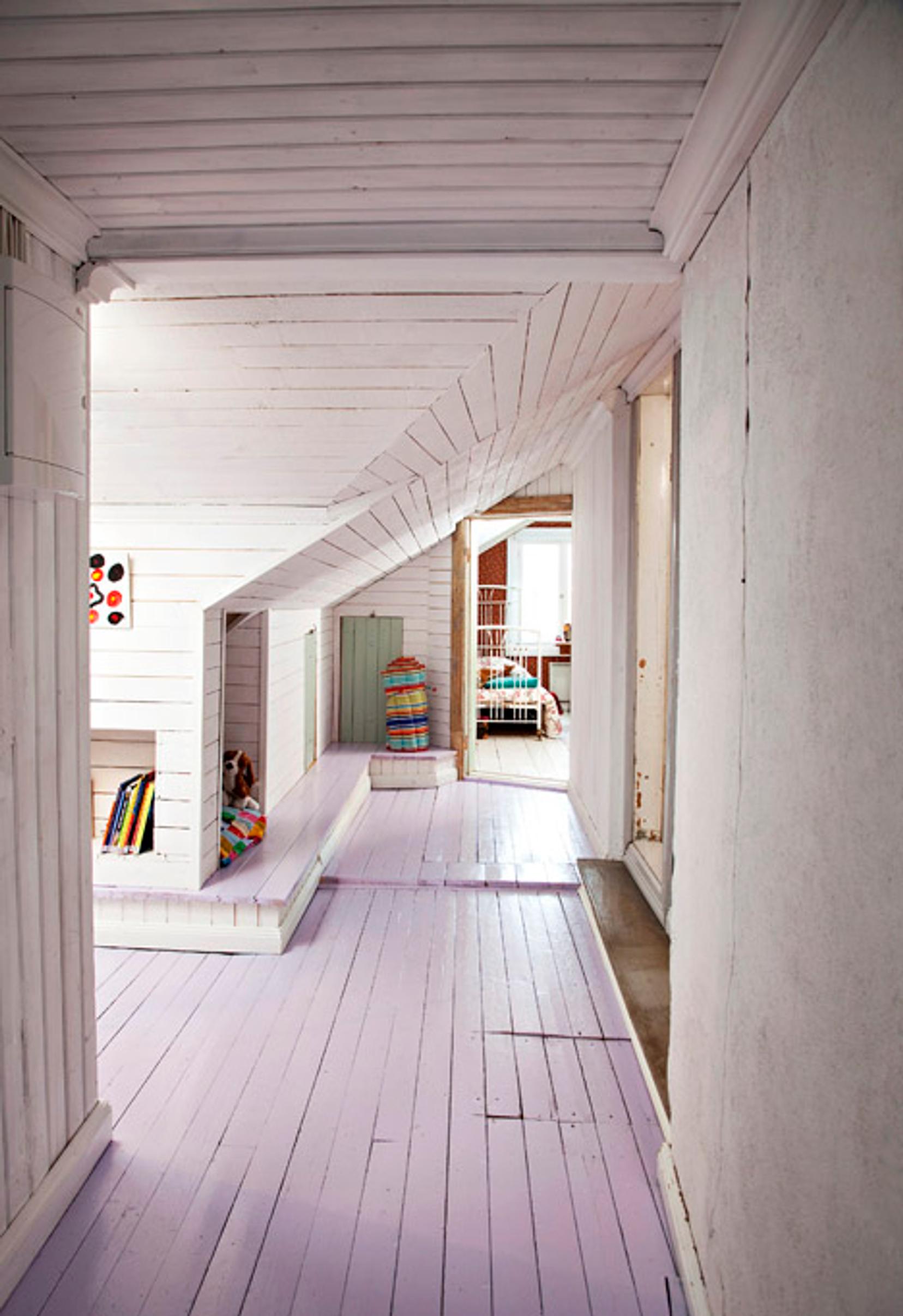 Yläkerta on lasten valtakuntaa. Viistokattoisen käytävän varrelle on rakennettu koloja ja salasopukoita. Mintunvihreistä ovista on käynti ullakolle. ”Noudatamme talon aikakauden tyyliä, mutta emme ole turhan tarkkoja siitä, että kaiken pitäisi olla aina samaa paria. Yläkerran kattolistoissakin voi olla kolmea eri profiilia samassa huoneessa”, kertovat Tommi ja Karoliina.