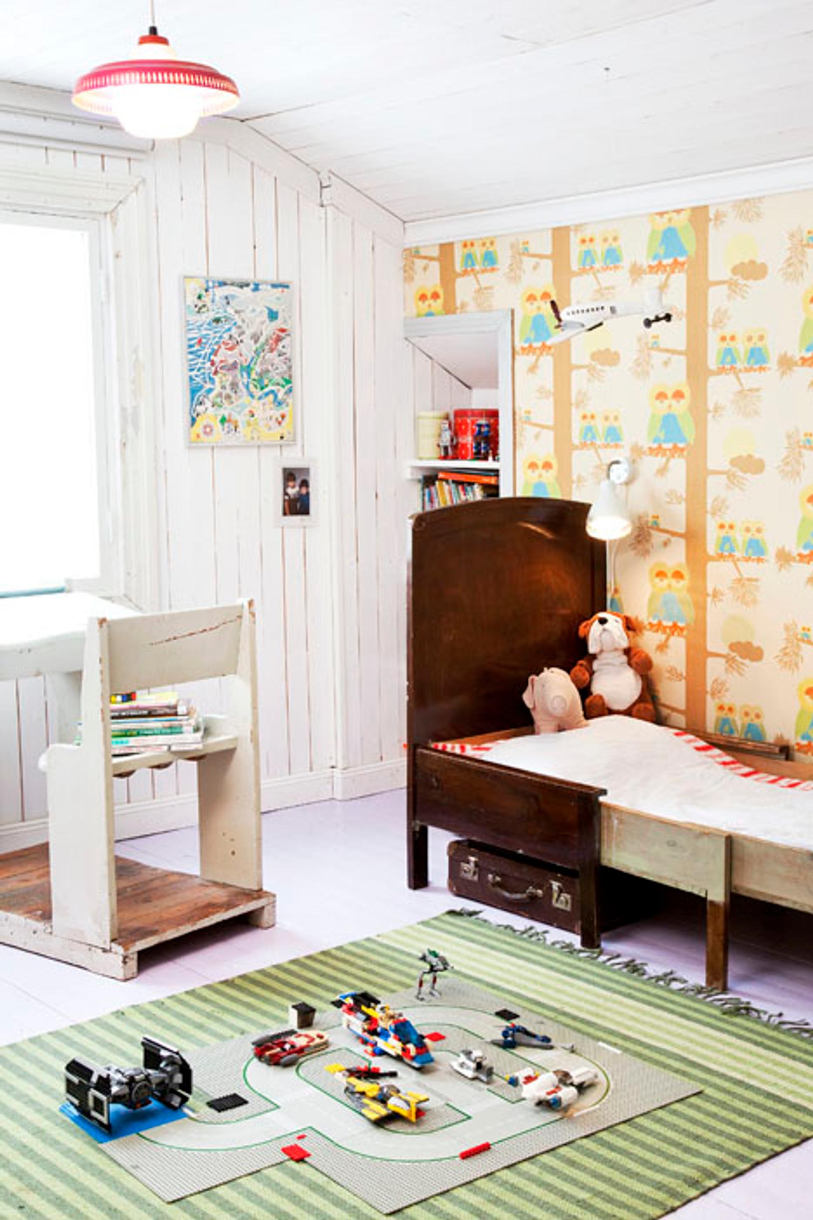 Myös Lyydian ja Leonardon yhteisessä huoneessa kaikki huonekalut ovat vanhoja ja sopivasti patinoituneita. Karkea lautaseinä on hyvä pari Pihlgren & Ritolan Pöllö-tapetille.