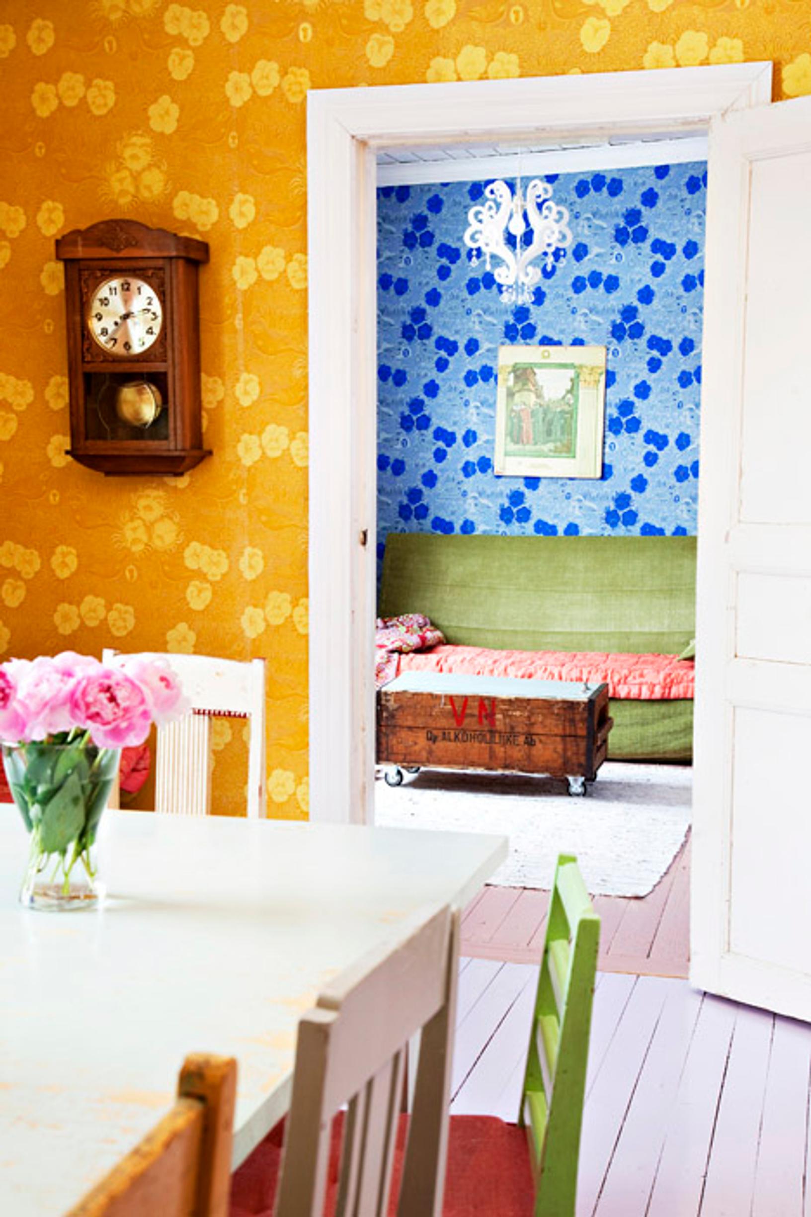 Ruokailuhuoneesta on näkymä olohuoneeseen. Birger Kaipiaisen Pihlgren & Ritolalle suunnittelema Kiurujen yö -tapetti yhdistää molempia tiloja. Keltainen ja sininen luovat mielenkiintoisen tunnelman vierekkäisiin huoneisiin.