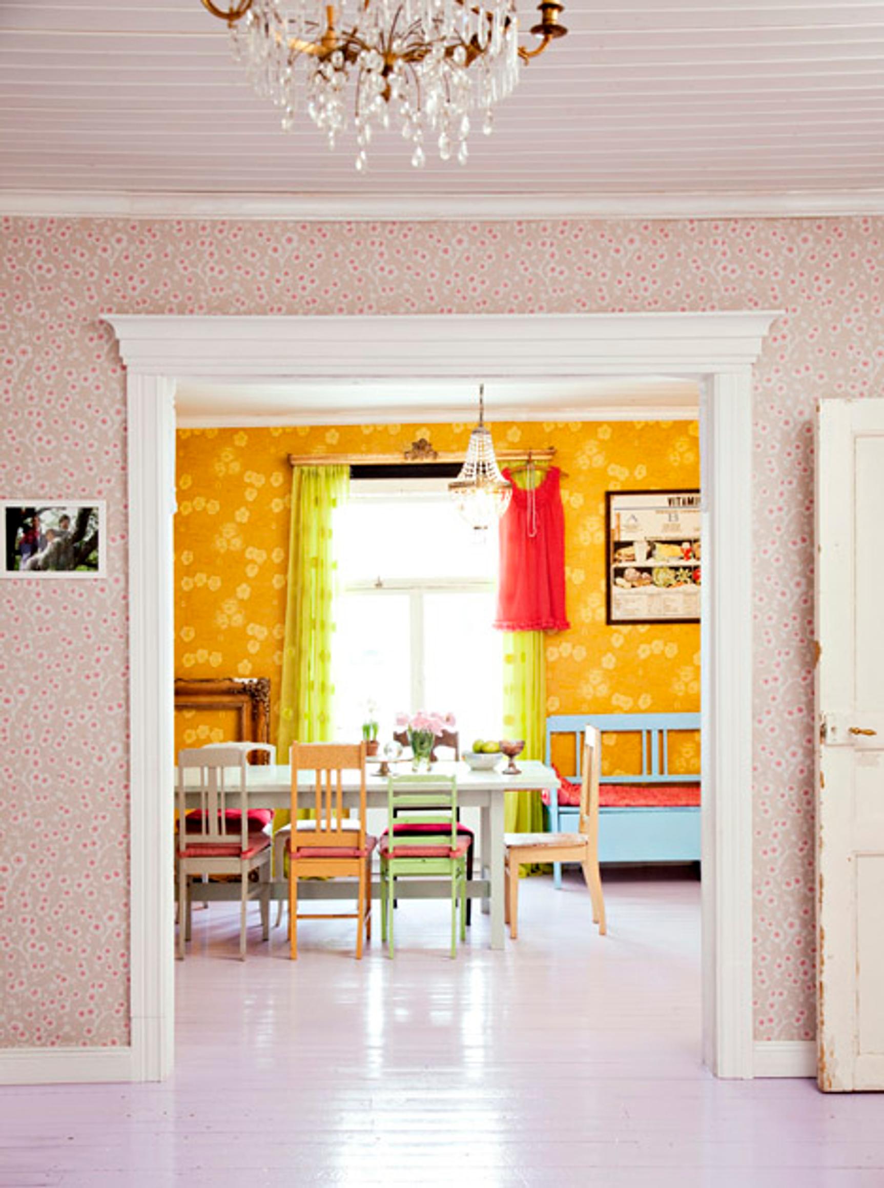 Aulaa sulostuttava Pihlgren & Ritolan Kirsikkapuu-tapetti johdattaa katseen värikkääseen ruokailuhuoneeseen. Tuolit suuren pöydän ympärillä saavat olla reilusti eri paria. Värikkäät yksityiskohdat luovat iloista tunnelmaa.