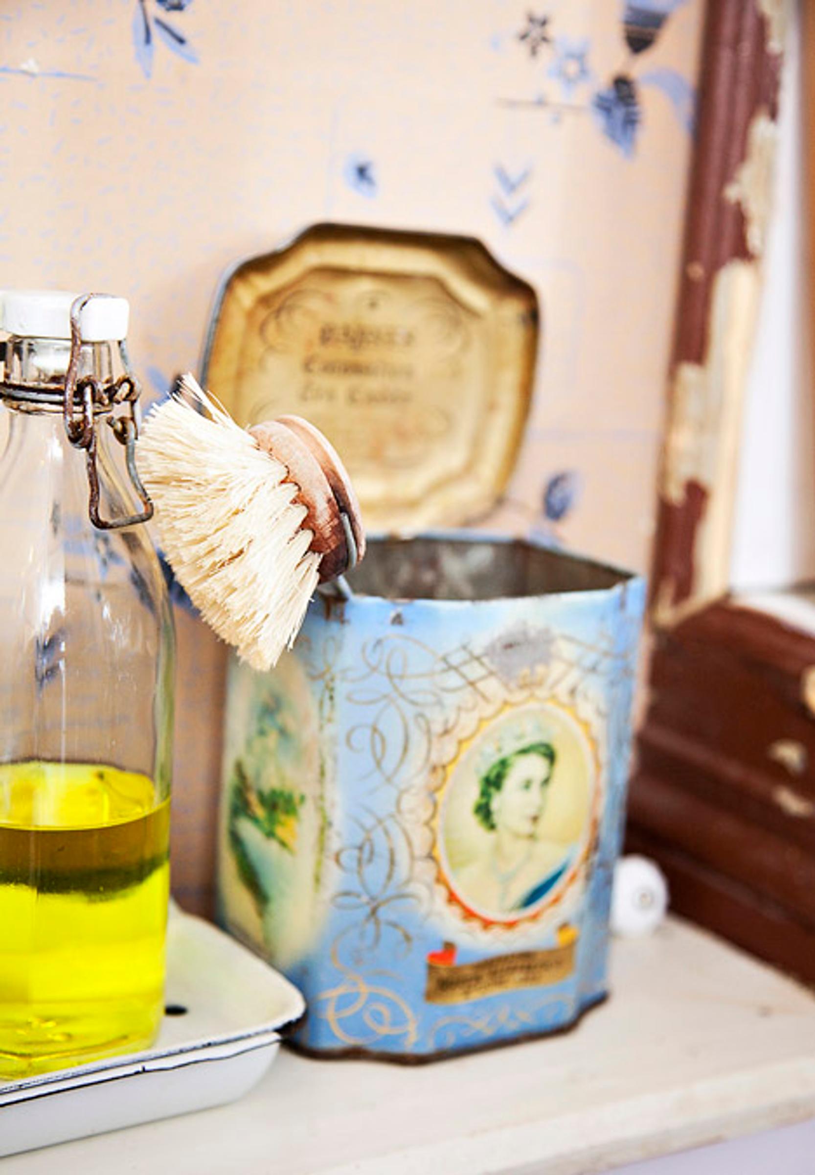 Tiskialtaan reunalla käyttötavarat pysyvät hyvässä järjestyksessä vanhoissa purkeissa.