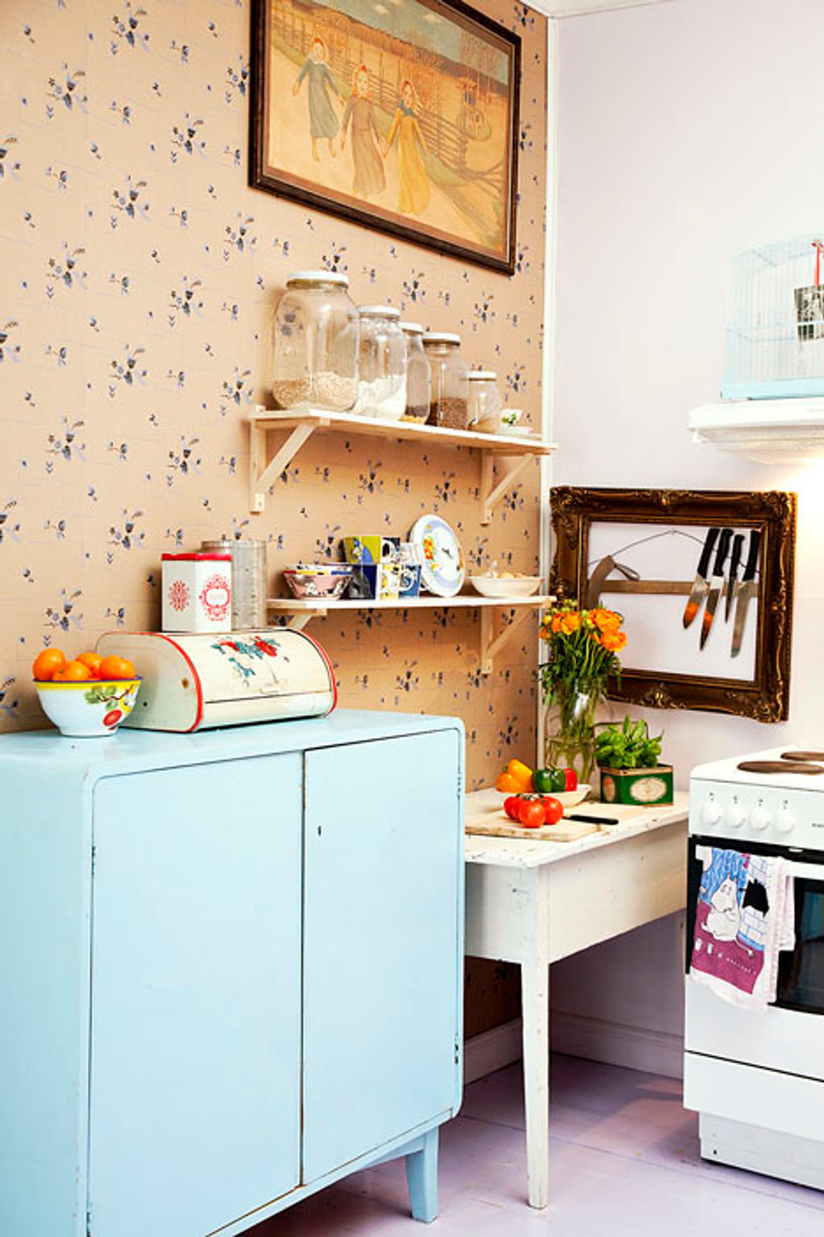 Keittiön tason virkaa hoitaa vanha kirjoituspöytä, ja astiat ovat löytäneet paikkansa vanhasta liinavaatekaapista. Pihlgren & Ritolan pehmeäsävyinen Kaneli-tapetti on hyvä tausta tunnelmalliseen keittiöön.