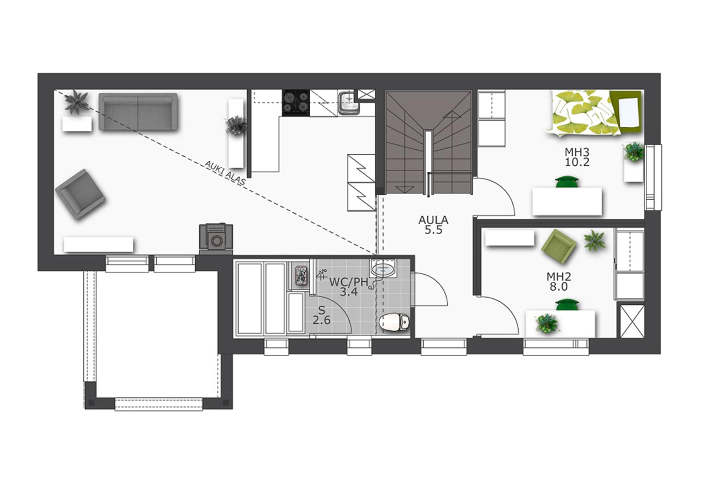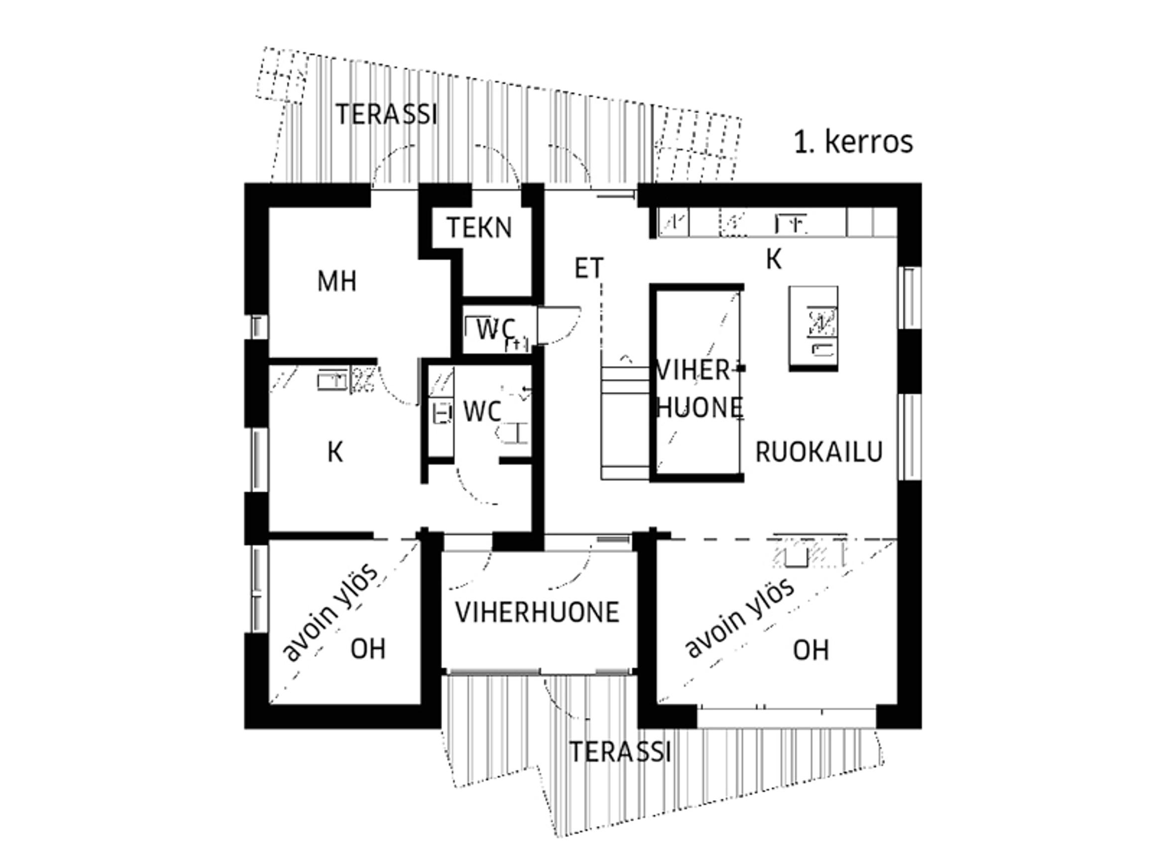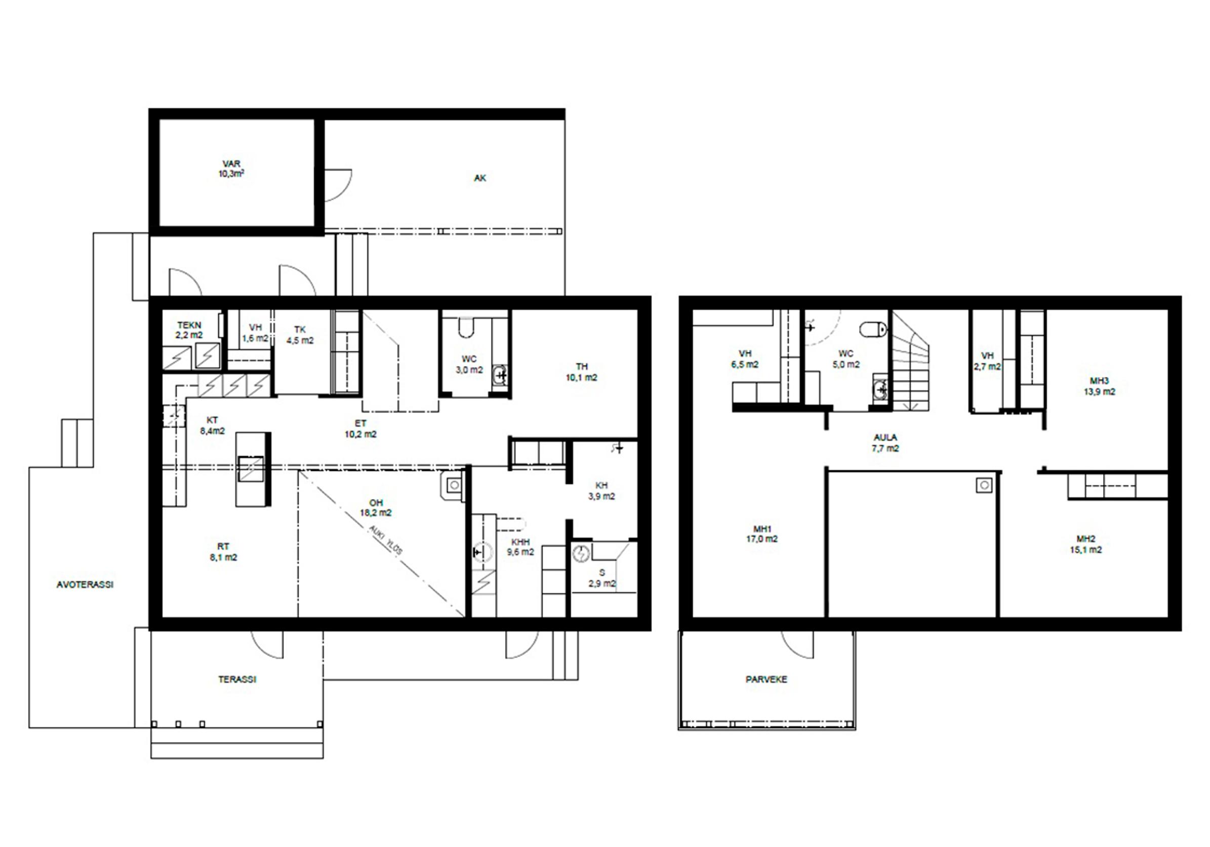 Erityistä: Arkkitehtuuriltaan selkeälinjaisen ja modernin talon sydän on keittiön, ruokailutilan ja korkean olohuoneen muodostama tilakokonaisuus. Suunnittelun lähtökohtana oli tehdä terve talo hengittävillä ja hyvän sisäilman takaavilla materiaaleilla sekä rakenteilla. Asuintilojen lisäksi talosta löytyy perheen äidin yrityksen työtilat.