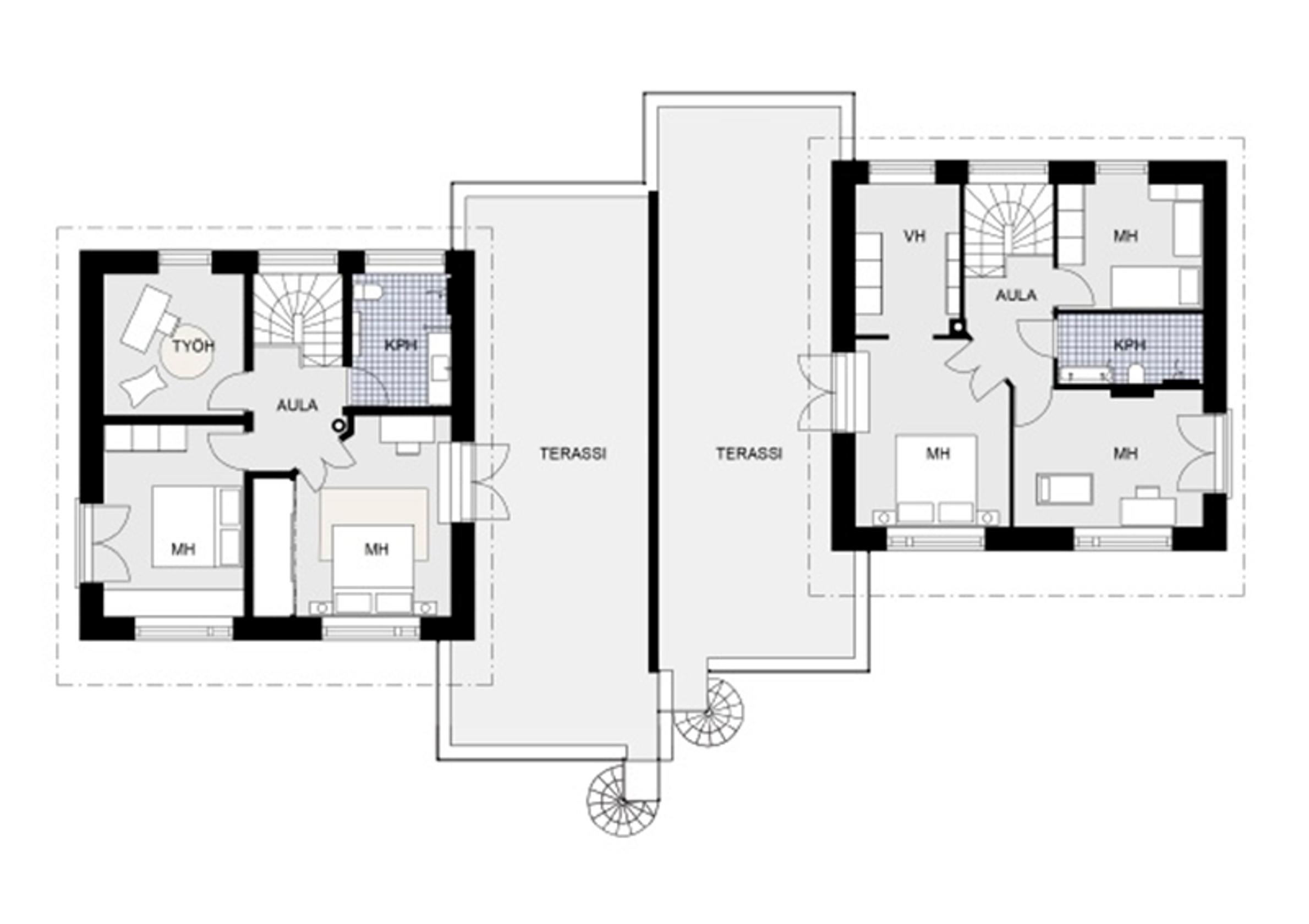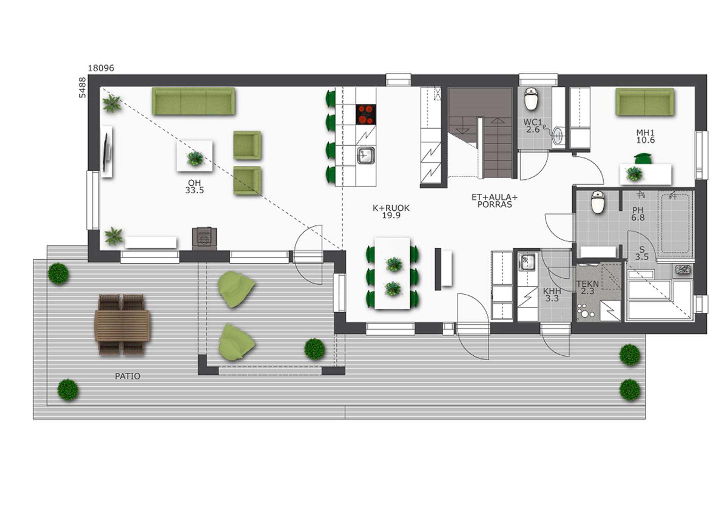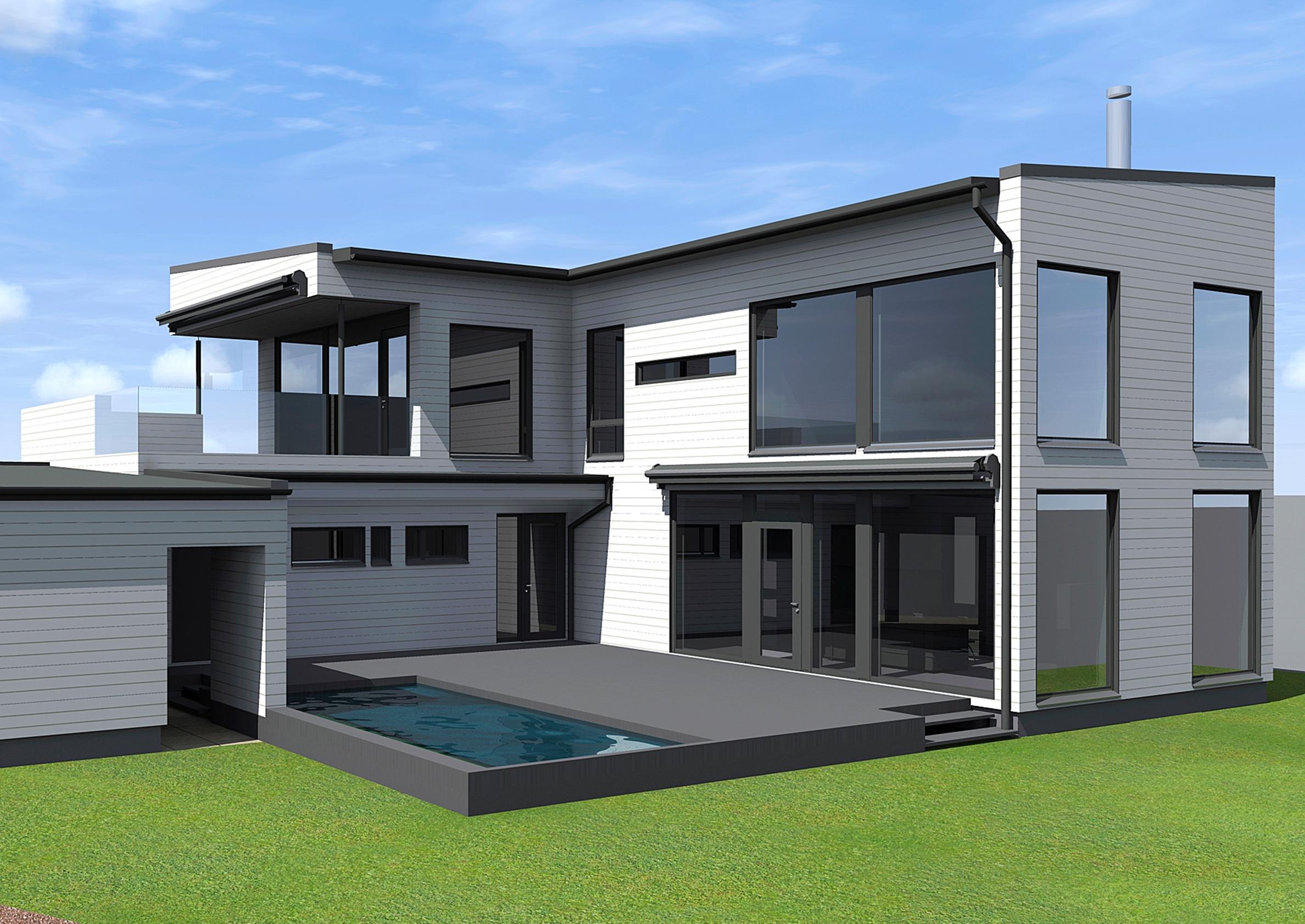 Erityistä: Arkkitehtuuriltaan selkeälinjaisen ja modernin talon sydän on keittiön, ruokailutilan ja korkean olohuoneen muodostama tilakokonaisuus. Suunnittelun lähtökohtana oli tehdä terve talo hengittävillä ja hyvän sisäilman takaavilla materiaaleilla sekä rakenteilla. Asuintilojen lisäksi talosta löytyy perheen äidin yrityksen työtilat.