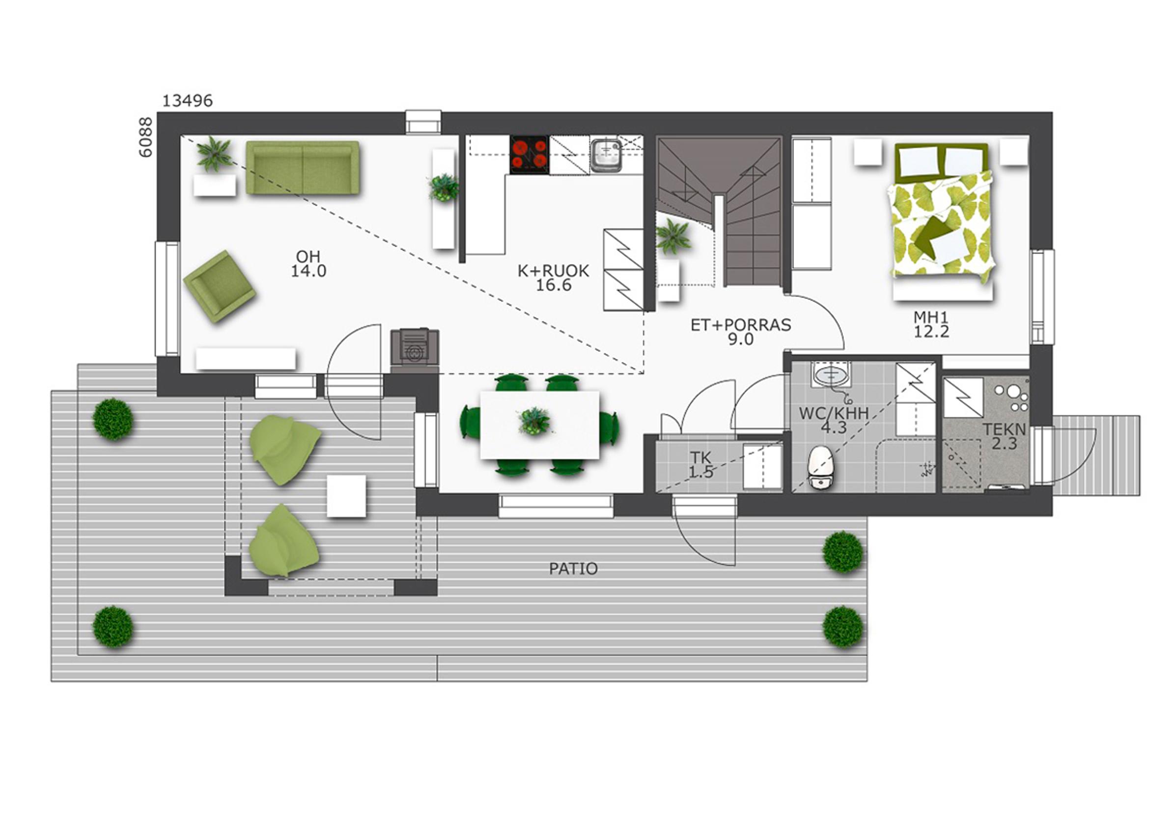 Näytteilleasettaja: Vivola Arkkitehti: Arkkitehtitoimisto Tapani Takkunen Energialuokka: B E-luku: 116 Arvioitu lämmitysenergiankulutus (kWh/vuosi): 6 721 Runkomateriaali: Ristiinlaminoitu massiivipuu (CLT) Lämmitysjärjestelmä: maalämpö
